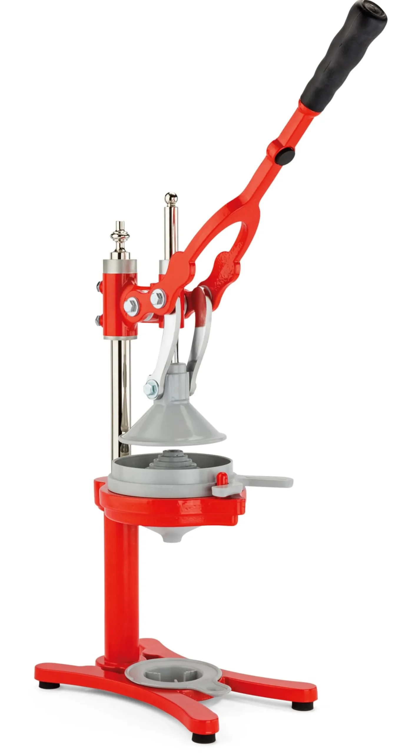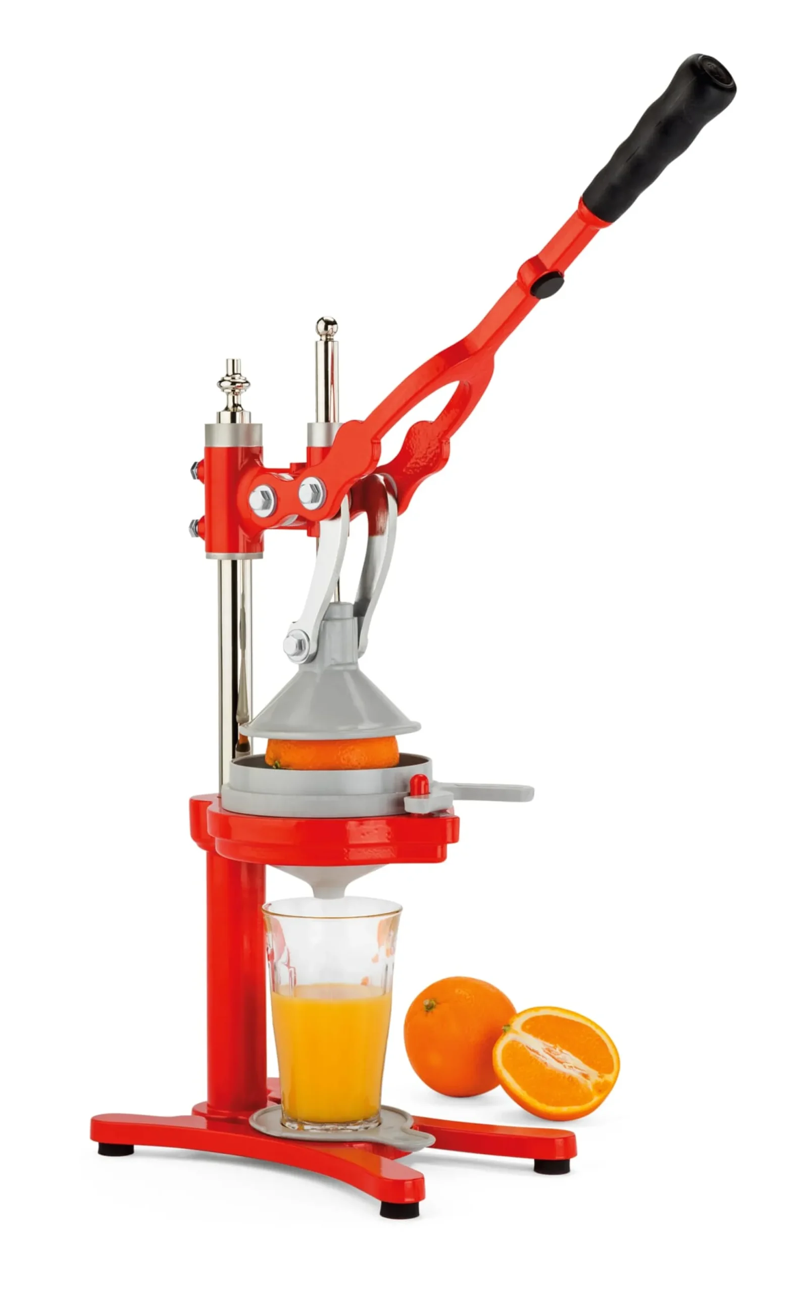 Ähnlichkeiten mit einem Bohrmaschinenständer seien nicht ausgeschlossen, bemerkte vor Jahren einmal ein Kunde von uns über die Hadarit aus Israel. Das verwundert kaum, stammt ihr Vorbild doch tatsächlich aus dem Werkstattzusammenhang. Die Hadarit bewältigt sogar Granatäpfel, nimmt es aber desgleichen spielend mit Orangen und Grapefruit auf. Straßenhändler in Tel Aviv und in anderen israelischen Städten haben sie quasi rund um die Uhr und ständig im Einsatz. Die starke Kniehebelmechanik mit dem rutschfesten Silikon-Handgriff funktioniert spielfrei und wird so übersetzt, dass sich mit geringem Aufwand eine hohe Presskraft erzeugen lässt. Lediglich die Teile, die mit Fruchtfleisch und -saft in Berührung kommen, bestehen aus Polyamid – das Gestell wird aus schwerem Gusseisen gemacht. Der Presskegel kann entnommen und in der Spülmaschine gereinigt werden.
