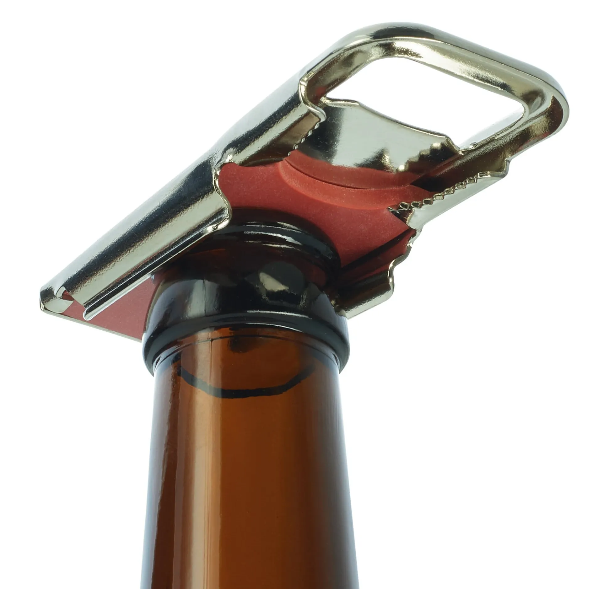 Sein Name ist Programm: Der „Hermetus“, der auch als klassischer Flaschenöffner zu gebrauchen ist, verschließt einmal geöffnete Kronkorken-Flaschen luftdicht – geöffnete Getränke bleiben mit seiner Hilfe länger spritzig und frisch. Und nicht etwa nur Kronkorken lassen sich mit seiner Hilfe lösen, sondern auch Schraubdeckel – sein kurzer Hebel ermöglicht eine effektivere Kraftübertragung.