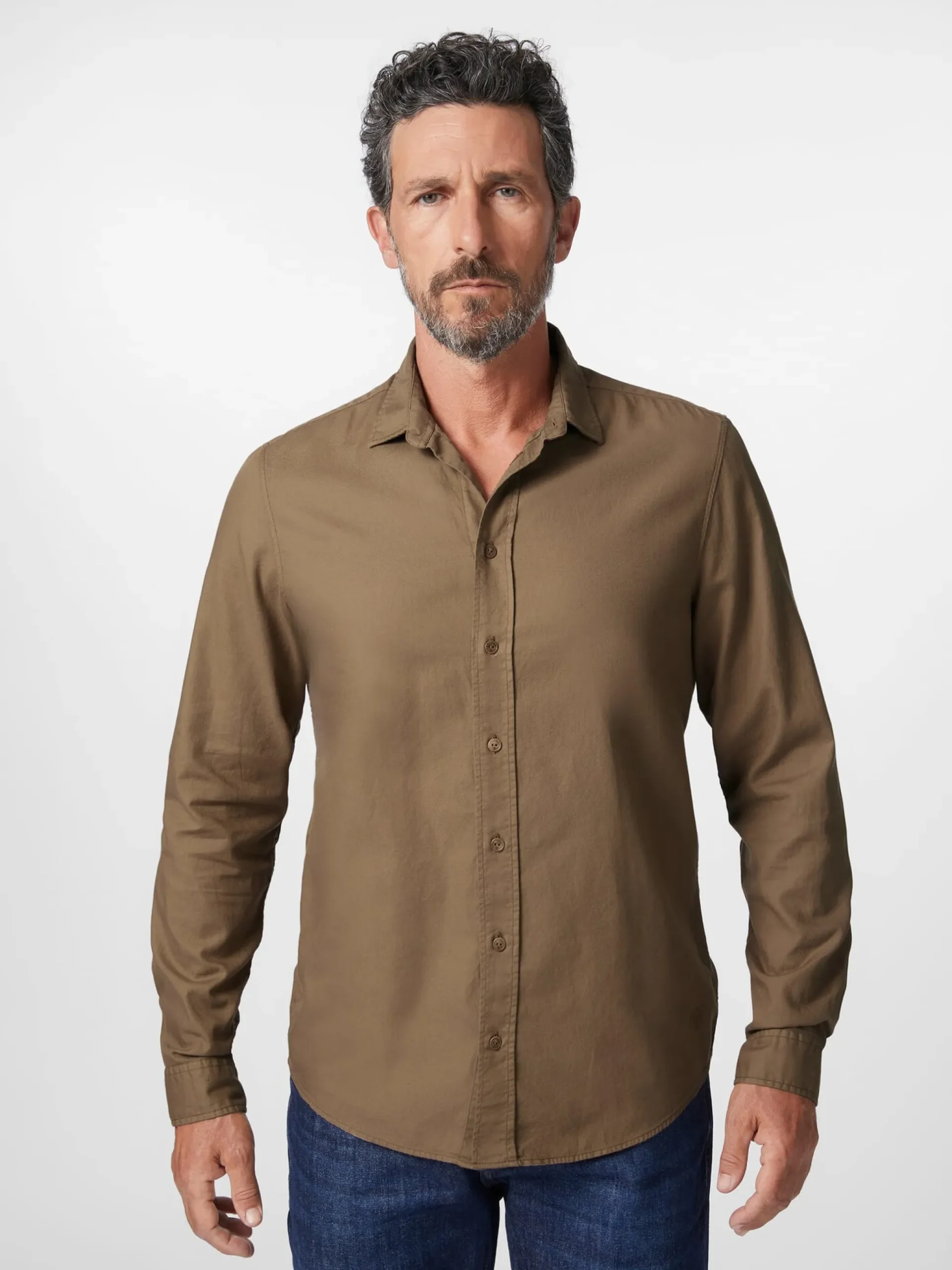 Der griffige Stoff dieses Hemds ist in Leinwandbindung gewebt, was ihm eine feine plastische Oberfläche gibt. Genauer gesagt ist es ein Piqué, dessen markante Struktur sowohl in sportlichen wie in eleganteren Kombinationen gut zur Geltung kommt. Der Schnitt des Hemdes ist geradlinig, mit Kentkragen, abgesetzter Knopfleiste und ohne Brusttasche. Der Rumpfsaum ist gerundet.
