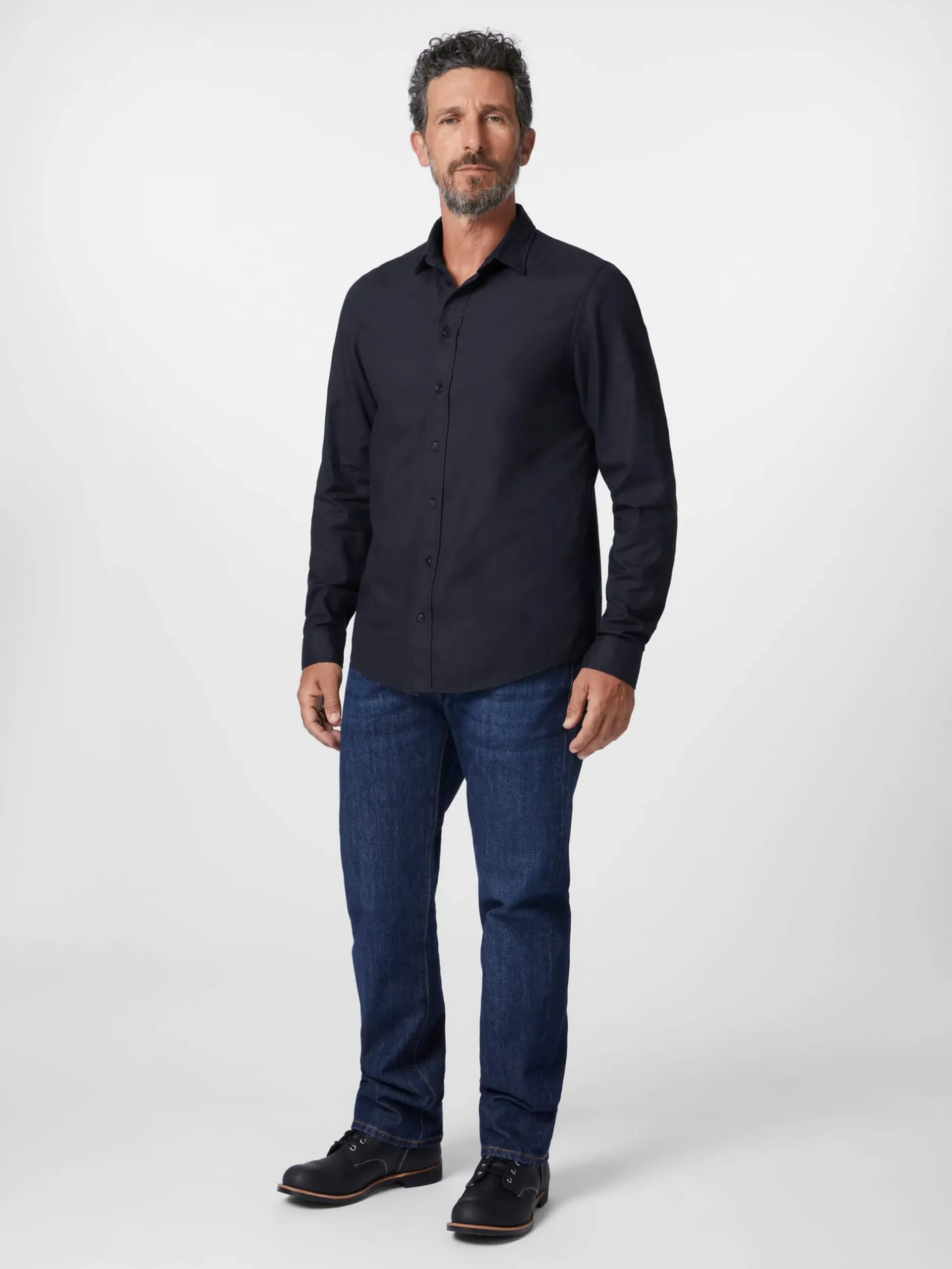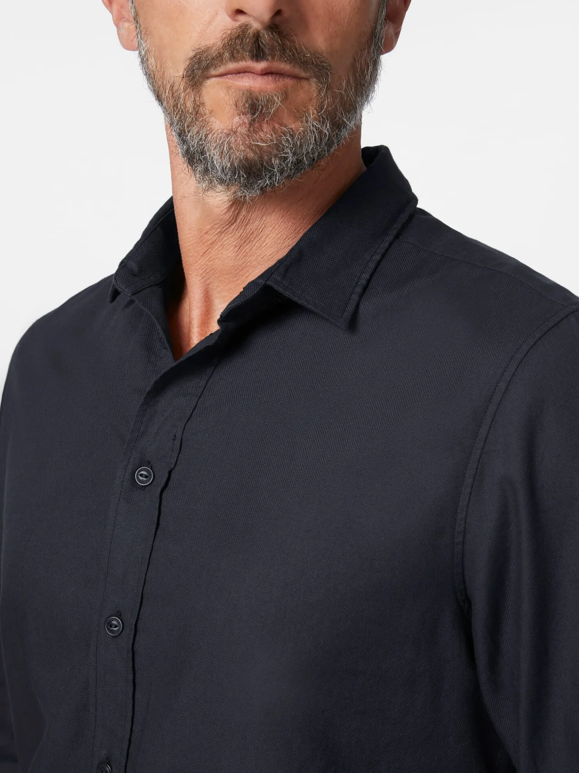 Der griffige Stoff dieses Hemds ist in Leinwandbindung gewebt, was ihm eine feine plastische Oberfläche gibt. Genauer gesagt ist es ein Piqué, dessen markante Struktur sowohl in sportlichen wie in eleganteren Kombinationen gut zur Geltung kommt. Der Schnitt des Hemdes ist geradlinig, mit Kentkragen, abgesetzter Knopfleiste und ohne Brusttasche. Der Rumpfsaum ist gerundet.