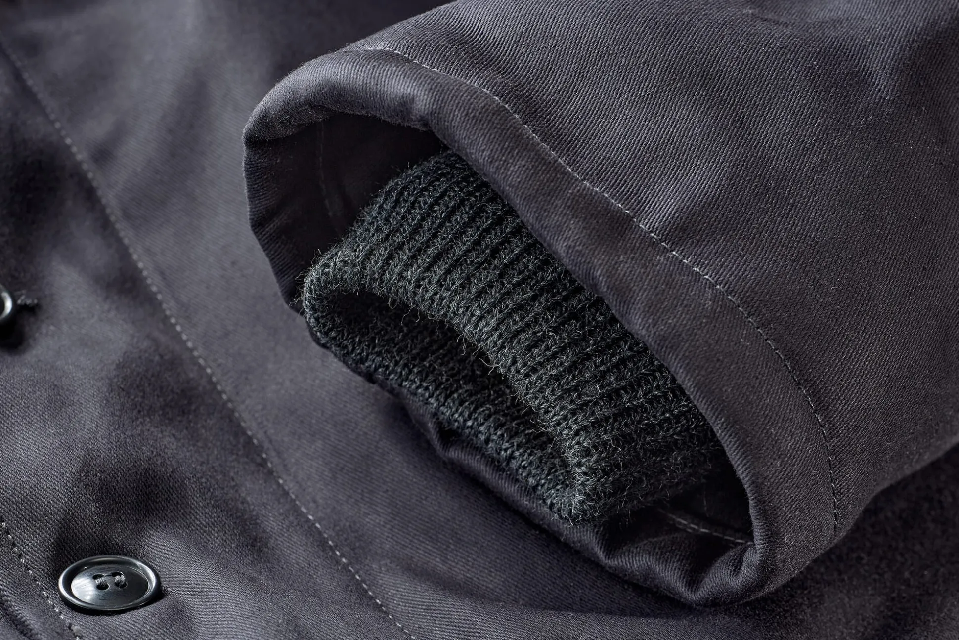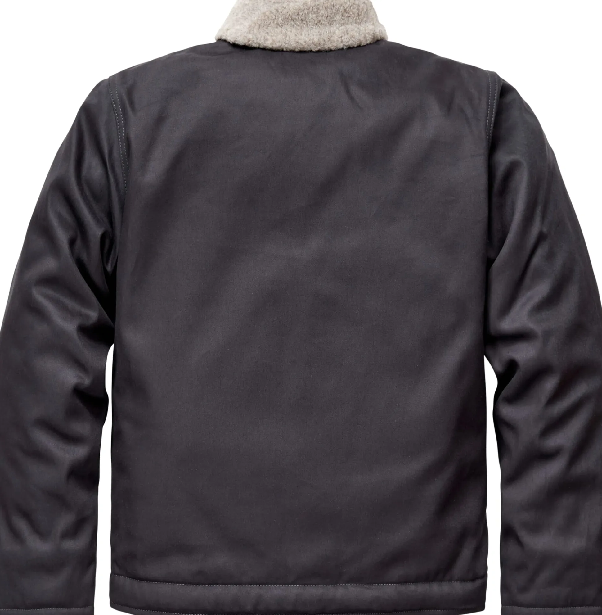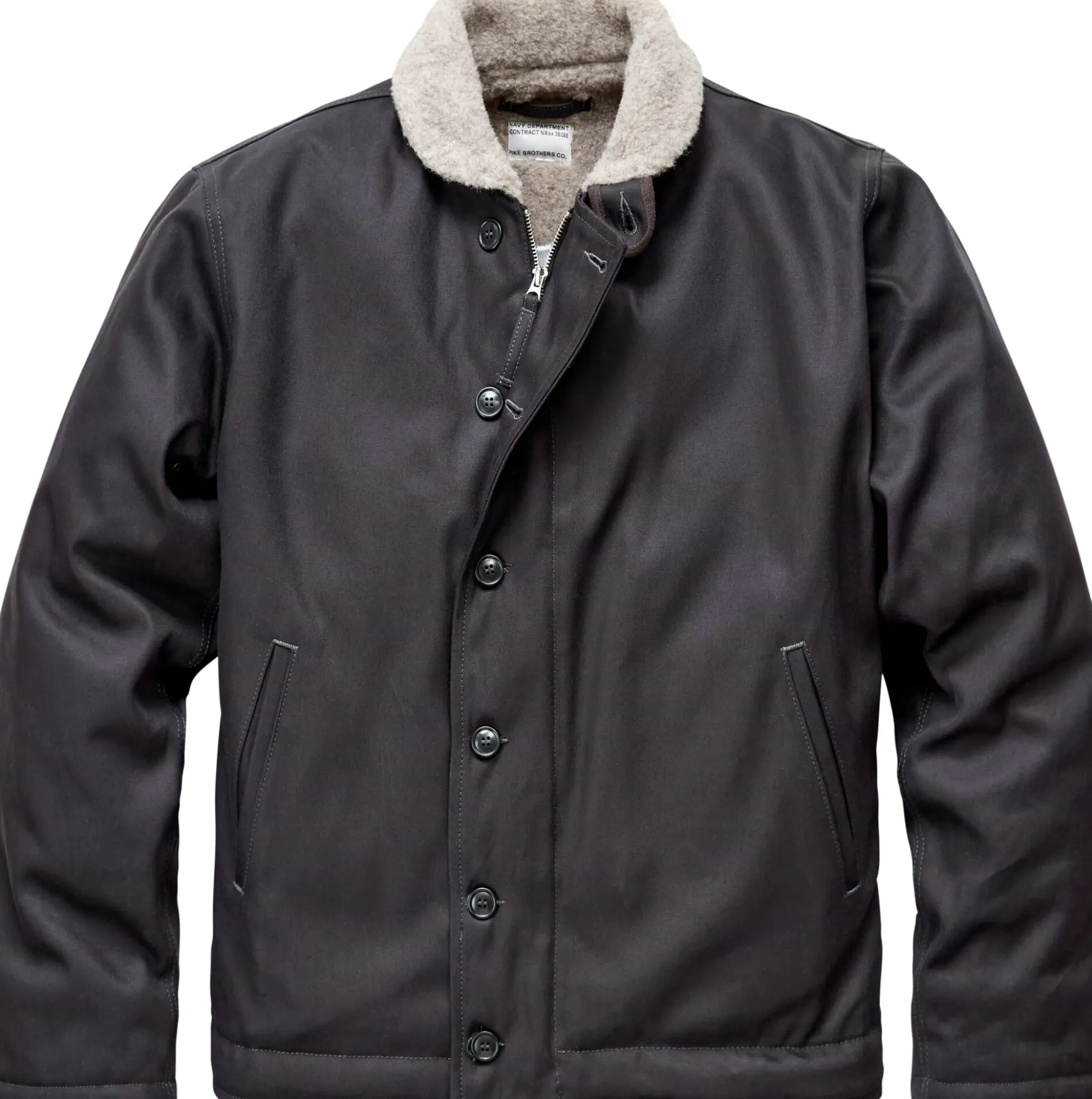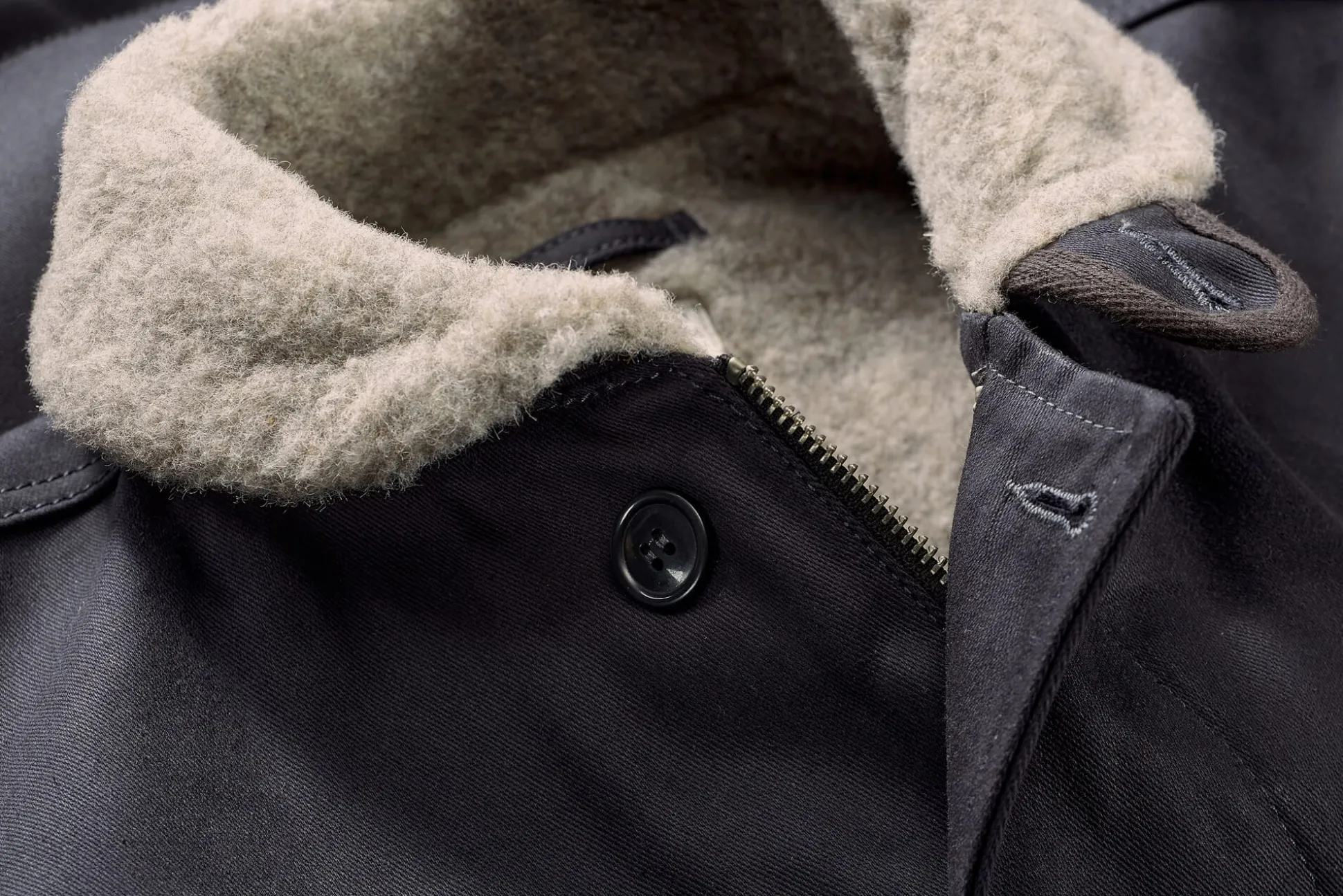 Auf fast allen Weltmeeren hat sich dieses Deckjacket nach amerikanischem Vorbild bewährt. Pike Brothers hat die Jacke aus den 1940er Jagren neu aufgelegt. Der Oberstoff besteht aus doppelseitigem Elephant Skin, einem kräftigen, dicht gewebten Baumwollstoff aus einer deutschen Weberei. Darunter liegt ein voluminöses, wärmendes Wollfutter. In Summe ergibt dies ein weit geschnittenes Kleidungsstück mit ordentlichem Gewicht. Geschlossen wird die Jacke mit einem Metallreißverschluss – einem amerikanischen Talon-Zipper, dessen Schieber sich, wie bei amerikanischen Reißverschlüssen üblich, auf der rechten Seite der Jacke befindet. Über dem Reißverschluss liegt eine geknöpfte, windabweisende Blende, innenliegende Rundstrickbündchen an den Ärmeln halten auch dort den Wind ab. Ein Tunnelzug mit Kordel und Metallösen am inneren Saum ermöglicht eine moderate Weitenregulierung. Außen ist die Jacke mit zwei Einschubtaschen und innen mit einer Leistentasche mit vertikalem Eingriff ausgestattet.