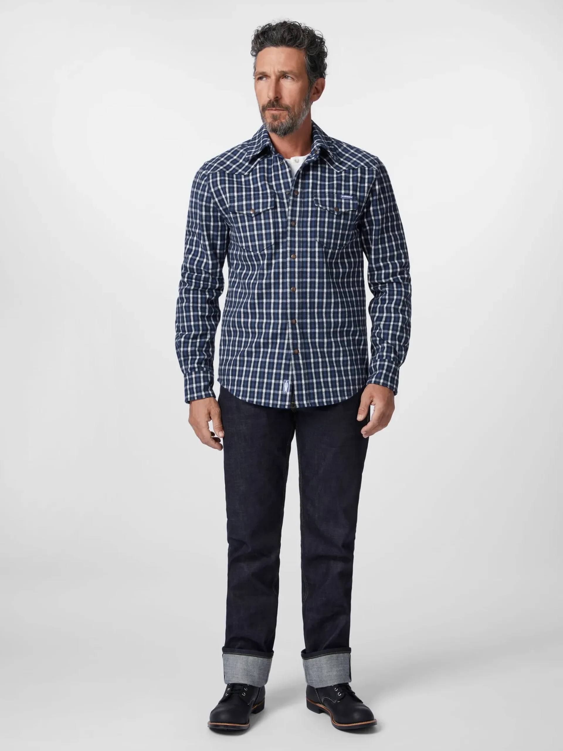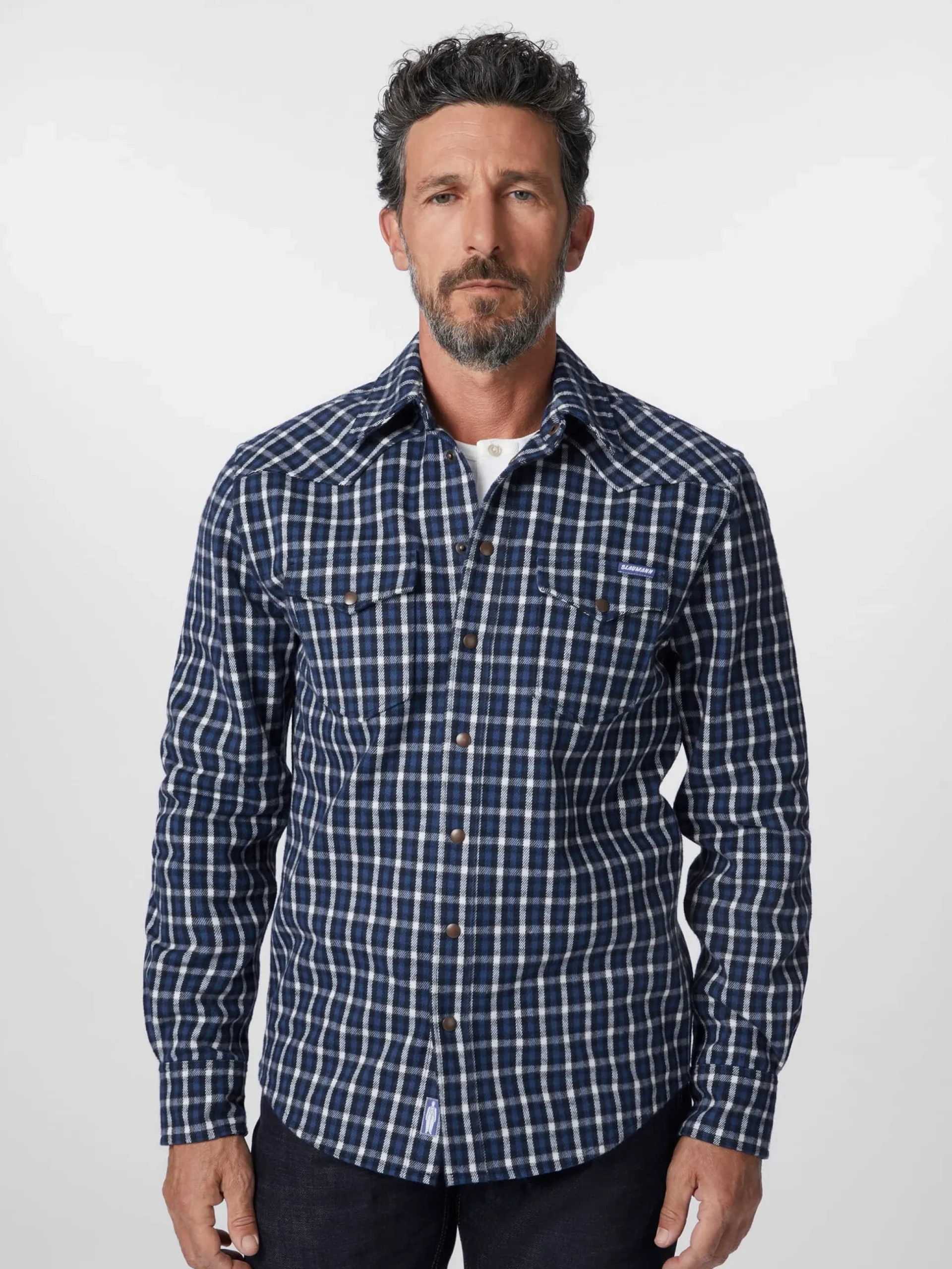 Ein gewichtiger weicher Baumwollflanell ist der Stoff, aus dem dieses Hemd gemacht ist. Passend zur markanten Haptik zeigt er ein farbkräftiges, blau-weißes Karomuster, das in Teilen einen deutlich sichtbaren Köpergrat zeigt. Geschlossen wird das Hemd mit kupferfarbenen Metalldruckknöpfen, zwei mustergetreu aufgesetzte Brusttaschen mit geknöpften Patten nehmen Kleinteile des täglichen Bedarfs auf.