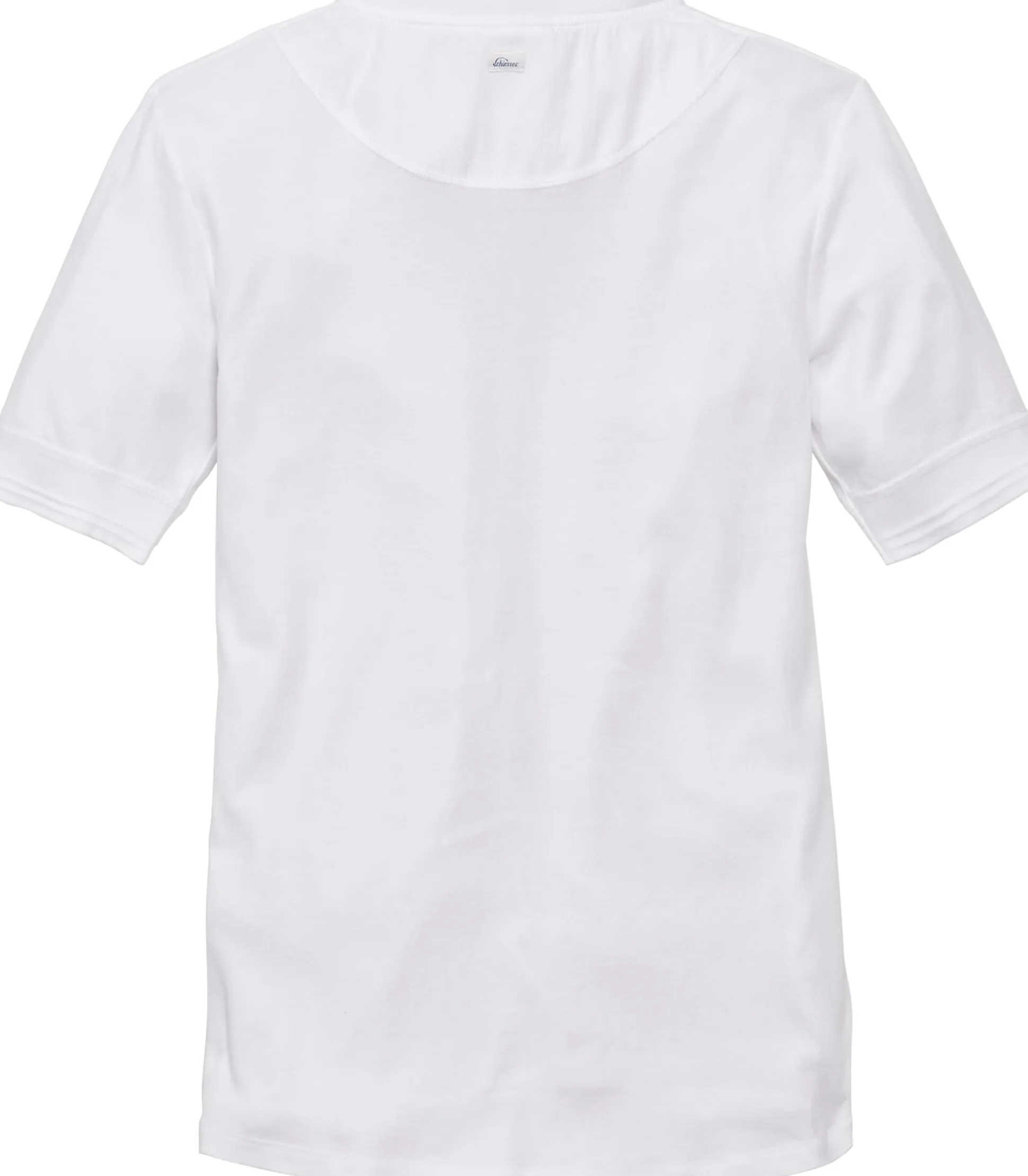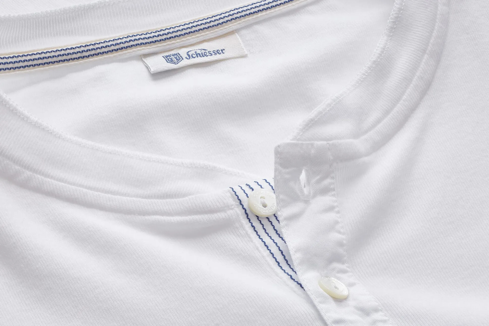 Die Rechts/Rechts-Maschenware für diese als Henley-Shirts bekannten Knopfleistenhemden entsteht auf alten Strickmaschinen. Die angesetzte Knopfleiste ist mit gestreiften Jacquardbändchen verstärkt. Bei dem Unterhemd, das sich auch als T-Shirt zur Jeans tragen lässt, sorgt ein schmaler Kragen mit abgekettelter Außenkante aus Feinripp für guten Schluss am Hals, die Ärmel werden von flach angesetzten Rippenbündchen abgeschlossen. Die Nackenpartie ist mit einem Baumwollbesatz untersteppt.
