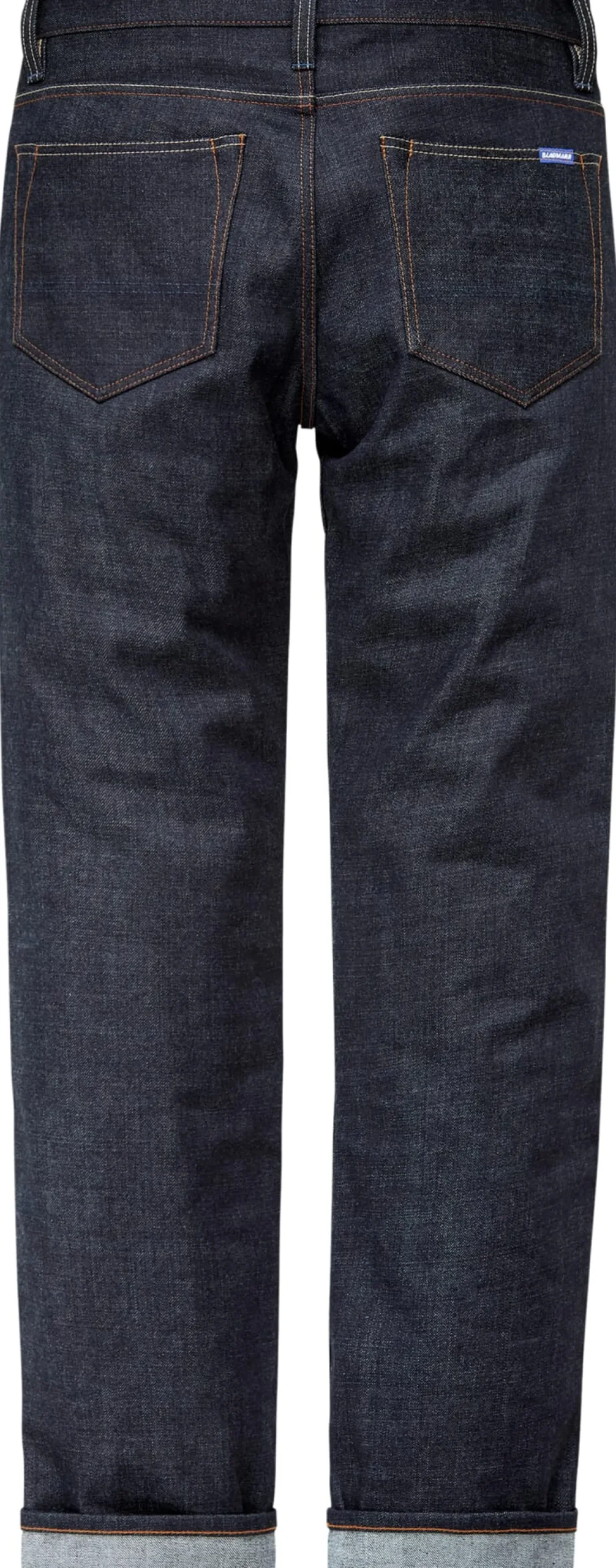 Anlässlich des zehnjährigen Jubiläums hat Blaumann diese Jeans aufgelegt, die der bewährten Blaumann-Qualität noch einmal die Krone aufsetzt. Das beginnt beim Stoff, einem festen und schweren 15-oz-Raw-Denim, der von Kuroki in Japan, einer der ersten Adressen für solche Stoffe, exklusiv für Blaumann gewebt wird. Er besteht aus kontrolliert biologisch angebauter Baumwolle. Die Knöpfe und Niete aus Kupfer sind sämtlich von Hand eingeschlagen – ein zeitraubendes Verfahren, da für jeden Niet mehrere Schläge nötig sind. Der Beinverlauf ist eher gerade, wodurch die Hose auch mit höheren Stiefeln kombiniert werden kann. Am Umschlag ist die echte Webkante, die Selvage, in den Blaumann-Farben Blau und Weiß sichtbar. Die Jeans wird mittels Knopfleiste geschlossen. Sie ist mit zwei Seitentaschen mit schrägen Eingriffen, zwei aufgesetzten Gesäßtaschen und einer kleinen Münztasche ausgestattet. Breite Gürtelschlaufen erlauben auch die Verwendung stattlicherer Gürtel. Und selbstverständlich gilt auch für die Jubiläumsjeans: Die Tascheneingriffe sind ganz klassisch mit Nieten verstärkt, um ein Einreißen im Gebrauch zu vermeiden. Bei den Gesäßtaschen geschieht dies verdeckt, um Sitzmöbel vor Verkratzen oder Beschädigung zu schützen. Dieses aufwendige, in den 1930er Jahren eingeführte Verfahren wird heute kaum noch angewandt, da die in der Industrie üblichen Taschenautomaten dazu nicht in der Lage sind. Und weil die Taschen im täglichen Gebrauch stark beansprucht werden, verstärkt Blaumann die unteren Bereiche mit einem zusätzlichen Taschenfutter, das bei dieser Jeans einen Jubiläumsdruck zeigt.