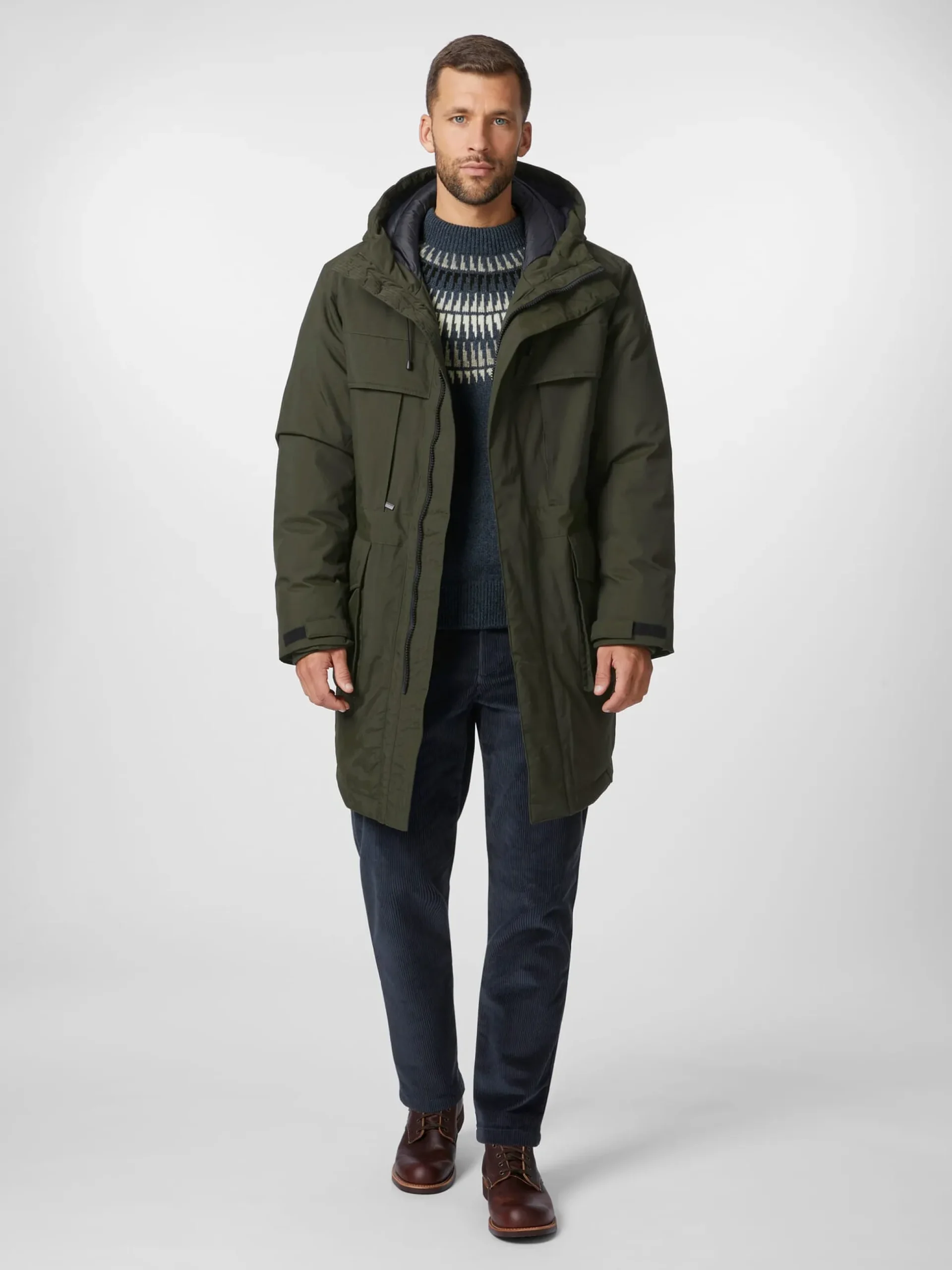 Oberstoff, Futter und Füllung dieses wärmenden Parkas stehen ganz im Zeichen von Recycling. Der Oberstoff ist ein sogenannter Apex Canvas™, der dicht gewebt, dabei atmungsaktiv, wind- und wasserabweisend ist. Er besteht ebenso wie das abgesteppte Futter aus Recycling-Polyamid, die wattige Sugenro®-Füllung ist aus Recycling-Polyester. Auch funktional überzeugt das durchdachte Stück: Der markante Zweiwegereißverschluss lässt sich hoch schließen. Über ihm liegt eine breite windabweisende Blende mit verdeckten Magnetknöpfen. Gut anliegende Strickbündchen in den Ärmelöffnungen halten wirksam Wind und Kälte ab, die Weite der Ärmelöffnungen lässt sich zusätzlich über verstellbare Riegel mit Klettverschluss anpassen. Eine innenliegende Gummikordel mit Kordelstoppern auf Taillenhöhe erlaubt eine Weitenanpassung, die Öffnung der Kapuze lässt sich ebenfalls mittels Gummikordel im Tunnelzug und Kordelstoppern regulieren. Etliche Taschen bieten Platz für Kleinteile des täglichen Bedarfs: Außen befinden sich zwei große aufgesetzte Pattentaschen mit verdeckten Magnetknöpfen, zwei schräge Eingrifftaschen sowie zwei eingesetzte Brusttaschen mit senkrechtem, verdecktem Reißverschluss. Innen kommen noch zwei Taschen mit senkrechtem, nahtverdecktem Reißverschluss sowie eine aufgesetzte Tasche mit Patte und Klettverschluss hinzu.