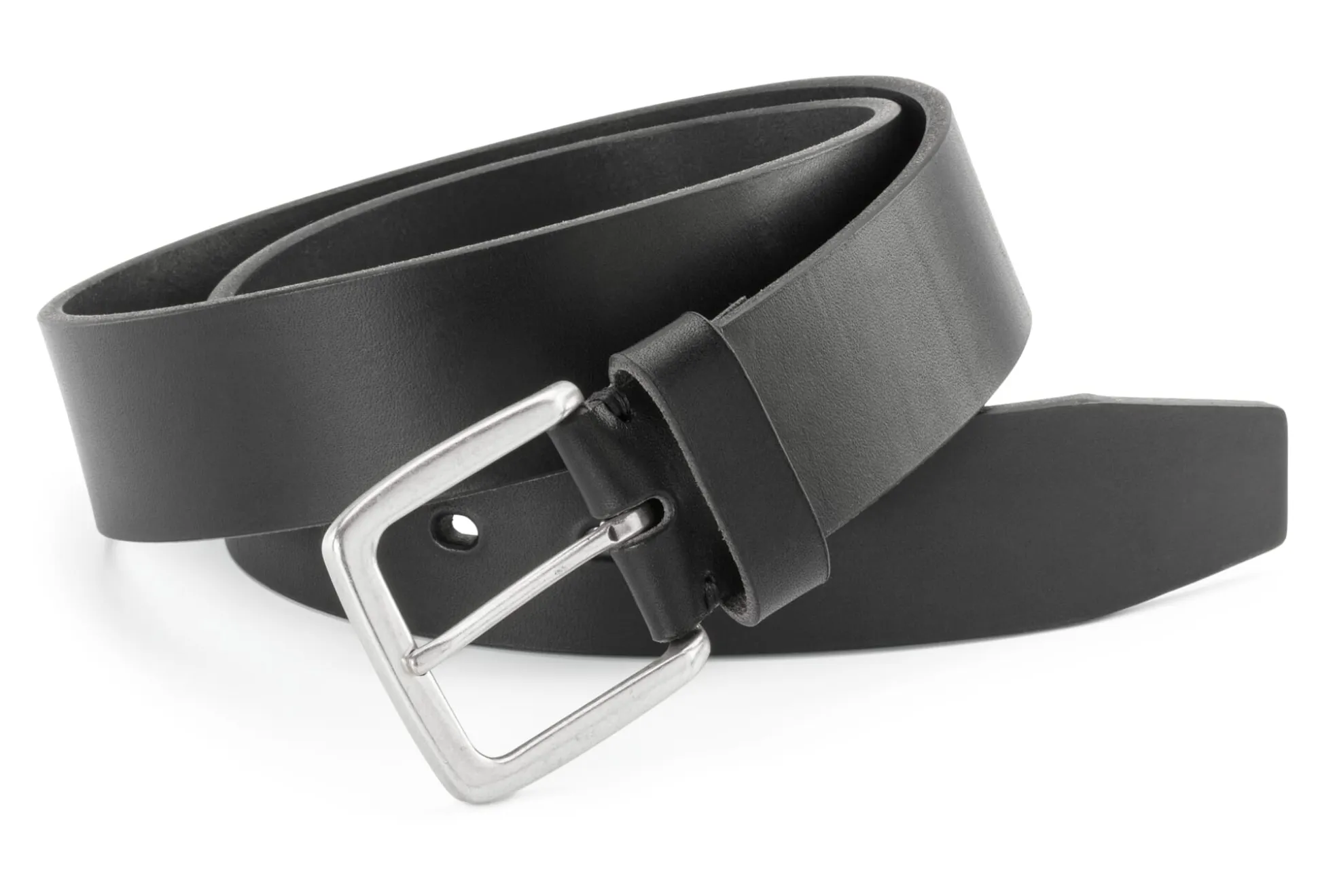 Offenkantig geschnittener, einlagiger Gürtel, der mit der Zeit eine besonders schöne Patina erhält. Er wird aus vegetabil gegerbtem Rindleder deutscher Herkunft gefertigt, das sich durch Strapazierbarkeit und Langlebigkeit auszeichnet. Diese Eigenschaften erlangt das „Geschirrleder“ vor allem durch eine intensive Fettung. Die massive Messingschließe ist von Hand mit Sattlerstich angenäht, die Gürtelkanten sind mit Wachs ausgeputzt.