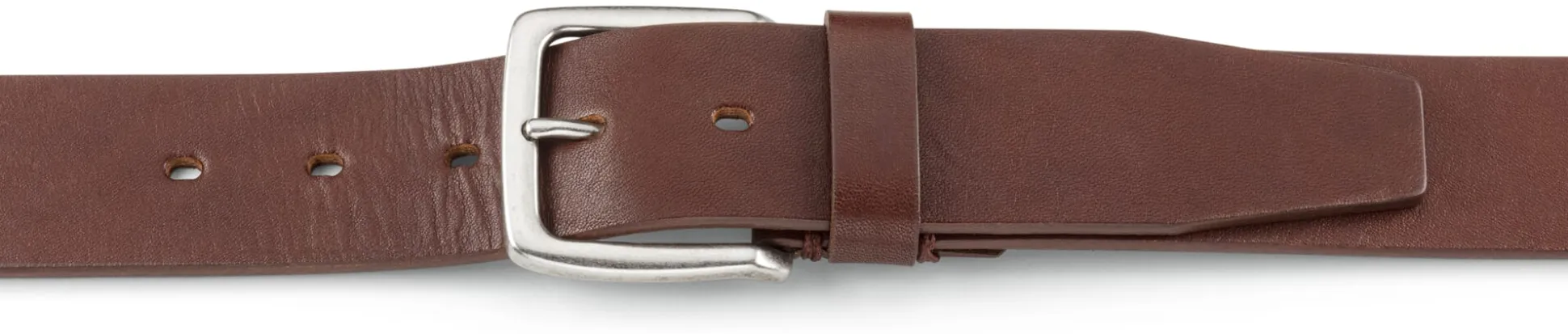 Das Leder für diesen einlagigen Gürtel bezieht Schröder von der Lederfabrik August Renz in Tuttlingen. Der 1888 gegründete Familienbetrieb in fünfter Generation setzt im Besonderen auf hochwertige pflanzlich gegerbte Leder – von denen sich einige seit Jahrzehnten auch für Einlagen und andere orthopädische Zwecke bewährt haben. Das Leder für diesen Gürtel ist ein kräftiges, vier bis fünf Millimeter starkes Rindleder aus den Croupons, den wertvollsten Teilen aus dem Rückenbereich der Lederhaut, die sich durch Festigkeit, Dichte und Gleichmäßigkeit auszeichnen. Es wurde ganze drei Monate in der Grube gegerbt und bekommt mit der Zeit eine schöne Patina. Dazu passt die mit Sattlerstich angenähte Schließe aus galvanisiertem Messing.