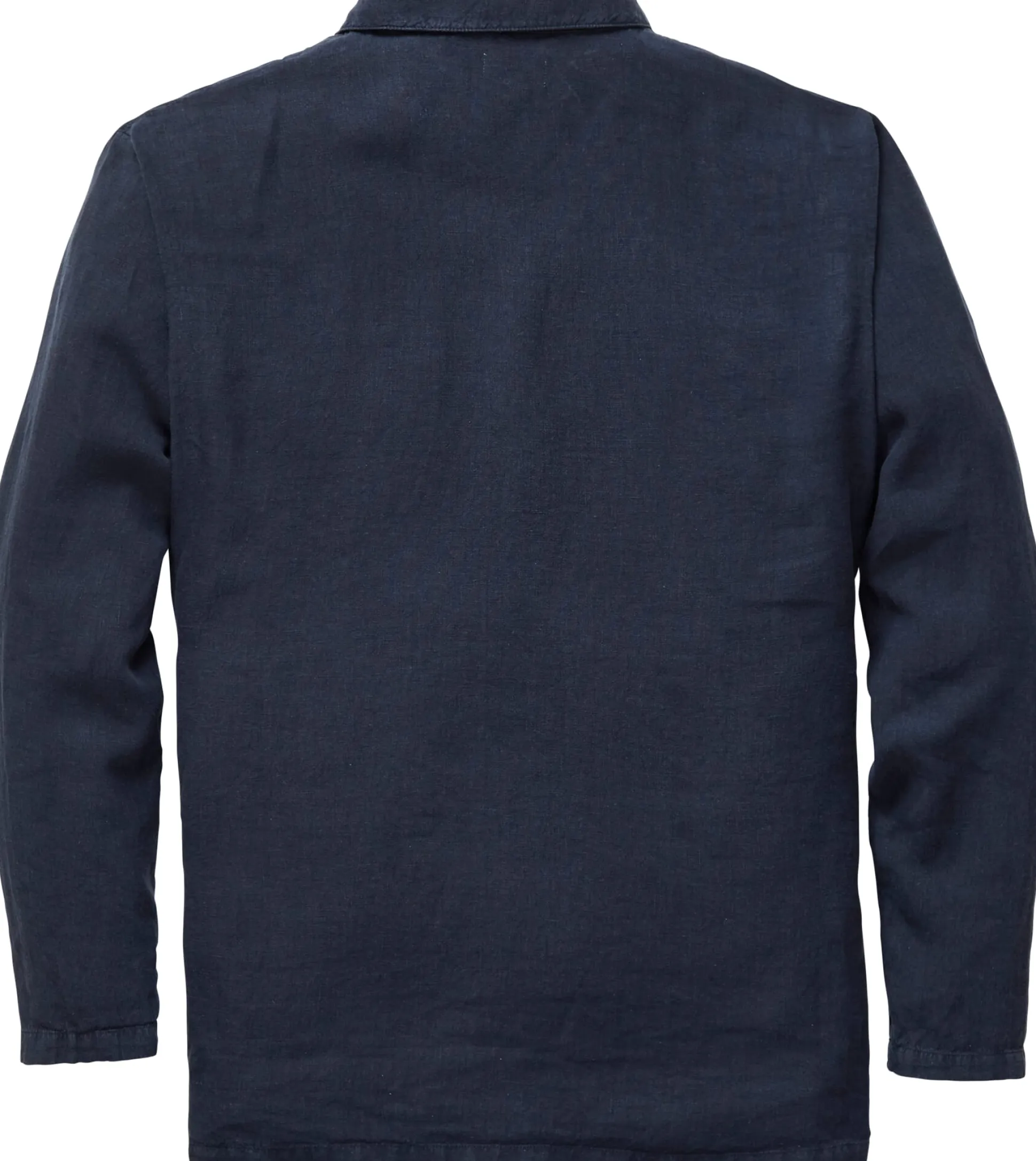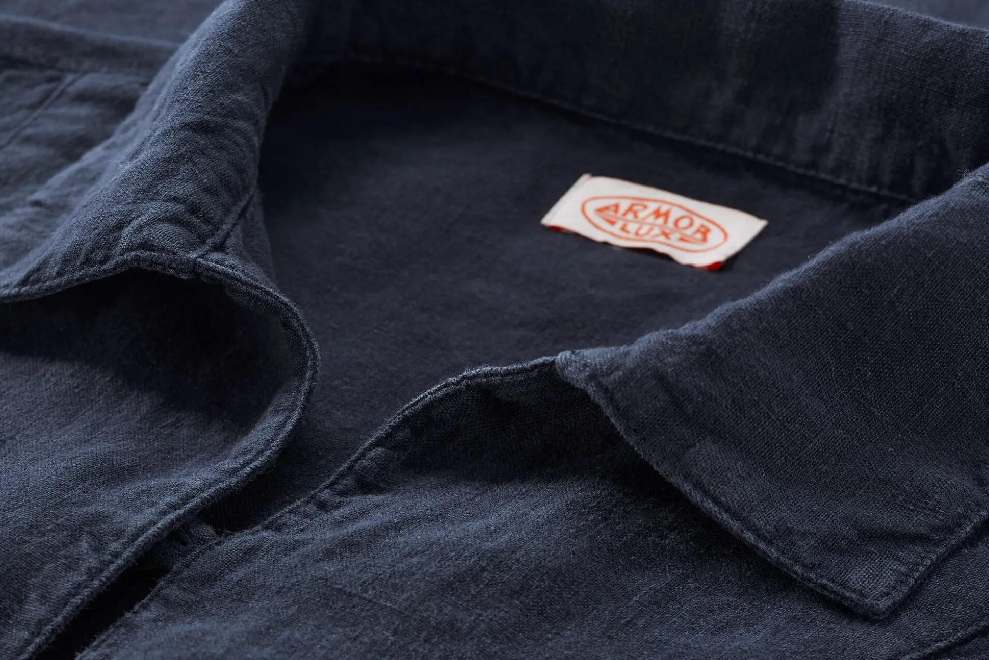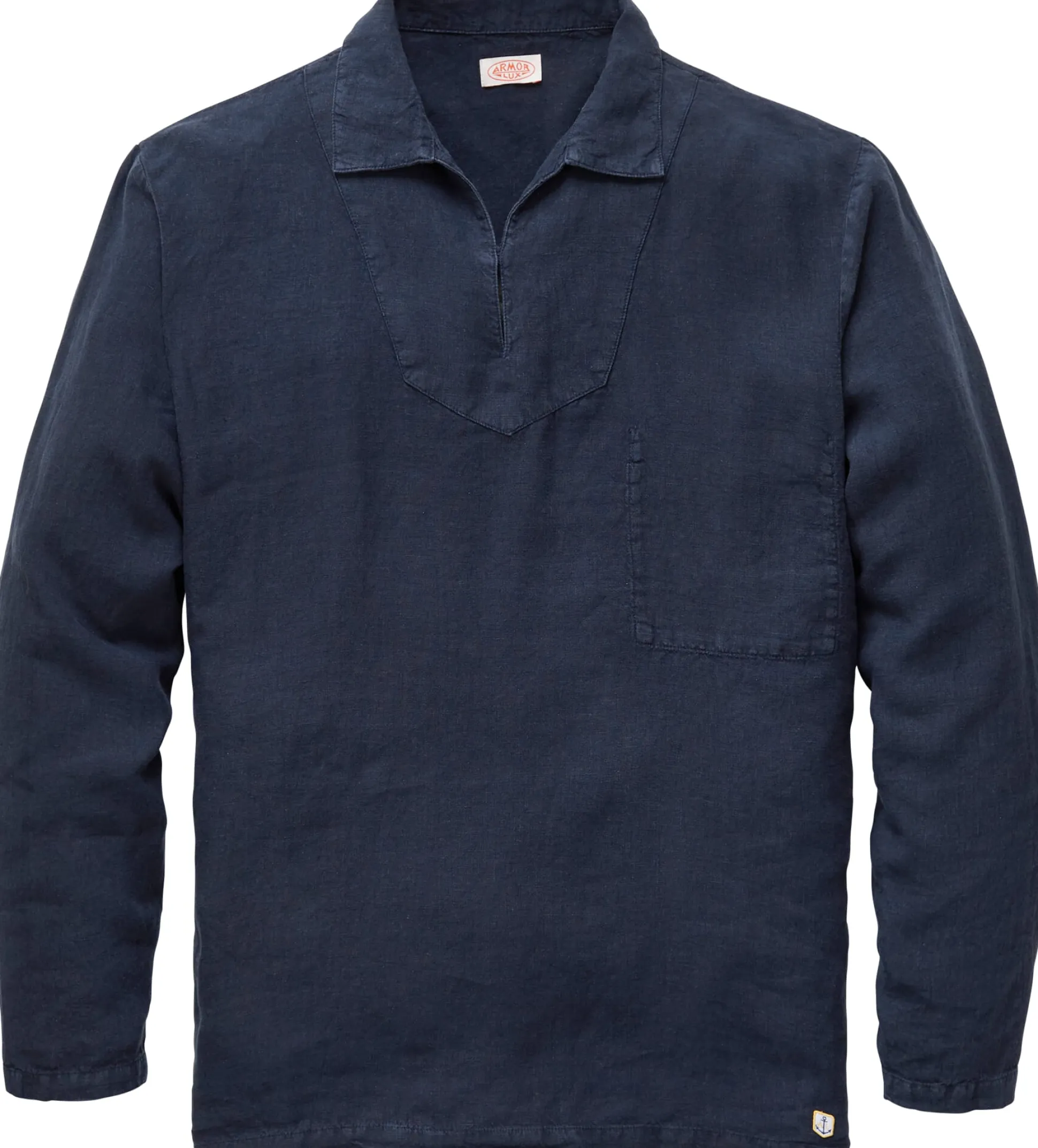 Dieses lässige Schlupfhemd hat die Form einer klassischen Vareuse, was wörtlich übersetzt Hemdbluse heißt, zugleich aber auch das traditionelle Fischerhemd meint. Seinem Ursprung in der Arbeitswelt entsprechend ist das Hemd einfach und funktional – mit einem Einsatz, einem Schlitz und einem umzuschlagenden Kragen. Um bei der Arbeit nirgendwo hängenzubleiben, haben Fischerhemden traditionell keine vorstehenden Knöpfe. So auch hier: Der Knopf, der mitsamt einer Schlaufe den Schlitz am Halsausschnitt schließt, sitzt innen; die Brusttasche liegt ebenfalls innen. Früher wurde solch ein Hemd aus Segeltuchresten geschnitten, was für heutige Verhältnisse unangemessen schwer wäre. Armor lux konfektioniert dieses Schlupfhemd aus gewaschenem Leinen, was dem lässigen Schnitt noch den passenden Used Look hinzufügt.