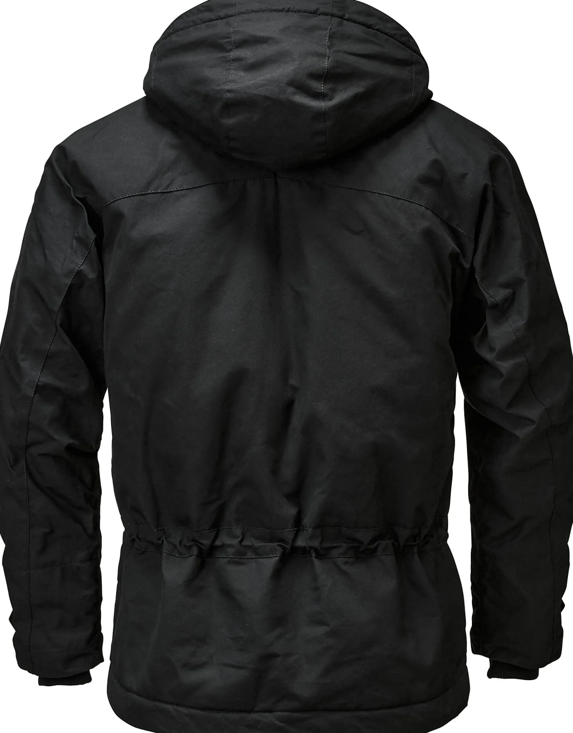 … und auch Kälte kann dem Träger dieser Parkajacke nichts anhaben. Das Obermaterial ist ein moderat gewachstes Baumwolltuch, unter dem eine wärmende Wattierung aus Schurwolle liegt (auch die geräumige Kapuze ist wattiert). Über dem Zweiwegereißverschluss liegt eine windabweisende Blende mit Druckknöpfen; Strickbündchen in den Ärmelöffnungen halten auch dort den Wind fern. Die beiden seitlichen Einschubtaschen sind mit Reißverschlüssen und darüberliegenden knöpfbaren Blenden ausgestattet – hinzu kommt eine Innentasche mit senkrecht angesetztem Reißverschluss. Die Jackenärmel sind mit Cupro, einer seidig-glatten, weichen Zelluloseregeneratfaser gefüttert, was das An- und Ausziehen erleichtert. Tunnelzüge in Taillenhöhe und im Rumpfsaum erlauben eine Weitenanpassung der Jacke, auch die Kapuzenweite lässt sich mittels Tunnelzug regulieren.