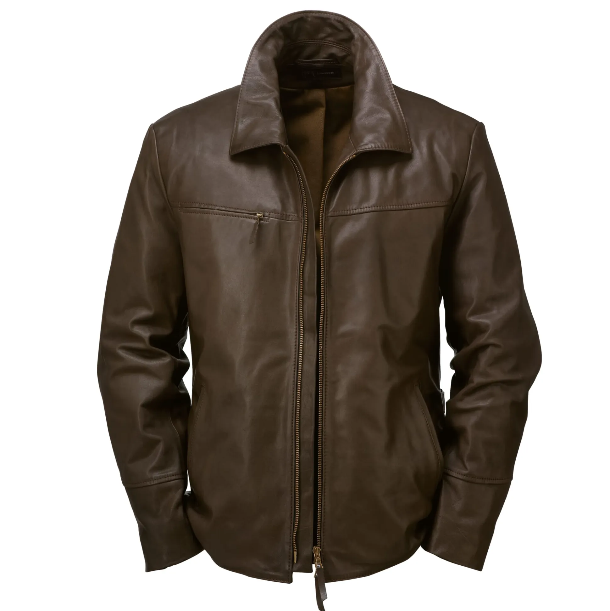 Rindleder (Stärke 1 mm), chromfrei gegerbt. Rumpffutter 100% Baumwolle, Ärmelfutter 100% Viskose. Zwei Paspeltaschen, eine Brusttasche, eine Innentasche. Messingreißverschlüsse. Hergestellt in Polen. Rückenlänge bei Größe 52 = 72,5 cm.