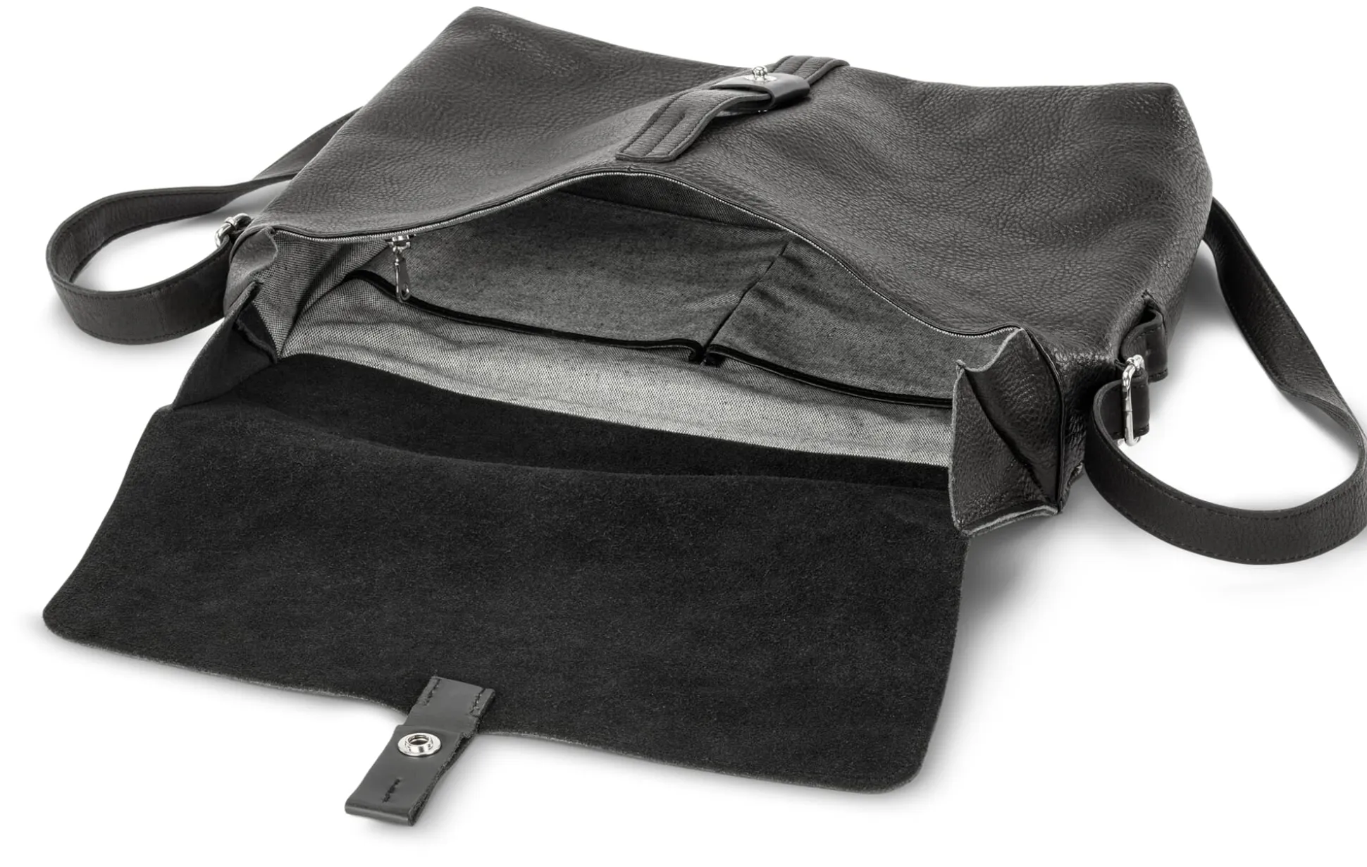 Die Schultertasche aus weichem, vegetabil gegerbtem Rindleder ist im Stil einer Messengerbag gehalten. Wie bei dieser lässt sich das Volumen des Hauptfachs anpassen: Durch den wie ein Lift verschiebbaren Druckknopfverschluss am Riemen kann etwa ein Drittel an Höhe hinzugewonnen werden. So finden neben einem mittelgroßen Ordner und einem 13-Zoll-Notebook noch bequem eine Jacke oder ein kleiner Einkauf darin Platz. Eingearbeitete Seitenkeile gewährleisten auch dann noch guten Schluss des Taschendeckels. Daneben verfügt das mit Baumwollköper gefütterte Hauptfach über zwei Steckfächer und ein Reißverschlussfach. Auf der Rückseite befinden sich ein geräumiges Reißverschlussfach sowie ein weiteres von der Seite vertikal zu öffnendes Reißverschlussfach, das Schlüsselbund oder Telefon bewahrt und schnellen Zugriff darauf gewährt.