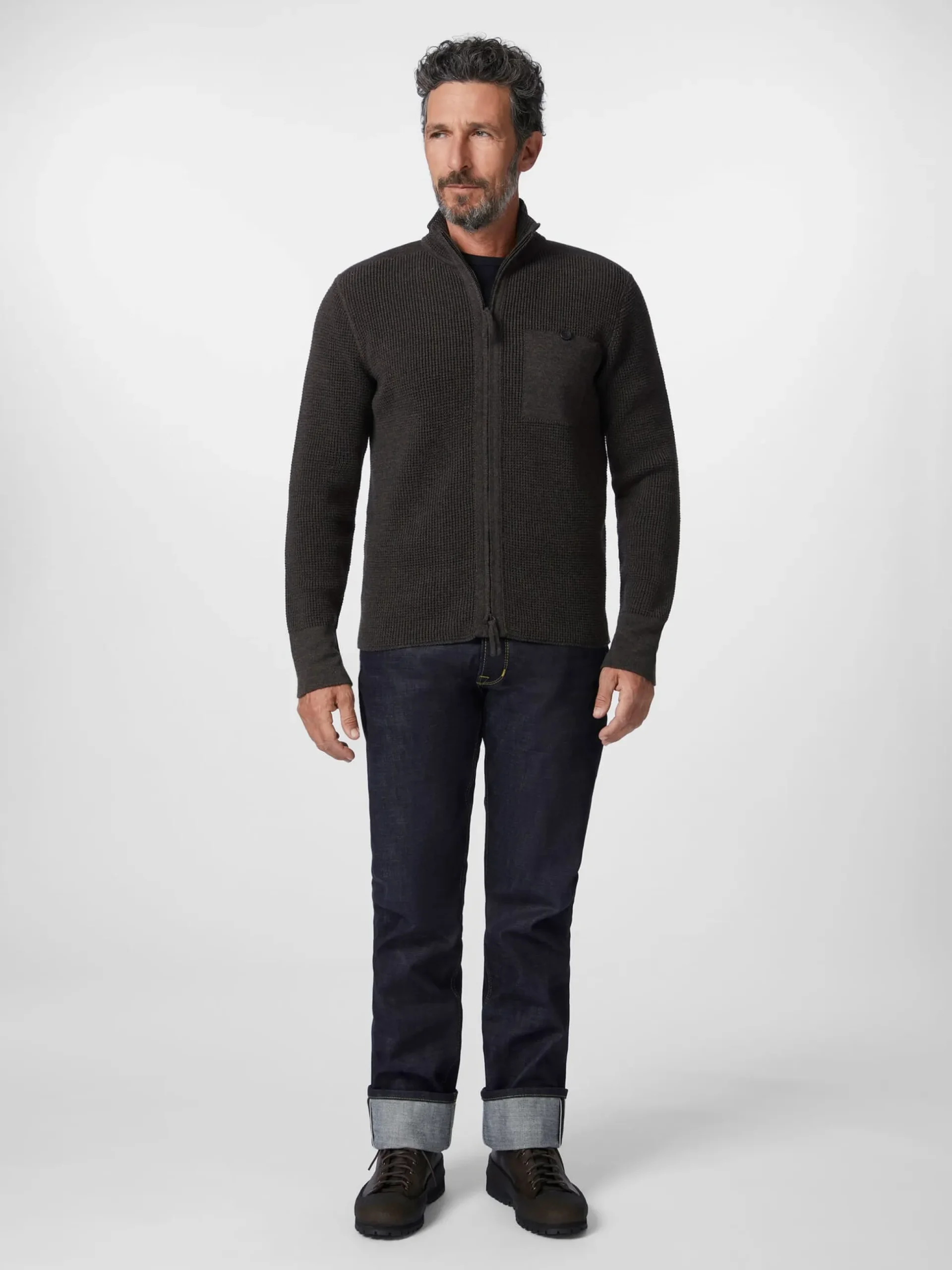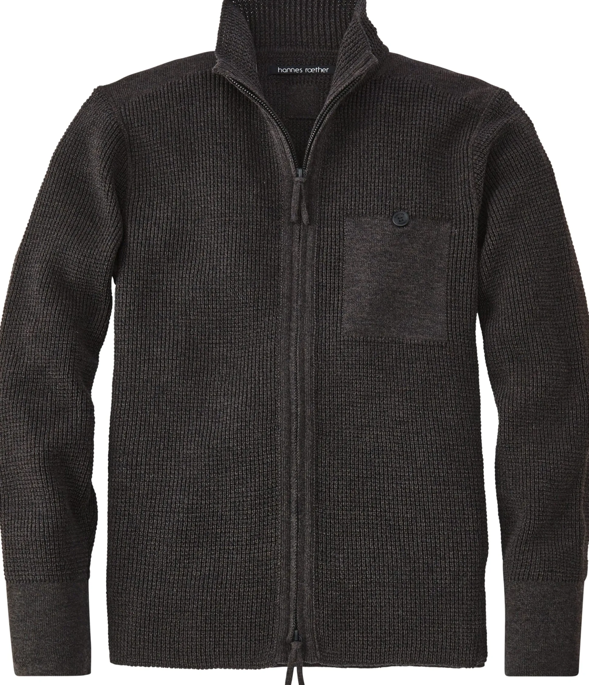 Geradlinige Jacke, deren plastisches und luftiges Gestrick aus weicher und wärmender, extrafeiner Merinowolle besteht. Die Strickjacke ist mit einem Stehkragen ausgestattet, sie wird mit einem sportlichen Zweiwegereißverschluss geschlossen, der vom Gestrick verdeckt wird, wenn die Jacke geschlossen ist. Eine nach außen geknöpfte Innentasche nimmt Kleinteile des täglichen Bedarfs auf. Die Ärmel und der hintere Rumpfsaum schließen mit feinen Rippenstrickbündchen ab.