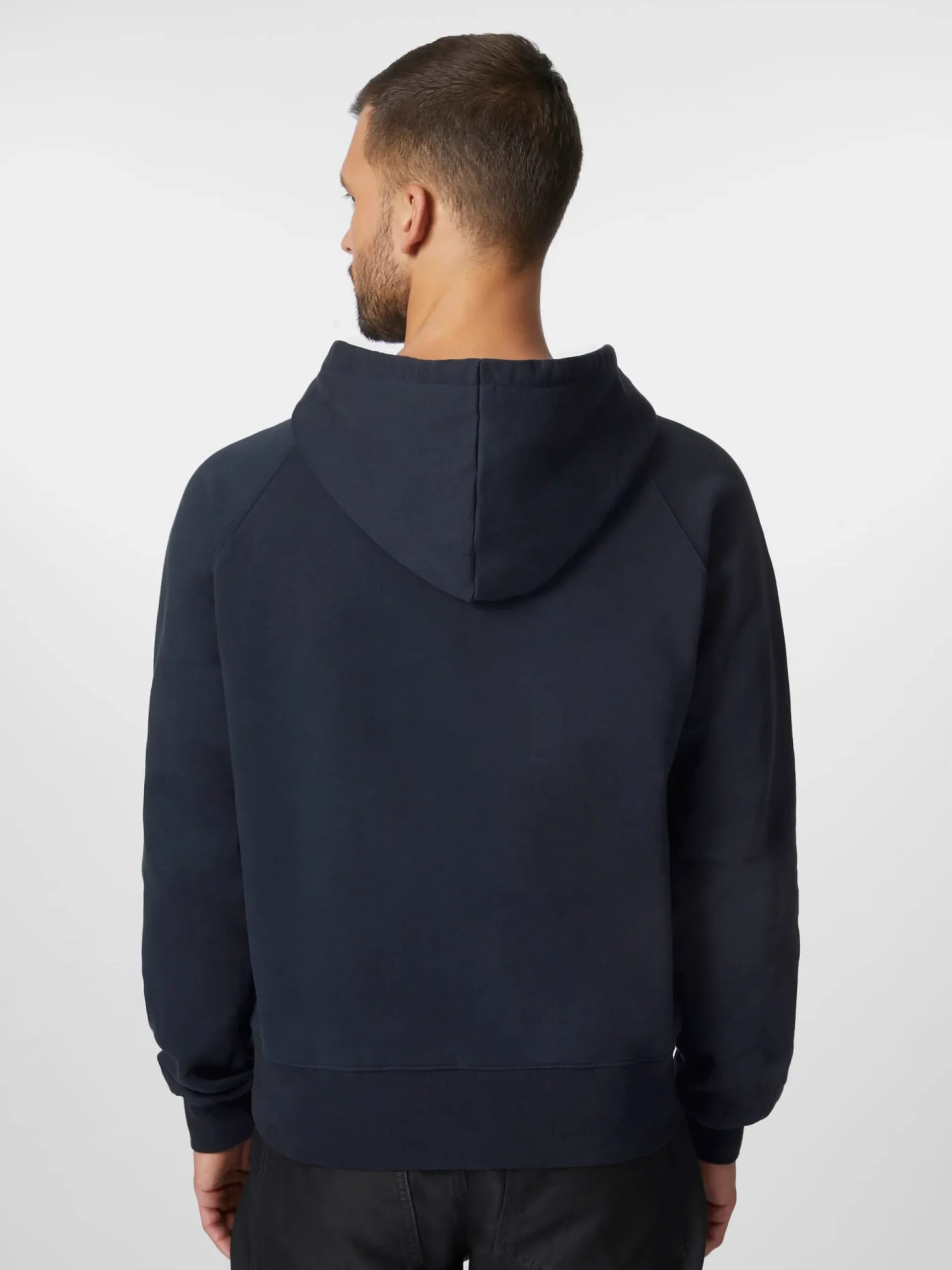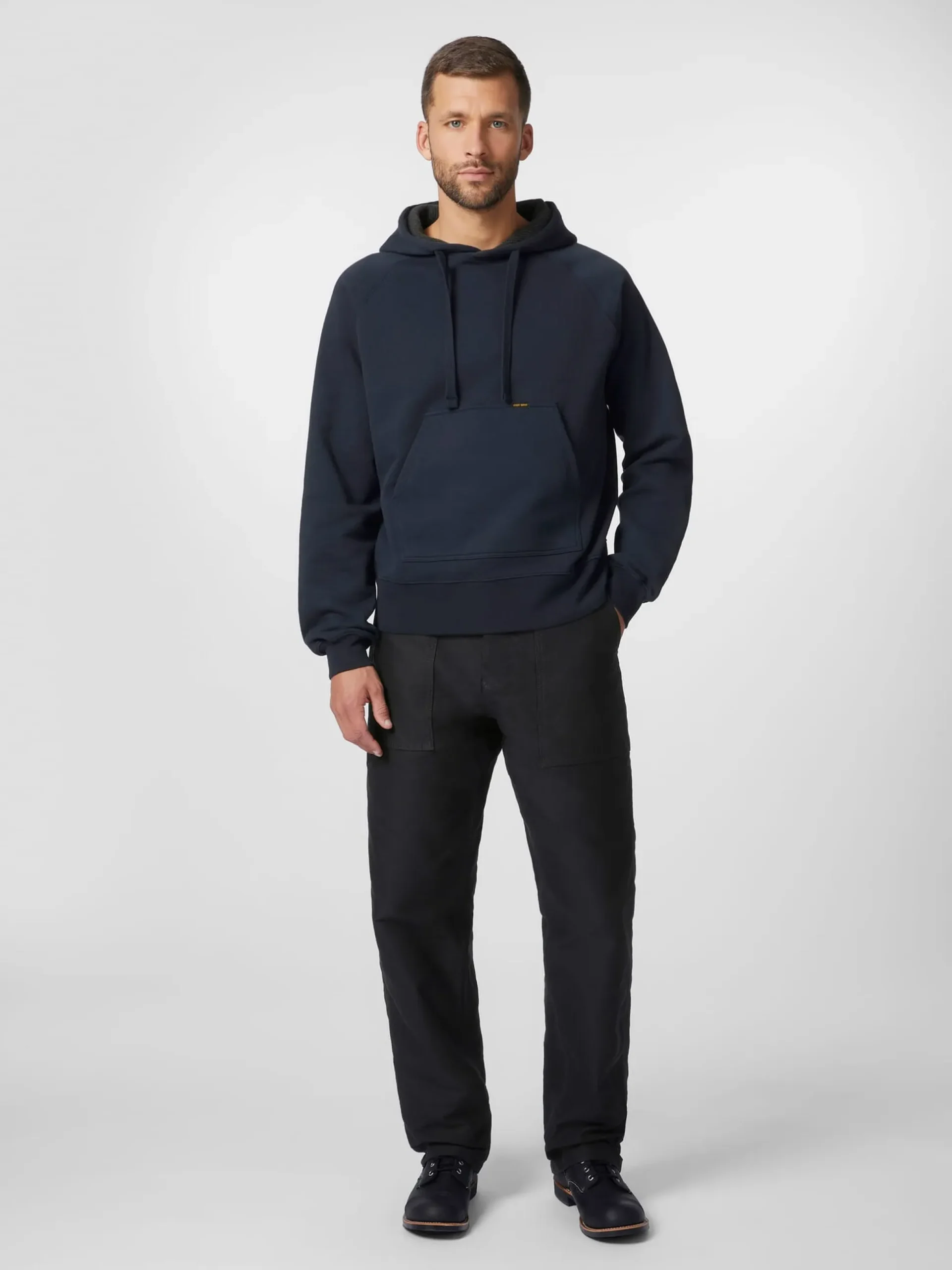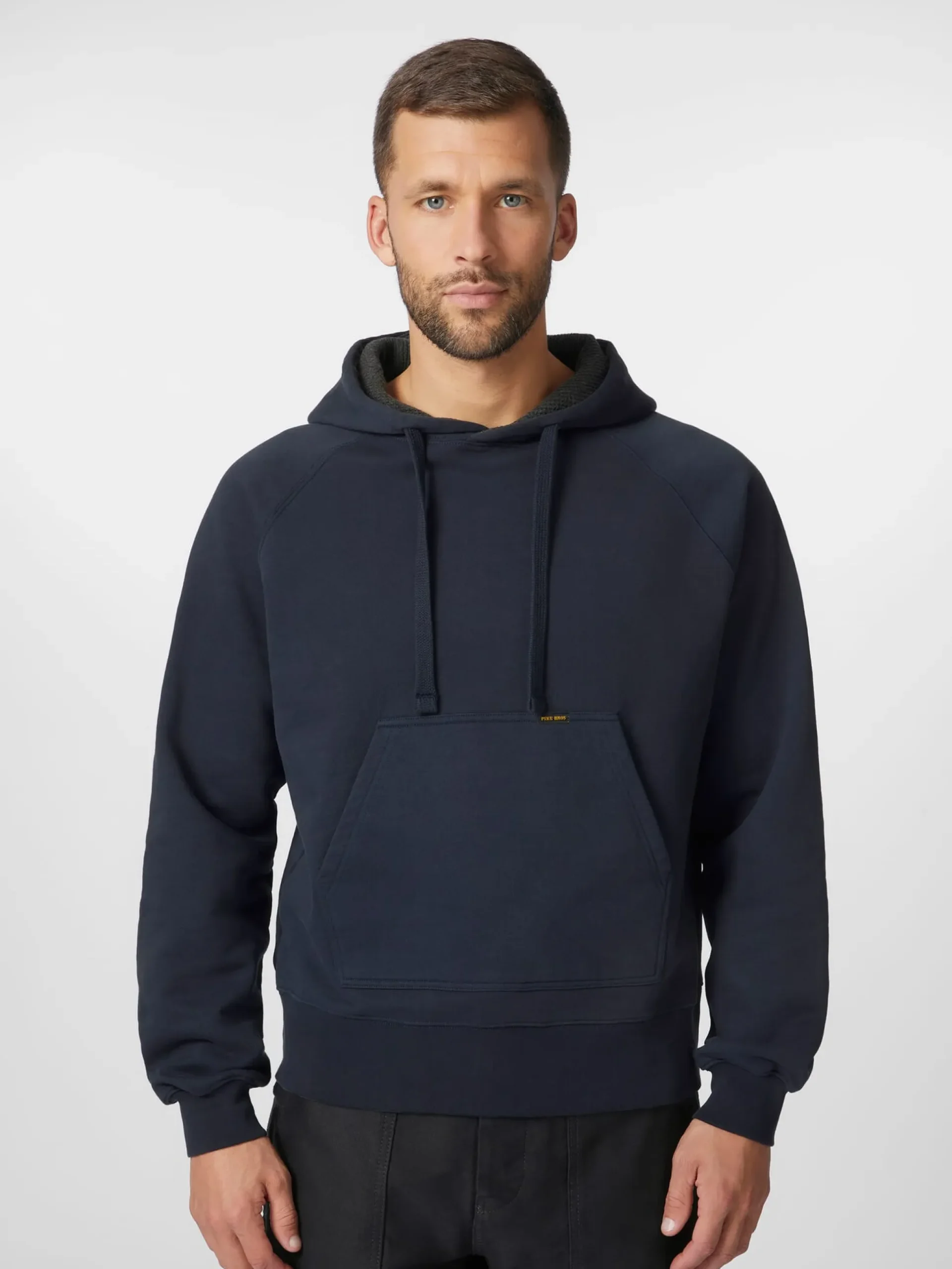 Weit und bequem, so wie es Mitte der 1960er Jahre populär war, ist dieser sportliche, schnörkellose Hoodie geschnitten. Raglanärmel erhöhen seinen Tragekomfort zusätzlich. Der Stoff ist außen glatt und innen weich, wodurch er sich angenehm auf der Haut anfühlt. Mit seinen 500 g/qm Flächengewicht macht er den Hoodie zu einem idealen Kleidungsstück für die Übergangszeit in Frühjahr und Herbst. Vorn ist ganz klassisch eine Kängurutasche aufgesetzt. Rippenstrickbündchen bilden den Abschluss an Ärmeln und Rumpf. Die Kapuze ist mit einem Band im Tunnelzug ausgestattet, innen ist sie mit einem Stoff mit plastischer Waffelstruktur gefüttert.