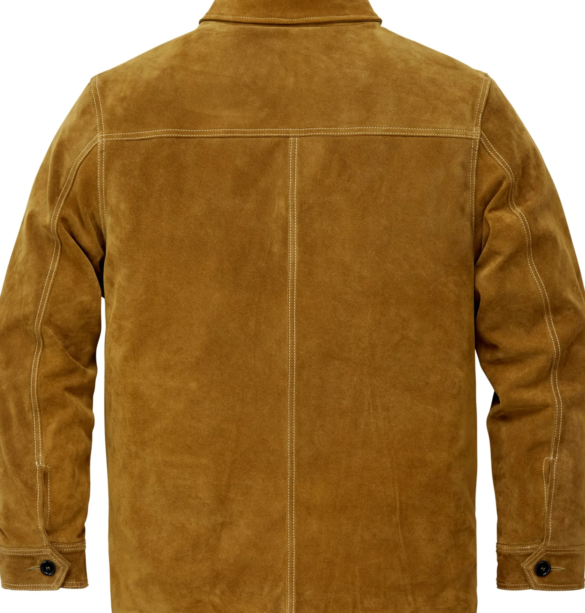 Charaktervolle und durchaus schwere Jacke aus einem weichen, 2,5 mm starken Kalbveloursleder, das in dieser Farbstellung bei Tellason „silky gold“ heißt. Das Rumpffutter besteht aus hautsympathischer Baumwolle, die Ärmelfutter aus Viskose erleichtern das An- und Ausziehen. Die Jacke wird mit Echthornknöpfen geschlossen. Außen sind vier Pattentaschen mit Messingdruckknöpfen aufgesetzt, wobei unter den unteren Taschen noch zwei Schubtaschen liegen. Innen ist eine ebenfalls knöpfbare Innentasche eingesetzt.