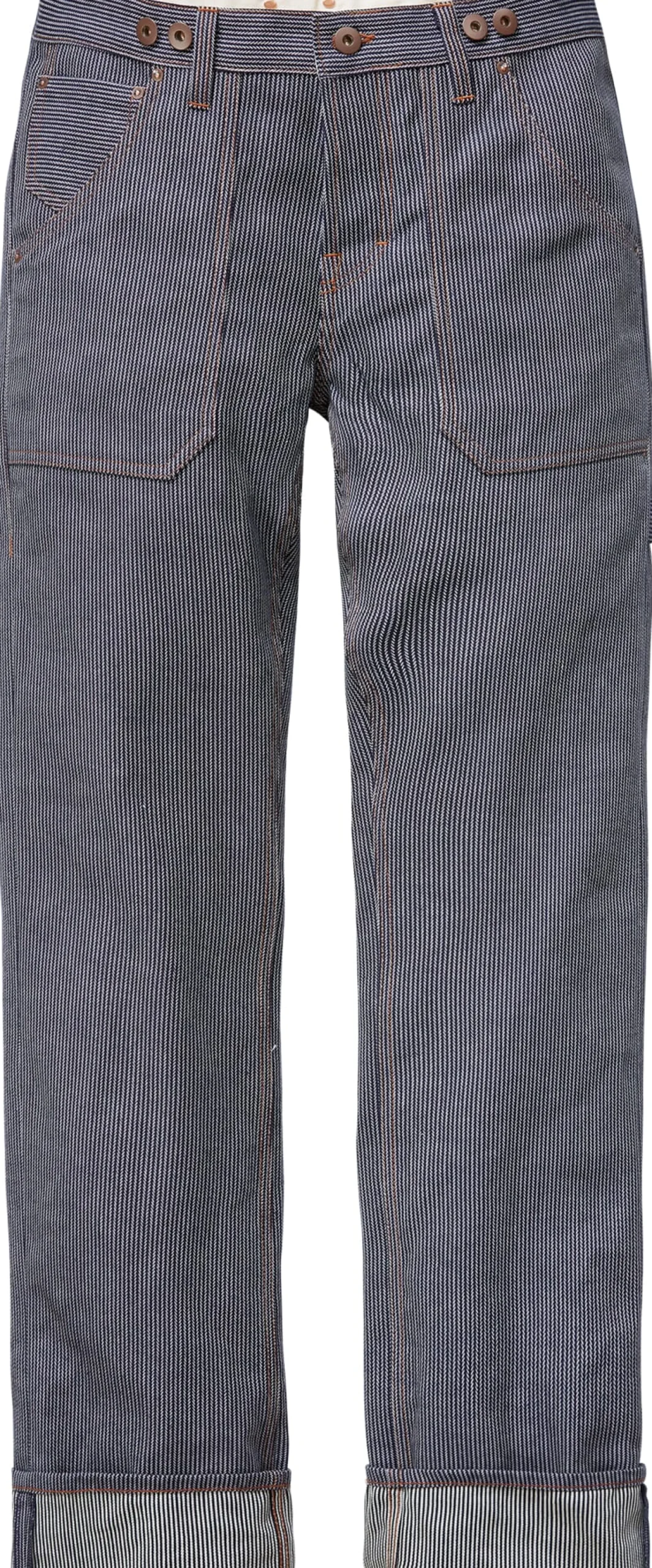 Das markante und kontrastreiche Fischgratgewebe für diese Hose bezieht Blaumann aus einer japanischen Weberei. Passend zum kernigen Material ist auch der Schnitt: sein Vorbild ist eine klassische Arbeitshose im 5-Pocket-Stil mit zusätzlicher Hammerschlaufe. Die Hose wird mittels Knopfleiste und Knopf geschlossen und sie ist mit Gürtelschlaufen und Hosenträgerknöpfen ausgestattet.