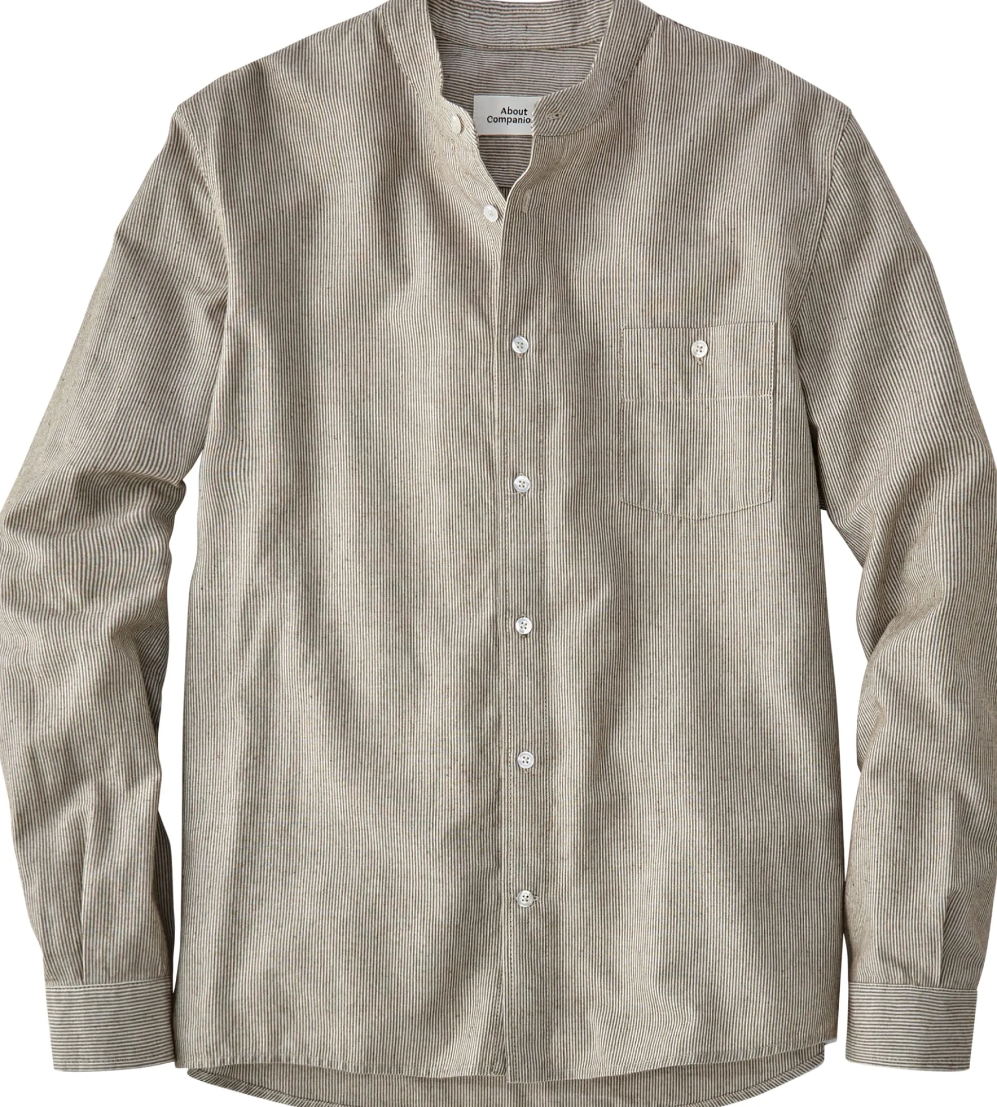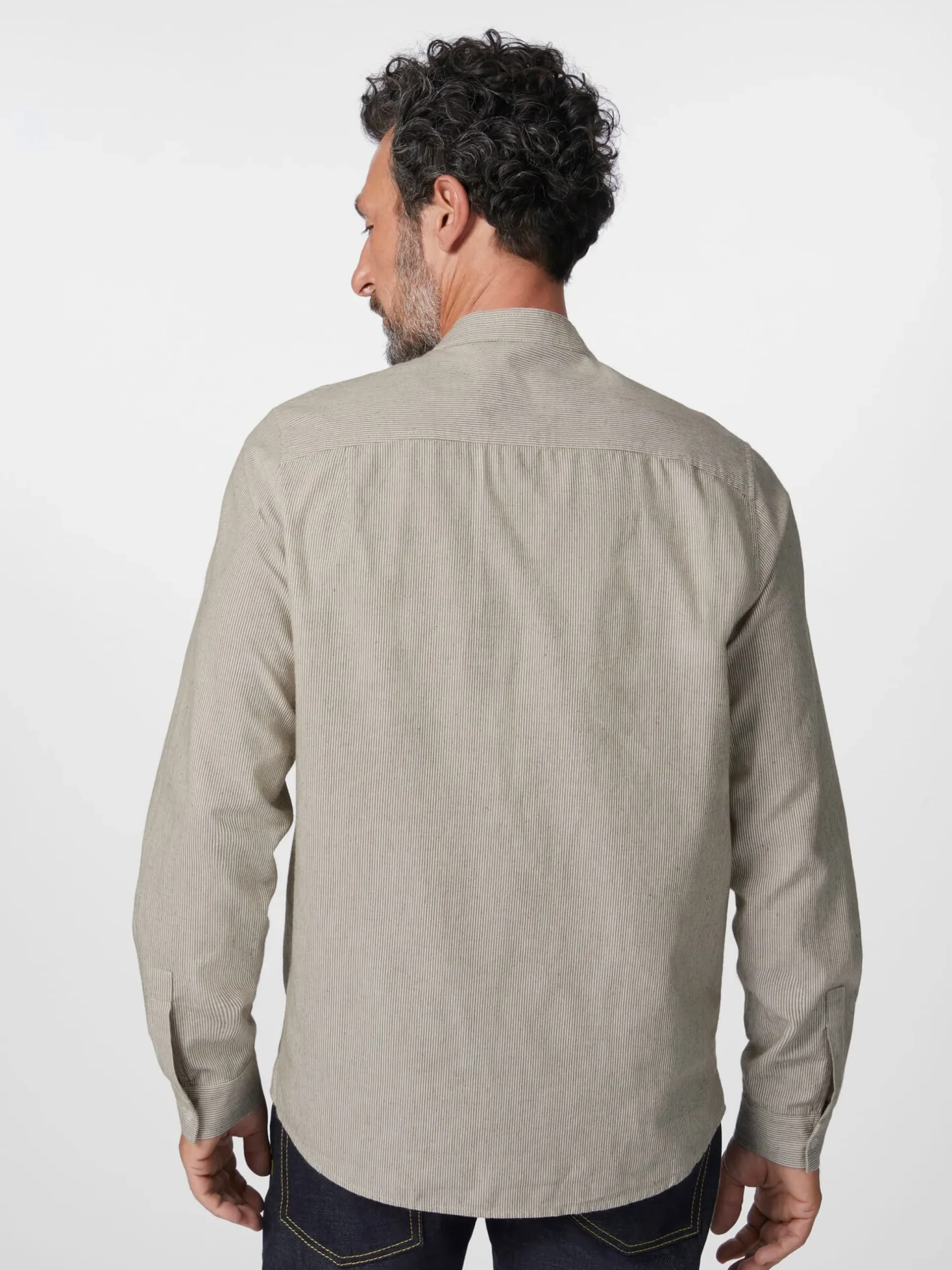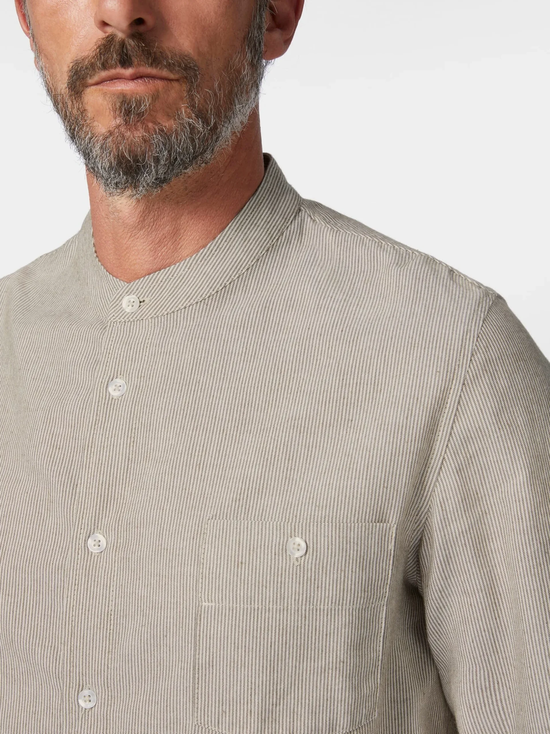 Der Stoff dieses Hemds zeigt ein feines Webstreifenmuster. Das Hemd ist mit einem schmalen Stehkragen gearbeitet und mit einer mustergetreu aufgesetzten, geknöpften Brusttasche ausgestattet. Gelegte Falten unter der Schulterpasse erhöhen den Tragekomfort. Die verwendete Baumwolle stammt aus kontrolliert biologischem Anbau.