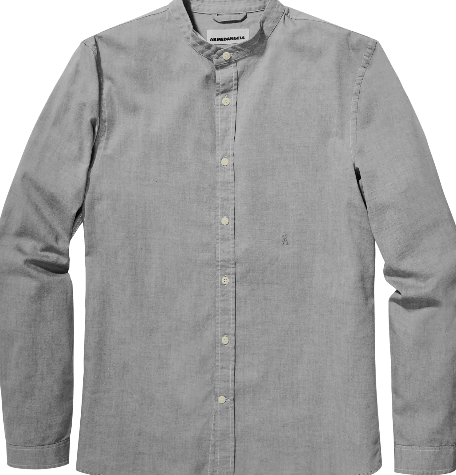 Armedangels fertigt dieses Hemd mit schmalem Stehkragen aus kontrolliert biologisch angebauter Baumwolle. Dass es ohne Brusttasche gefertigt ist, verstärkt seinen puristischen Charakter noch. Das Gewebe ist ein Chambray, der sich durch eine spezielle Webart auszeichnet, bei der die Kett- und Schussfäden verschiedenfarbig sind, wodurch ein markanter Melangeeffekt entsteht. Kontrastnähte ergänzen dieses optische Bild. Der Rumpfsaum ist leicht gerundet, die Manschetten sind knöpfbar.