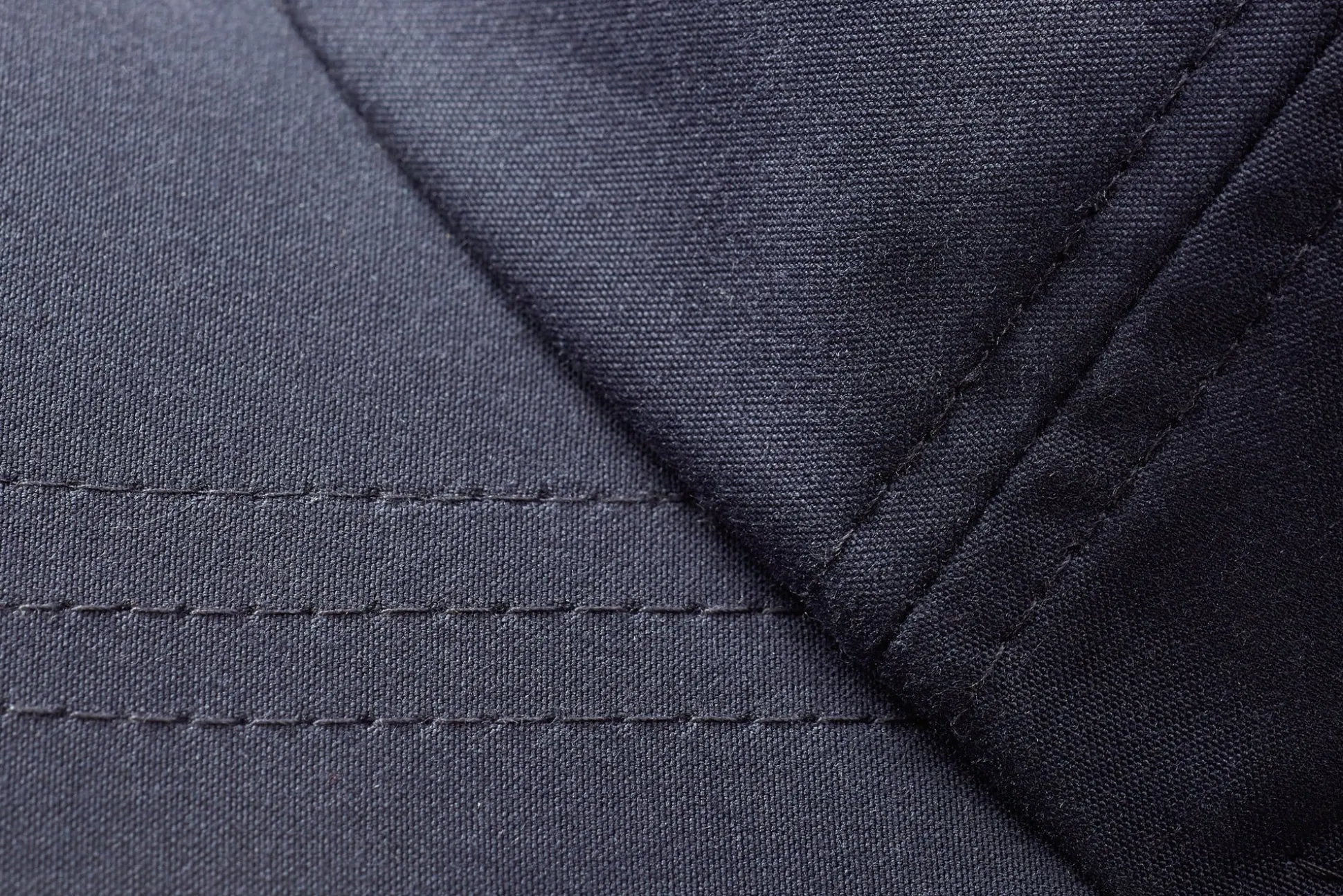 EtaProof® ist das moderat auf Wachsbasis imprägnierte Baumwolltuch der Zürcher Weberei Stotz. Es ist so dicht gewebt, dass die Fasern bei Kontakt mit Feuchtigkeit aufquellen und Wassertropfen nach dem Schutzprinzip der Schirmseide an der Oberfläche abperlen. Mayser fertigt daraus diese Kopfbedeckung im Stil einer Baseballcap. Der Schirm ist einteilig, die Krone besteht aus sechs Stoffdreiecken.