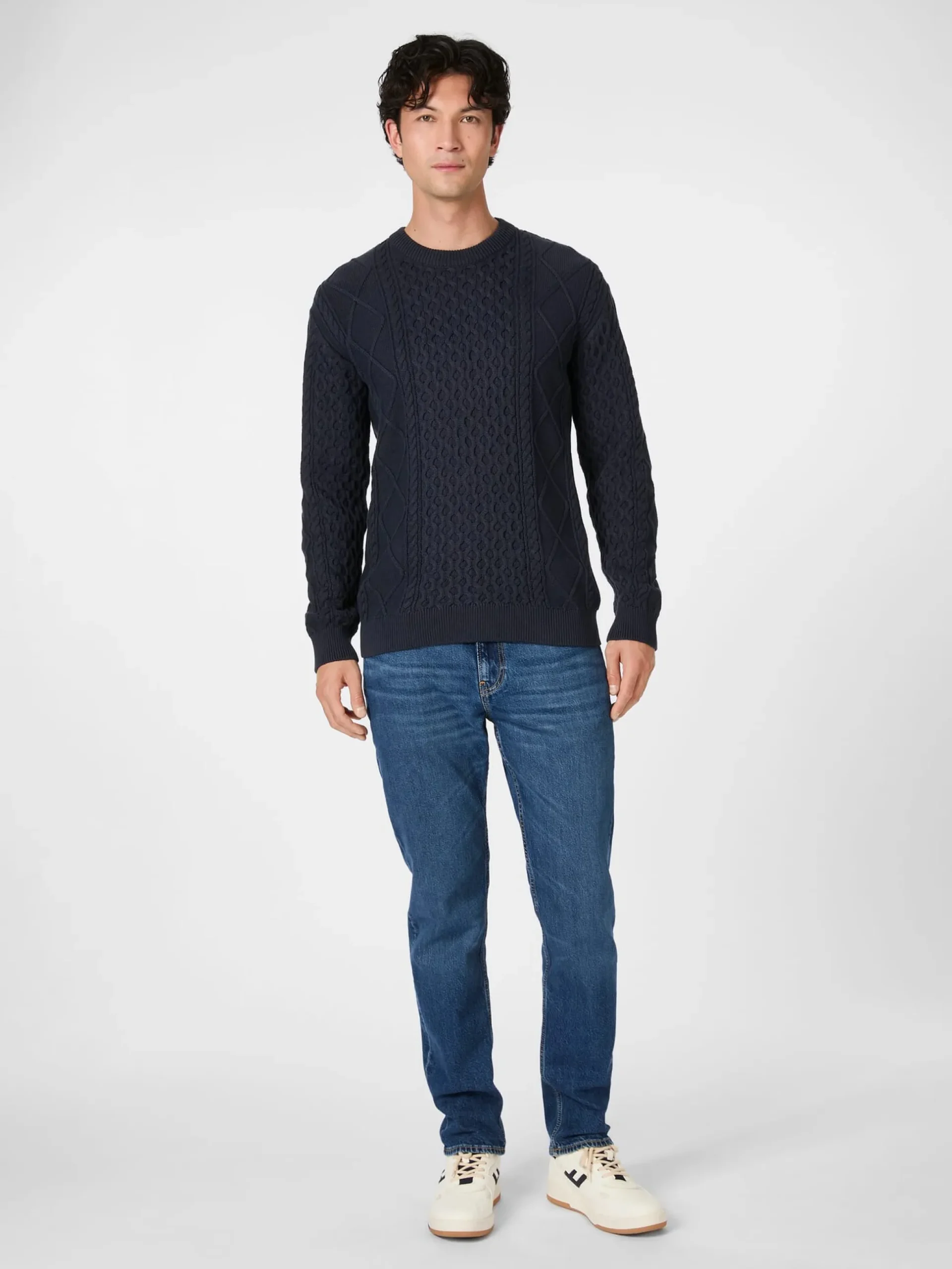 Für das markante Strickbild dieses Pullovers aus kontrolliert biologisch angebauter Baumwolle greift Knowledge Cotton Apparel auf die berühmten Aranmuster zurück, die von den gleichnamigen irischen Inseln stammen und ihren Träger*innen einst symbolhaft gute Wünsche mit auf den Weg gaben. Da sind die klassischen Zopfmuster (auch Cable Knit genannt), die wie gedrehte Stränge aussehen und dem Gestrick Textur und Tiefe geben. Sodann die klassischen Rauten- oder Diamantmuster, die hier von den Schultern abwärts und auf den Außenseiten der Ärmel verlaufen. Und schließlich noch das Honeycomb-Muster auf Brust, Rücken und Ärmeln, das mit seiner charakteristischen Struktur an Bienenwaben erinnert. Breite Rippenstrickbündchen bilden den Abschluss an Hals, Ärmeln und Rumpf.