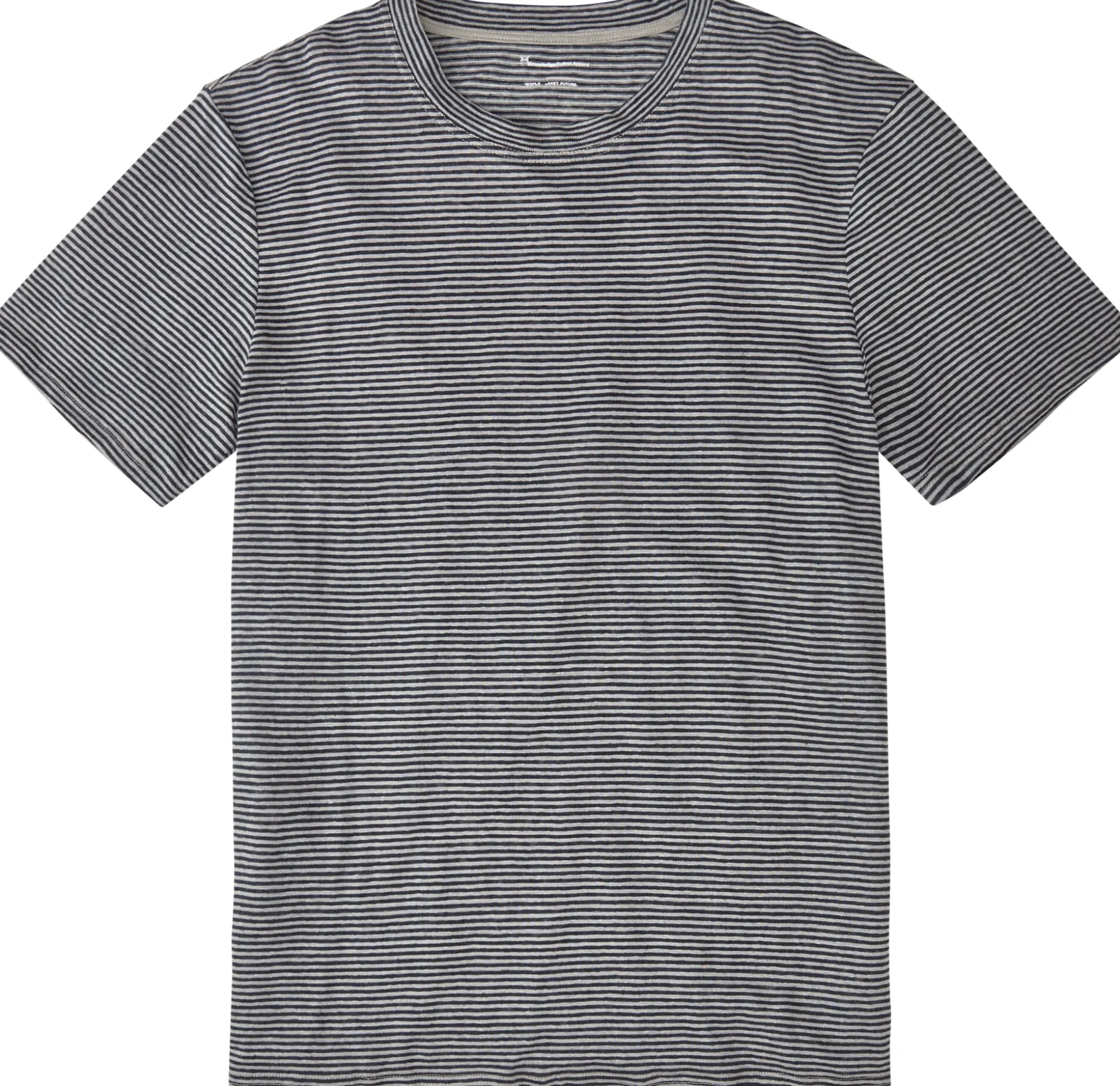 Leichtes, locker fallendes Shirt aus reinem Leinen. Es ist in klassischer T-Shirt-Form geschnitten und zeigt ein feines Ringelmuster. An den Abschlüssen von Ärmeln und Rumpf ist der Stoff umgelegt und mit Flatlocknähten fixiert, der Rundhalsausschnitt schließt mit einer umlaufenden gestreiften Blende. Die Flachsfasern für den Stoff stammen aus kontrolliert biologischem Anbau.