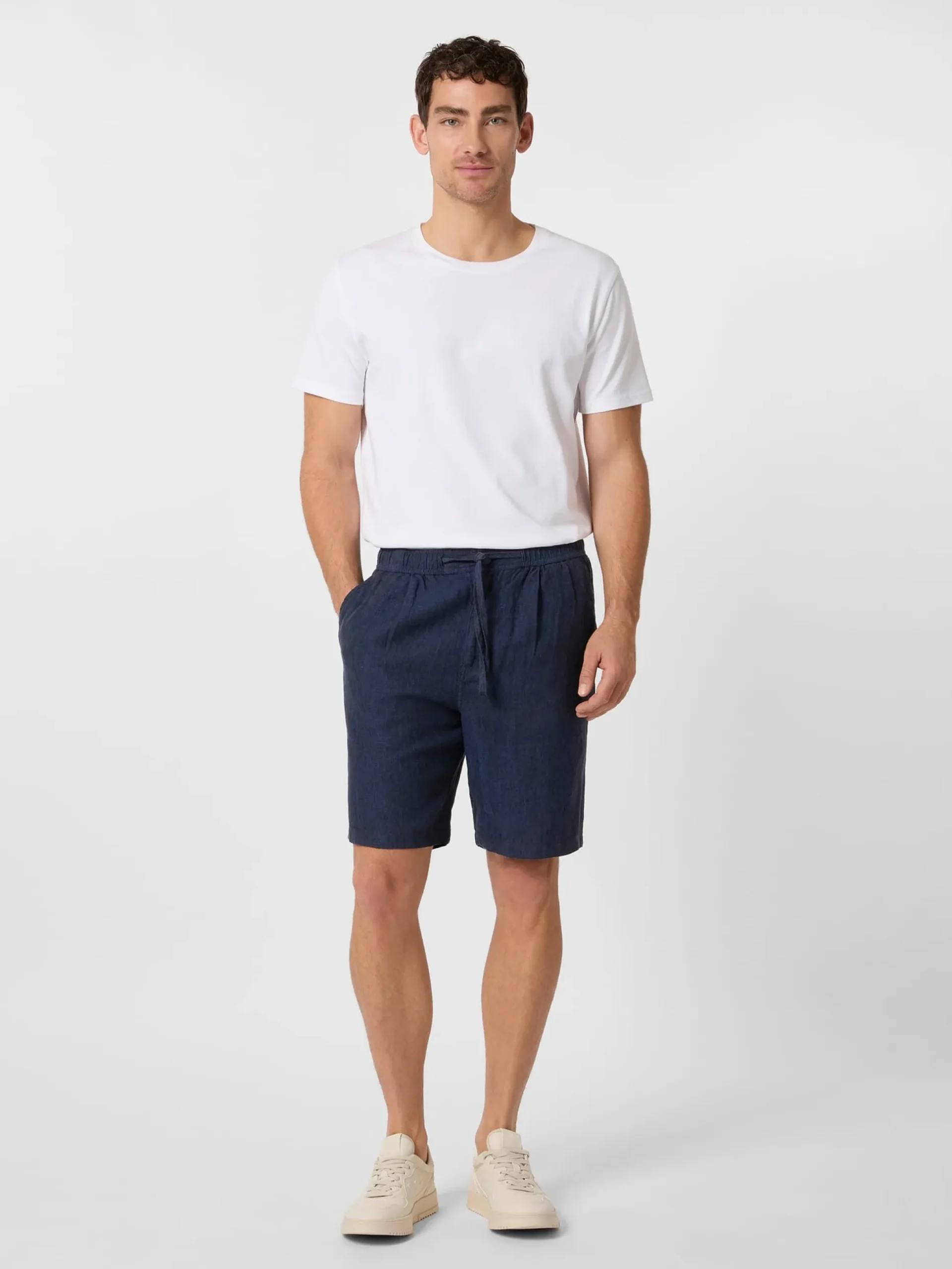 Lässige Shorts, deren Stoff aus strapazierbarem, kühlendem Leinen besteht. Das Gewebe zeigt die materialtypischem Fadenverdickungen und einen ausgeprägten Melangeeffekt. Die Shorts wird wird mittels Reißverschluss und Knopf geschlossen, ein Gummibund mit Bindeband im Tunnelzug erhöht den Tragekomfort. Je zwei Seitentaschen und eingesetzte Gesäßtaschen nehmen Kleinteile des täglichen Bedarfs auf. Die Flachsfasern für den Stoff stammen aus kontrolliert biologischem Anbau.