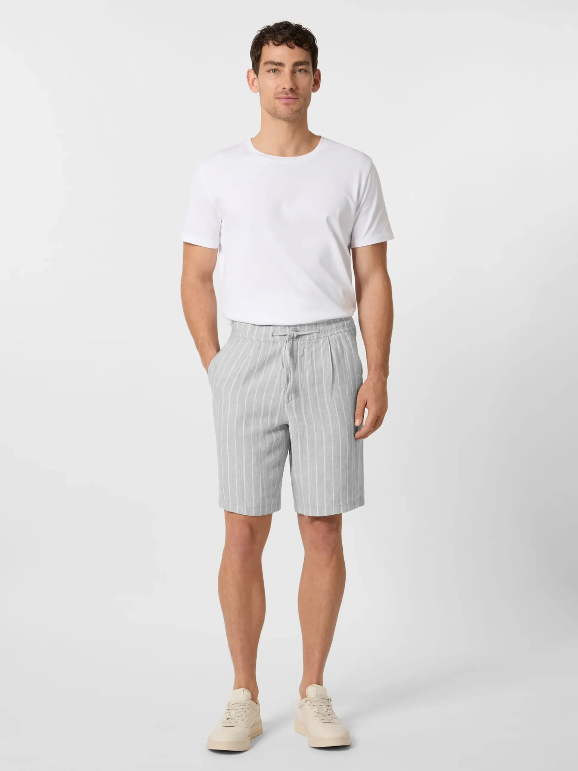 Lässige Shorts, deren gestreifter Stoff aus strapazierbarem, kühlendem Leinen besteht. Das Gewebe zeigt neben den Streifen die leinentypischem Fadenverdickungen und einen schönen Melangeeffekt. Die Shorts wird wird mittels Reißverschluss und Knopf geschlossen, ein Gummibund mit Bindeband im Tunnelzug erhöht den Tragekomfort. Je zwei Seitentaschen und eingesetzte Gesäßtaschen nehmen Kleinteile des täglichen Bedarfs auf. Die Flachsfasern für den Stoff stammen aus kontrolliert biologischem Anbau