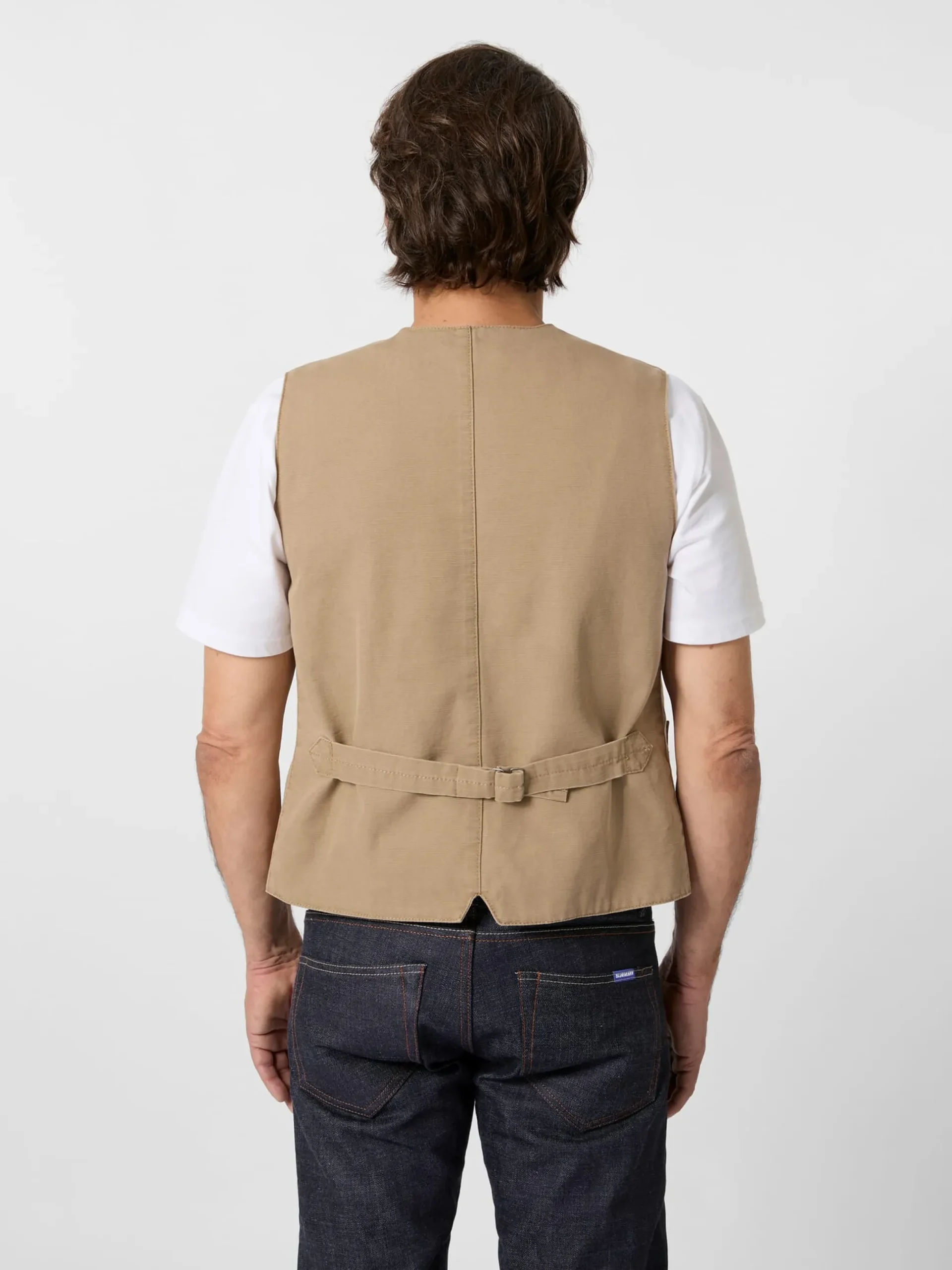 Einst schützten Westen wie diese das Oberhemd bei der Arbeit vor Schmutz und Beschädigung. Pike Brothers fertigt die Neuauflage einer solchen kragenlosen Weste aus einem markanten Baumwollcanvas. Front und Rücken sind aus dem Oberstoff gearbeitet, innen ist die Weste mit einem leichten Baumwolltuch gefüttert. Drei eingesetzte Taschen bieten Platz für Kleinteile des täglichen Bedarfs, ein aufgesetzter Taillenriegel aus dem Oberstoff erlaubt eine moderate Weitenanpassung mittels Metallschließe. Ein optisches Detail ist das schräg eingesetzte Zierknopfloch zwischen dem zweiten und dritten Knopf.