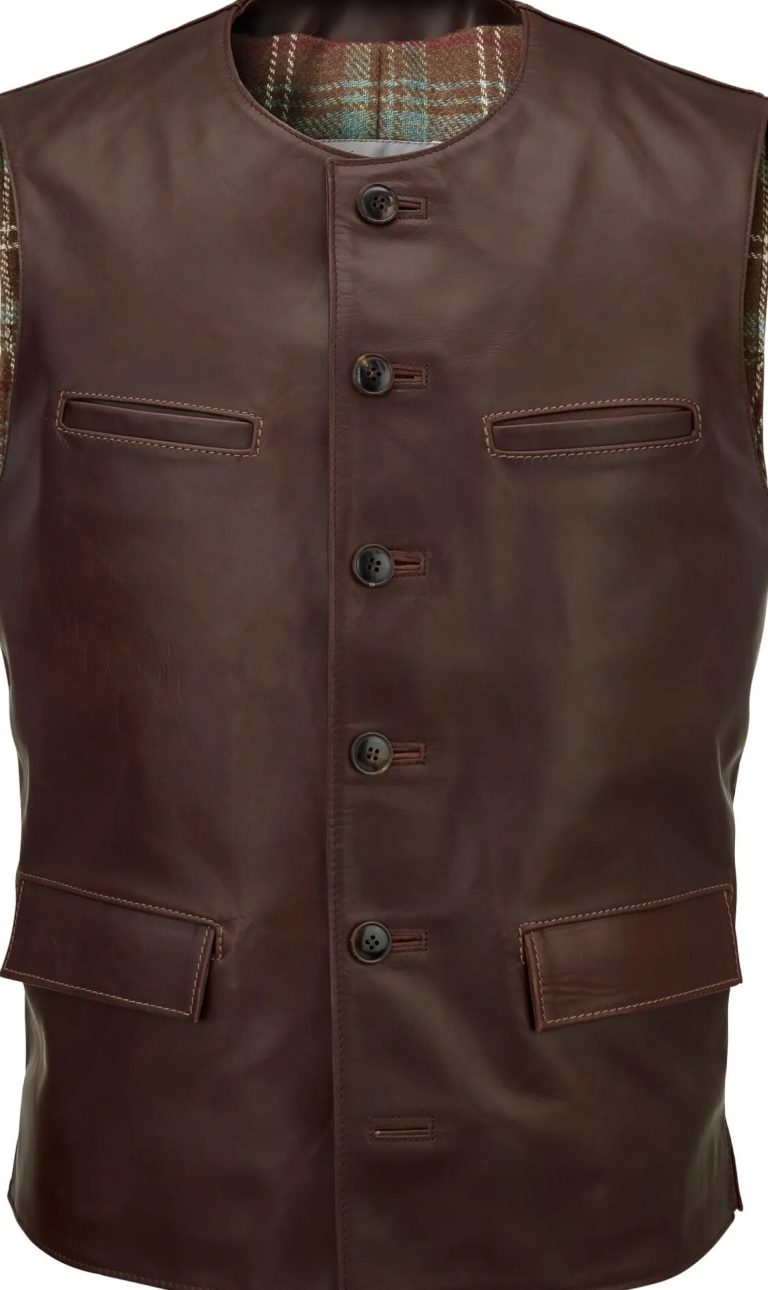 Ein kerniges gewachstes Pull-up-Pferdeleder aus Italien kombiniert Hack bei dieser kragenlosen Weste mit einem wärmenden karierten Wollfutter von Mallalieus of Delph in England. Im Leder bilden sich durch knicken, dehnen, abschürfen und ähnliche Beanspruchungen rasch sichtbare Gebrauchsspuren, die in eine schöne Patina münden. Dieser Effekt ist gewollt. Vier eingesetzte Taschen, zwei davon mit Patten, und eine Innentasche mit Reißverschluss nehmen Kleinteile des täglichen Bedarfs auf.
