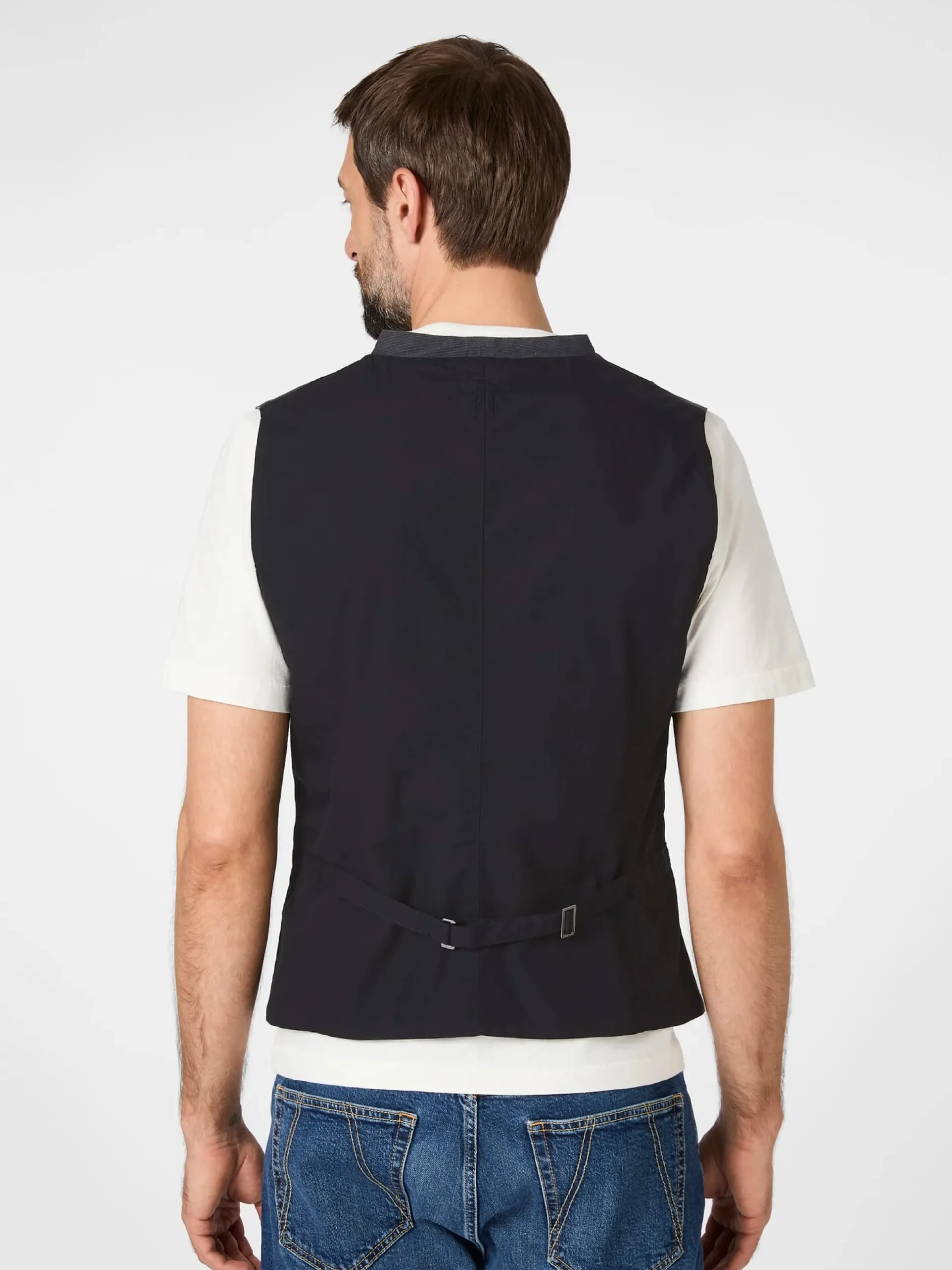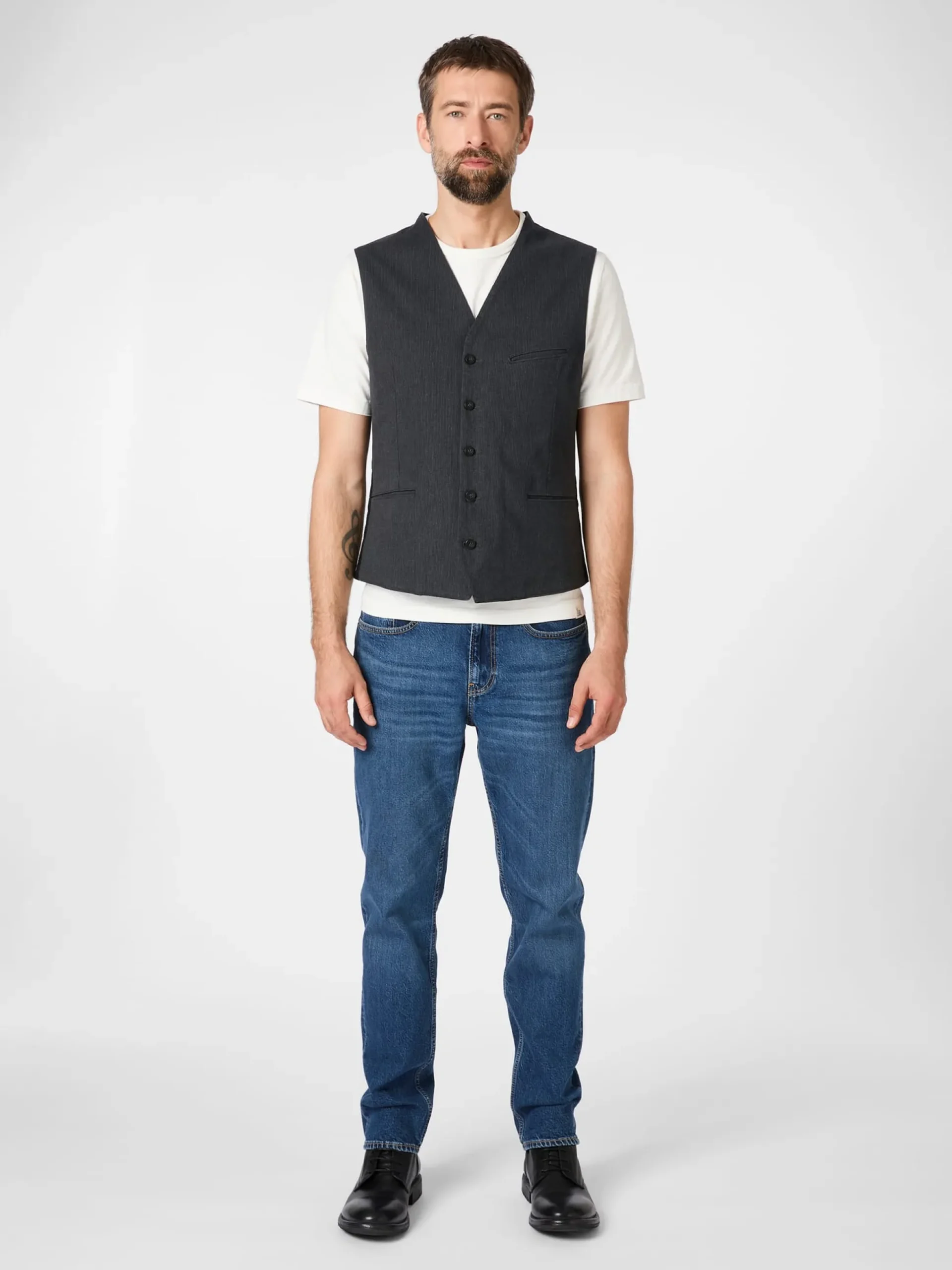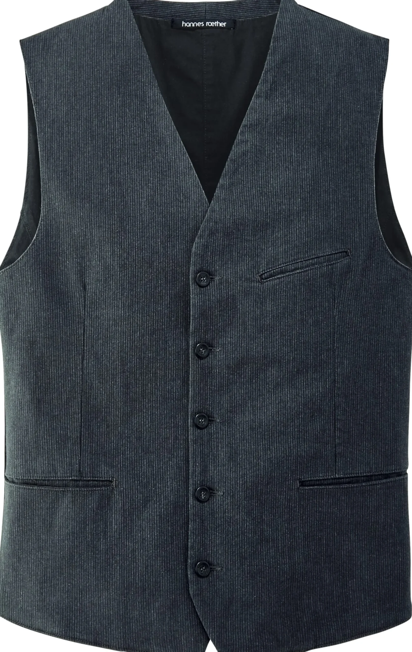 Das Vorderteil dieser hoch geknöpften, kragenlosen Weste besteht aus weichem Baumwollstoff (mit etwas Elastan), der ein feines Webmuster aus strukturierten Nadelstreifen zeigt. Darunter liegt ein unifarbener Baumwollstoff, aus dem auch der Westenrücken gearbeitet ist. Zwei Abnäher geben der Weste Form, drei eingesetzte Taschen nehmen Kleinteile des täglichen Bedarfs auf. Ein Stoffriegel mit Metallschließe erlaubt eine moderate Anpassung der Taillenweite.