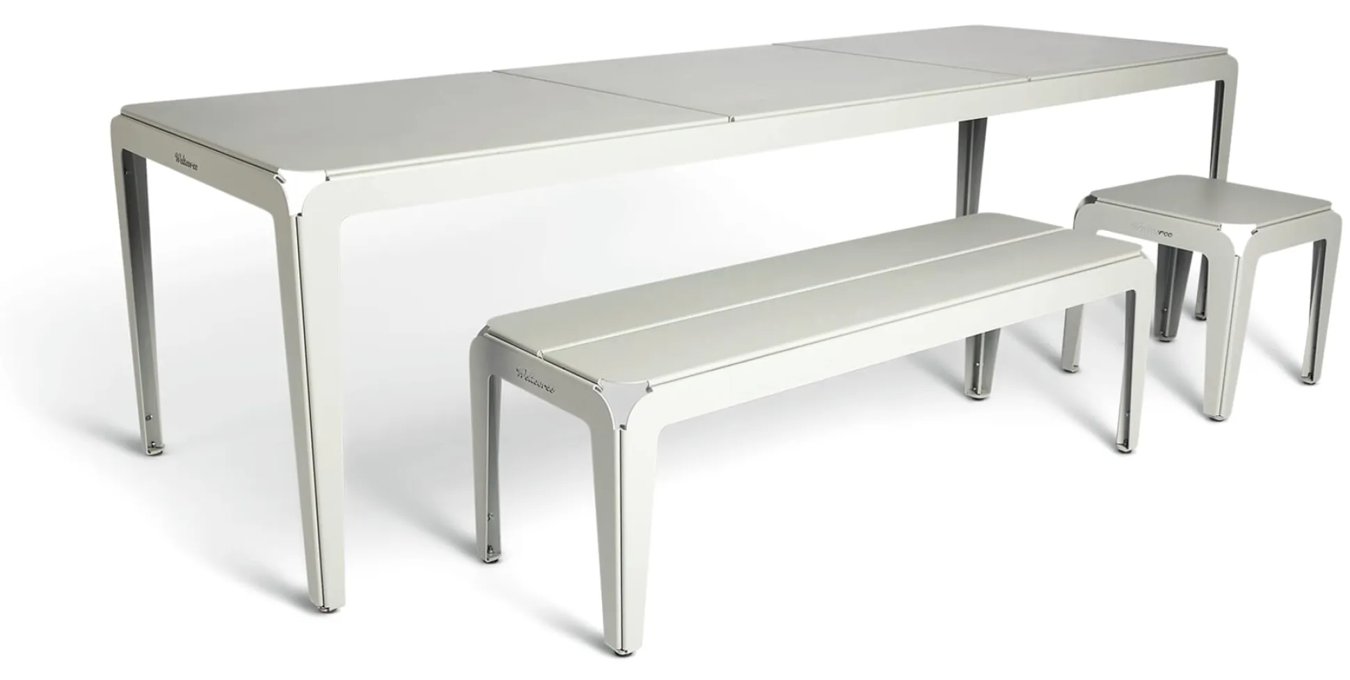 Serie von Tischen und Sitzmöbeln, ganzjährig im Außenbereich einsetzbar. Bei BENDED werden Aluminium- oder Stahlplatten in Kontur gelasert, durch Umformung in ihre Grundform gebracht und an den Verbindungsstellen verschraubt. Eine einfache Manipulation, die eine extrem stabile und dennoch flexible Konstruktion bildet. Durch diese besondere Flexibilität passt sich die Struktur der Möbel der Oberfläche an, auf der sie stehen. Kurzum: Die BENDED Möbel werden niemals wackeln. Trotz der robusten und belastbaren Konstruktion bleiben die Möbelstücke vergleichsweise leicht und lassen sich einfach umgruppieren oder an einen anderen Standort bringen. Das Aluminium ist aufgrund seiner Sortenreinheit zu 100 % recycelbar.