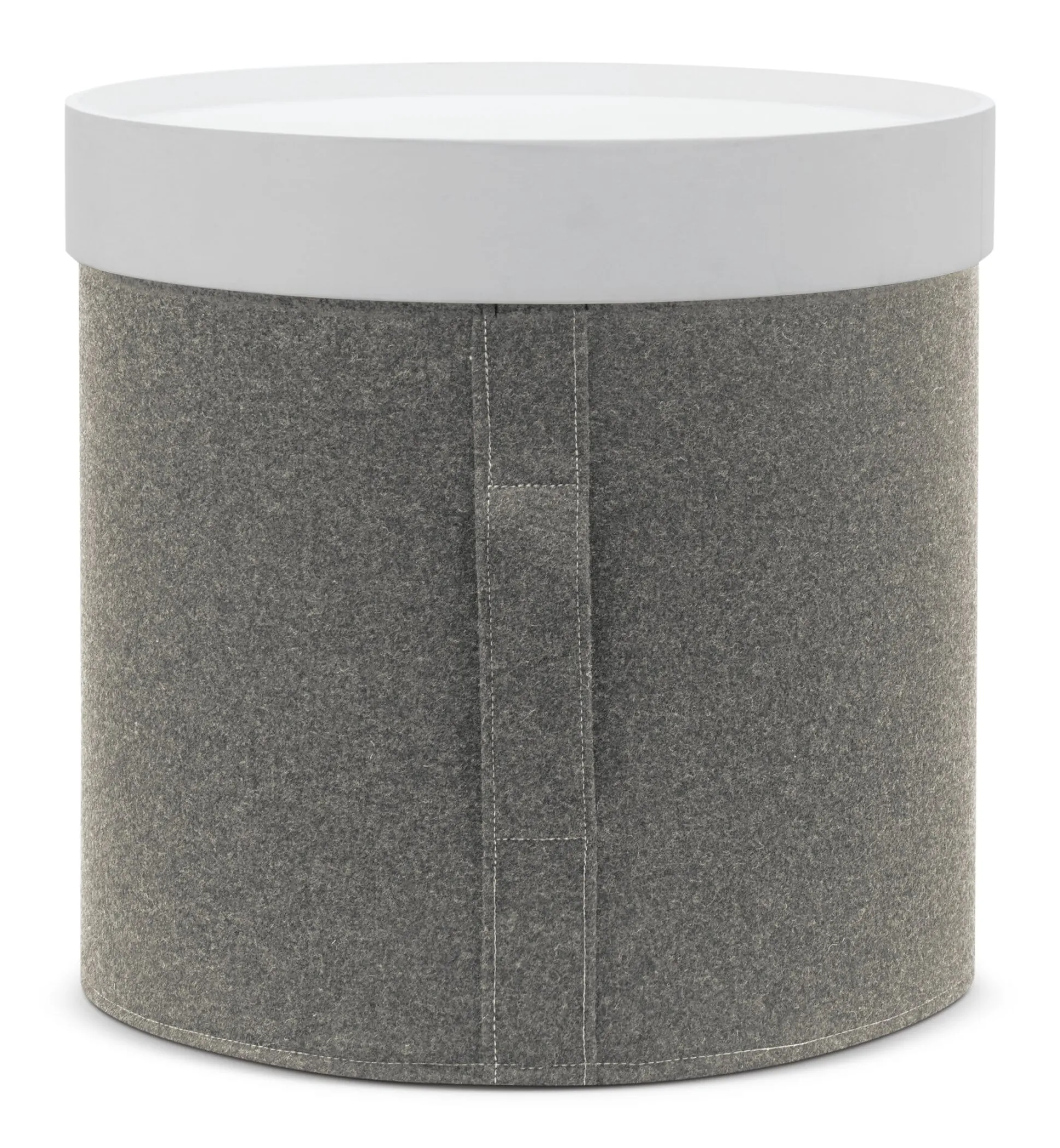 Vollständig mit Stoff bezogener Hocker mit Griffschlaufe. Wird mit einem separat lieferbaren Tablett zum Beistelltisch.