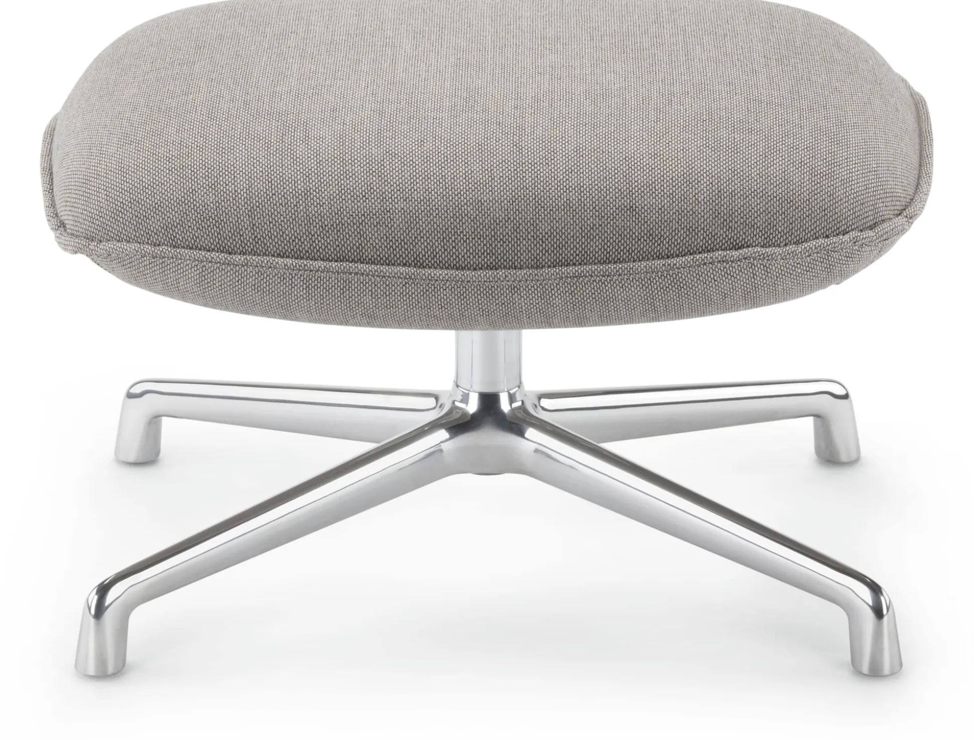 Dieser Hocker nimmt die Form der Sitzfläche des zugehörigen Sessels DOZE LOUNGE auf und steht wie der Sessel auf einem filigranen und drehbaren Gestell aus poliertem Aluminium, das ihn zierlich und leicht wirken lässt. Die Polsterung aus Formschaum und der hochwertig gearbeitete Bezugsstoff sorgen für hohen Komfort.