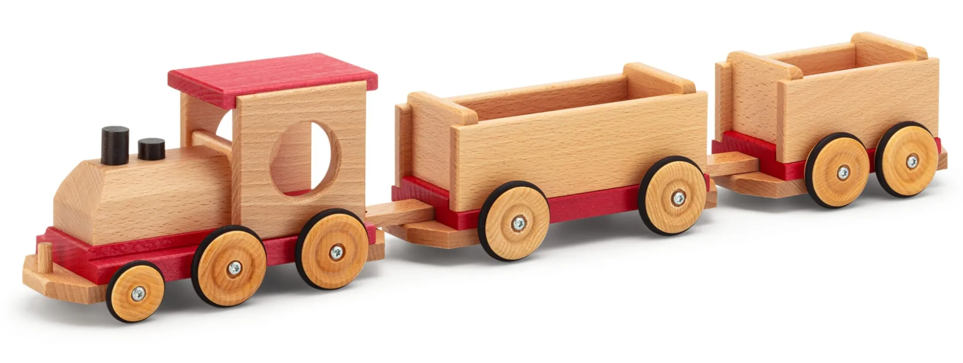 Eine Lokomotive und zwei Waggons aus Buchenholz, teilweise lackiert. Bereifung aus Silikon. Lokomotive Höhe 11 cm, Breite 9,5 cm, Länge 19,5 cm. Waggons Höhe 8 cm, Breite 9,5 cm, kurzer Waggon Länge 17,5 cm, langer Waggon Länge 22,5 cm. Gesamtlänge zusammengesteckt 55 cm. Gesamtgewicht 1,1 kg.