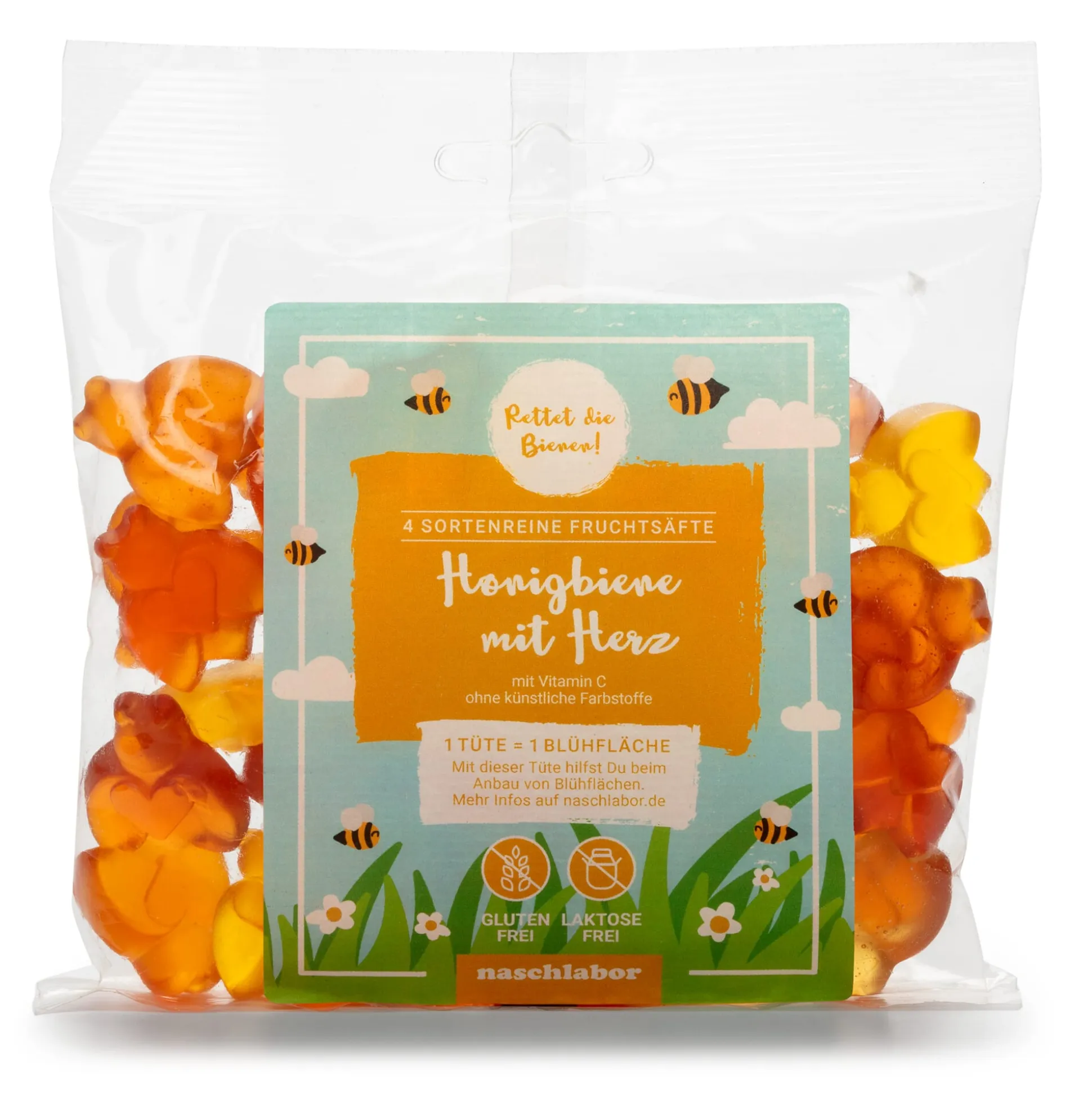 Keine Gummibären, sondern Gummibienen sind in dieser Tüte – und das hat einen guten Grund. Pro vier verkauften Tüten „Honigbiene mit Herz“ pflanzt Naschlabor einen Quadratmeter Blühfläche in der Region um Babenhausen, wo der Betrieb ansässig ist. Doch selbstverständlich überzeugt auch der ungemein fruchtige Geschmack der Gummibienen. Sie bestehen zu einem Fünftel aus sortenreinen Fruchtsaftkonzentraten von Ananas, Marille, Mango und Grapefruit. Für die kräftigen Farben sorgen Konzentrate aus Karotte, Saflor (aus den Blütenblättern der Färberdistel), Apfel und Kürbis.