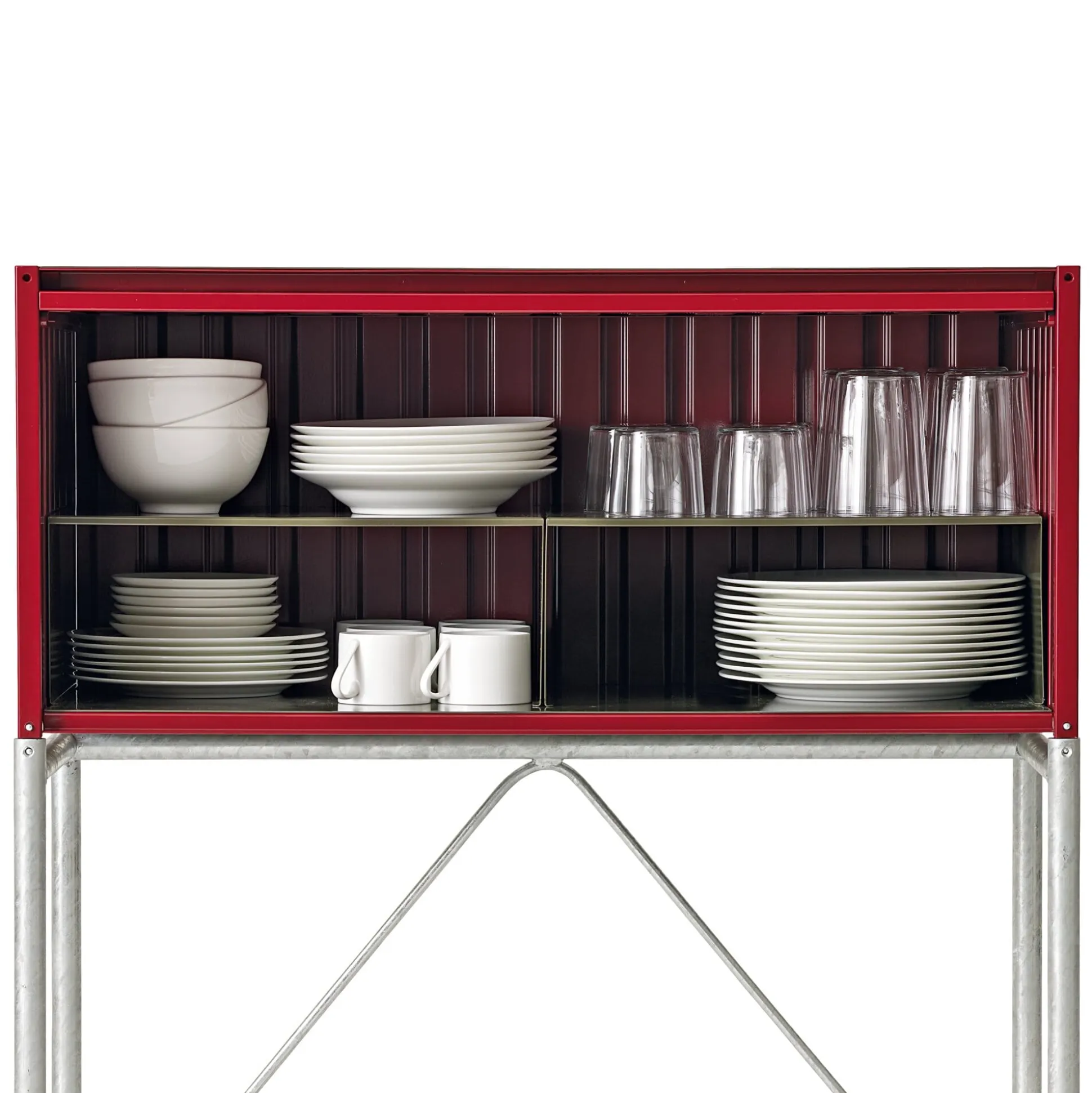 Der Klassiker: Der CONTAINER DS in der Proportion eines Seecontainers ist quasi der Urtyp der Serie CONTAINER DS. Er dient als Schrank im Wohnraum für Porzellan und die Utensilien für den gedeckten Tisch, im Büro für die Unterbringung von Aktenordnern im genormten Format oder für Papier und Büroutensilien. Als Kommodenmöbel für Wäsche und als Möbelstück in Flur und Garderobe. Kombinierbar ist er in seiner rechteckigen Grundform mit einer Vielzahl von ergänzenden Zubehören. Verschiedene Füße und Rollen oder die beiden Gerüstgestelle dienen dabei als Basis. Das Regalelement TARA besitzt die Außenkontur des Containers und lässt sich mit diesem in der Höhe über im Lieferumfang befindliche Verbinder stapeln. Das Garderobengestell ergänzt den Container zur funktionalen Garderobe. Der Container dieses Formats ist in eingeschränkter Farbauswahl mit einem Schloss ausgestattet lieferbar. Mit einer separat lieferbaren Konsole ist er an der Wand zu montieren.