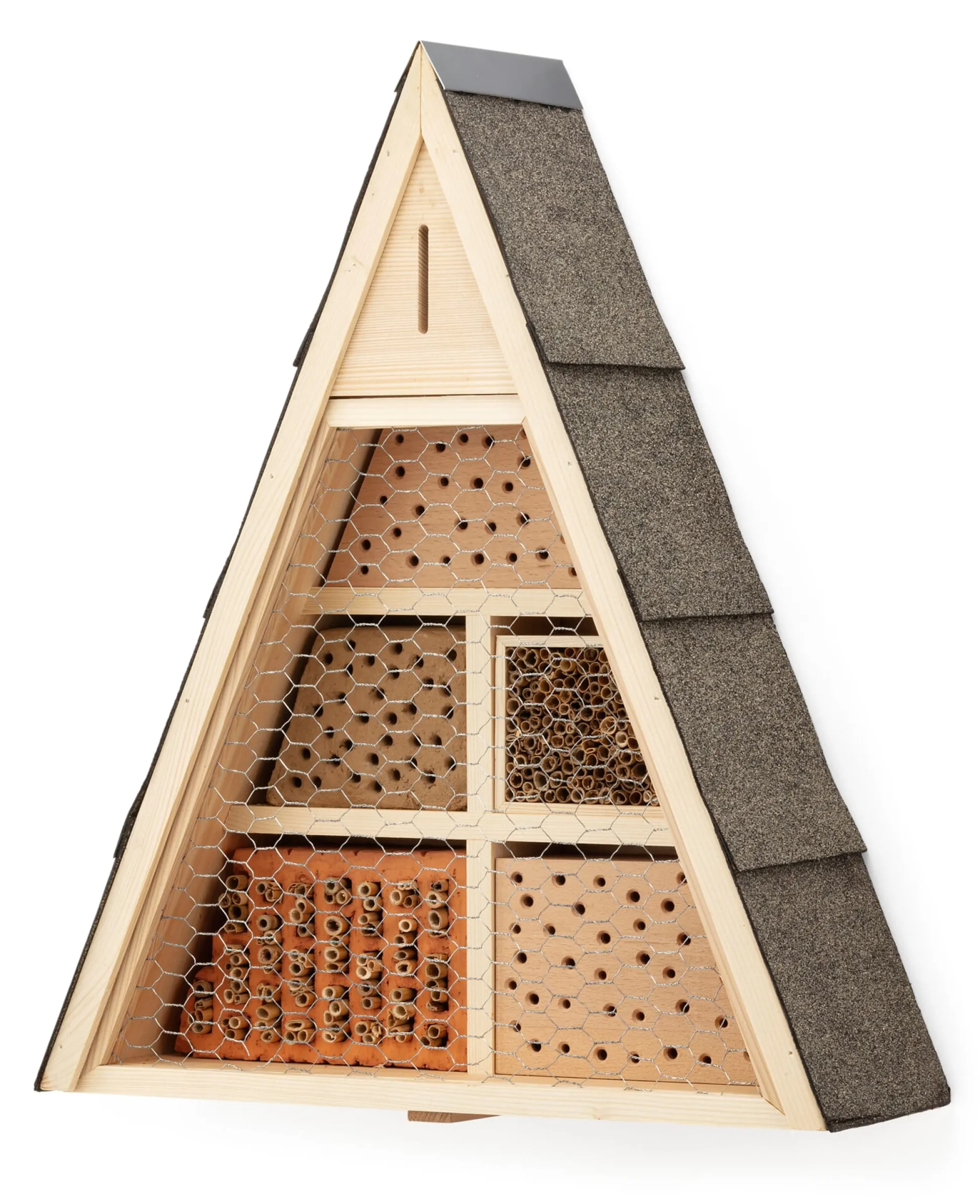 Rahmen aus Fichtenholz mit einer austauschbaren Abdeckung aus Dachpappe und einem Dachfirst aus Metall. Abnehmbares Drahtgeflecht aus verzinktem Stahldraht. Füllung aus Buchenholz, Lehm, Schilf, Porotonziegel und Fichtenholz. Hergestellt in Sachsen. Höhe 55 cm, Breite 45 cm, Tiefe 16 cm. Gewicht 8,6 kg.
