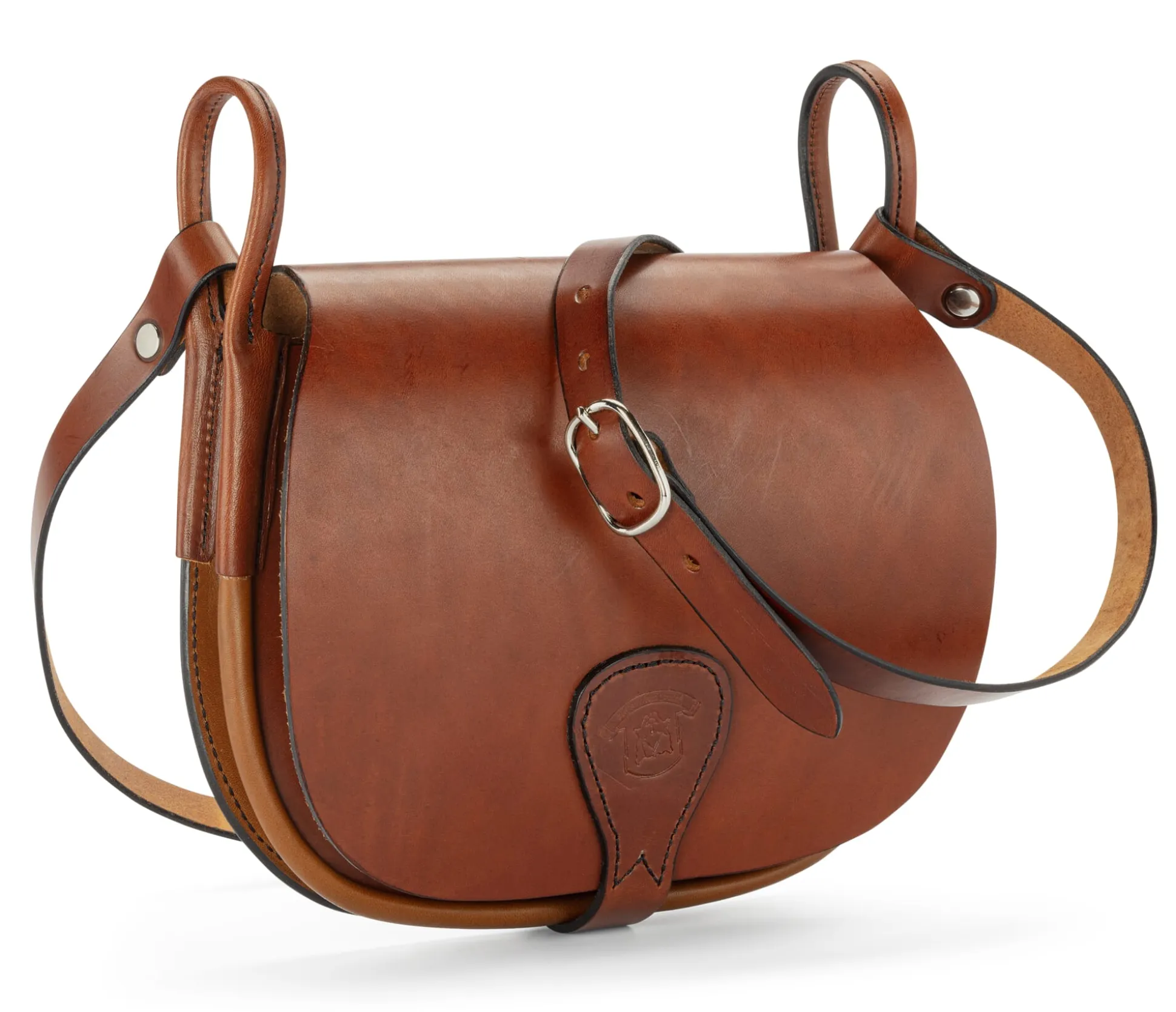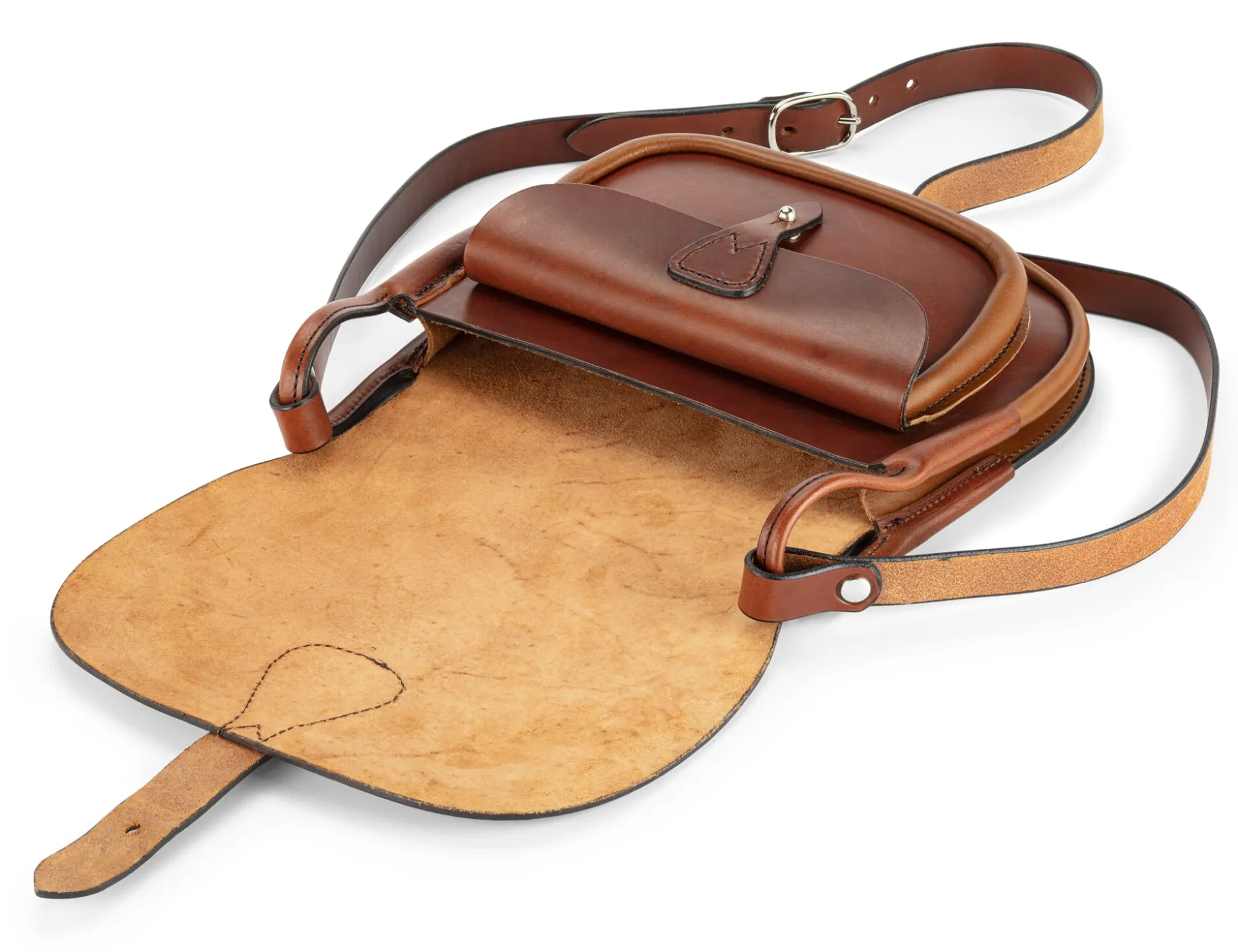 Für den Jäger aus Kurpfalz haben wir sie nicht gemacht, er würde typische Details wie die Patronenhalter oder auch den „Hühnergalgen“, an dem das erlegte Wild befestigt wird, vermissen. Statt dessen haben wir hier von klassischen Jagdtaschen die auf das Wesentliche konzentrierte Funktionalität übernommen. Im Verbund mit dem robusten Material Rindleder entstand dieses in einer westfälischen Sattlerei in Handarbeit gefertigte, für den Alltag nachgerade prädestinierte Modell. Vom Rücken bis zur vorderen Klappe ist der Korpus aus einem zusammenhängenden Stück Leder geschnitten; der Lederriemenverschluss mit Schnalle ist auf die Klappe aufgenäht. Das Hauptfach bietet den Stauraum für die Utensilien täglichen Bedarfs, während die kleinere Vordertasche (11,5 x 18 cm), deren eigene Klappe mit einem Patronenknopf fest verschlossen wird, sensible Gegenstände wie Mobiltelefon oder Geldbörse verwahrt. Ein markantes Detail sind die rundgenähten Lederbügel, an denen der längenverstellbare Trageriemen befestigt ist. Wer mag, macht’s wie ein Jäger und befestigt in diesen Bügeln zum Beispiel die Strick- oder Regenjacke.