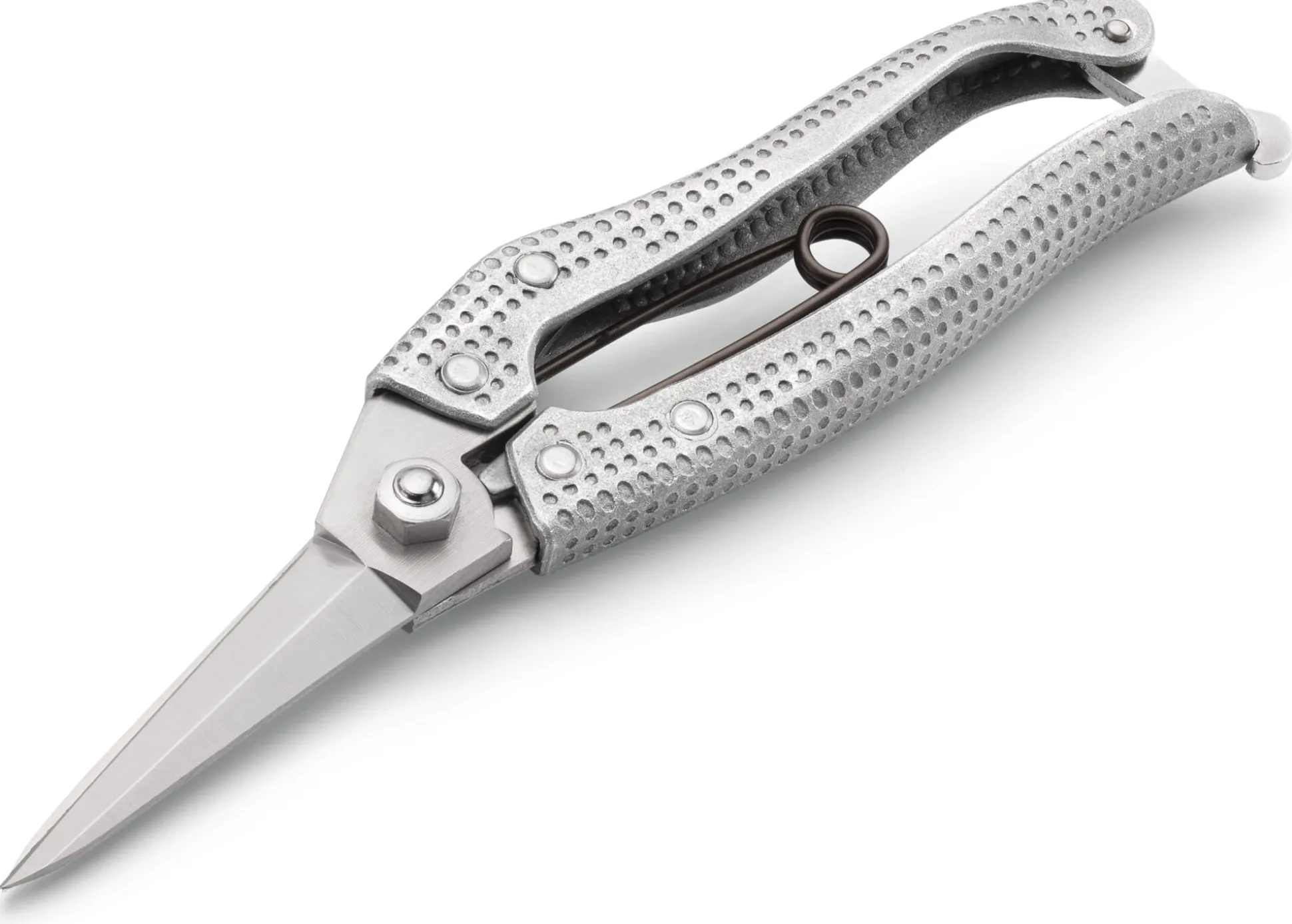 Scherenblätter Kohlenstoffstahl, Griffe Aluminium. Gefertigt in Japan. Blattlänge 6,5 cm, Gesamtlänge 22 cm. Gewicht 165 g.