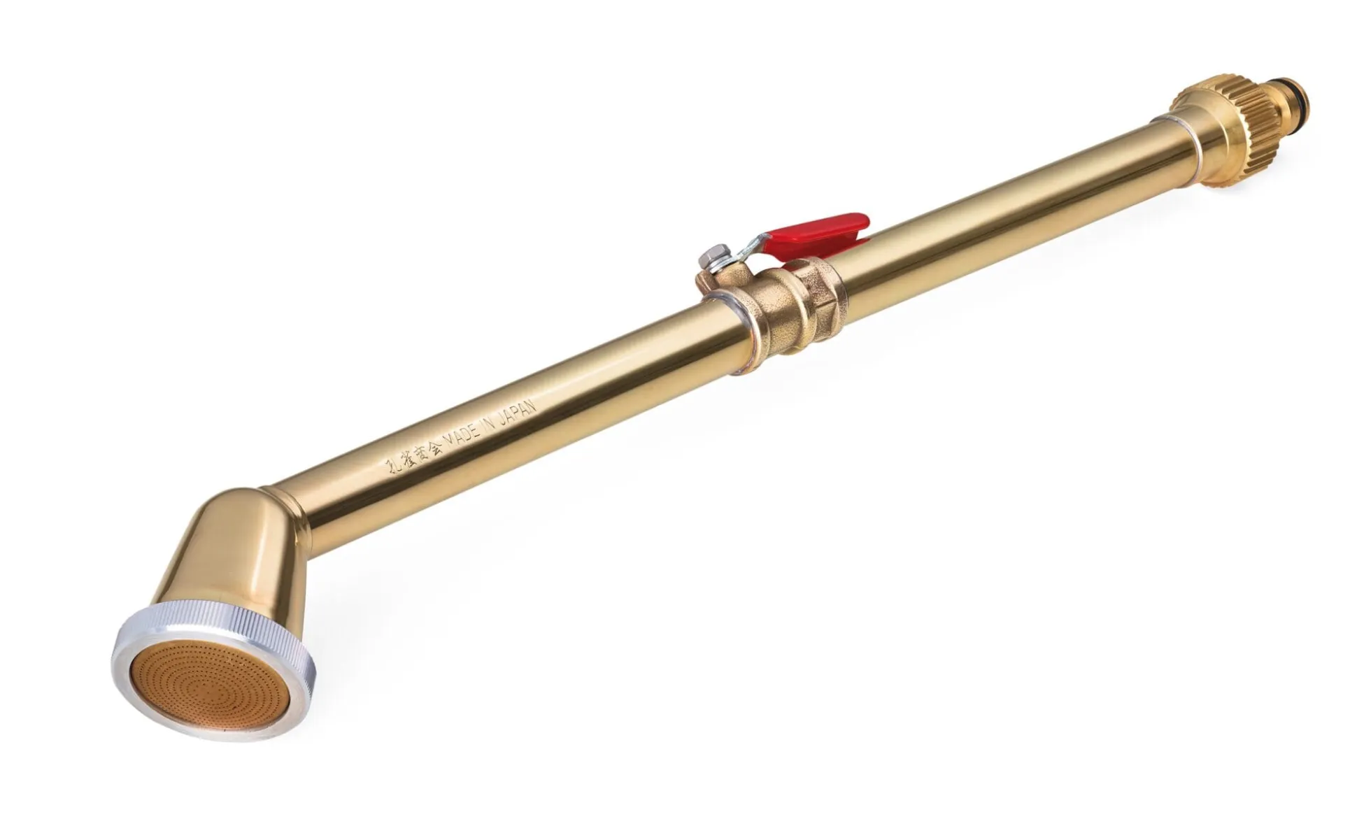 Gießrohr, Brausekopf und Anschlussstecker Messing, Hebel aus Stahl, Rändelmutter Aluminium. Hergestellt in Japan. Länge 43 cm, Brausekopf Ø 4,5 cm. Gewicht 300 g.