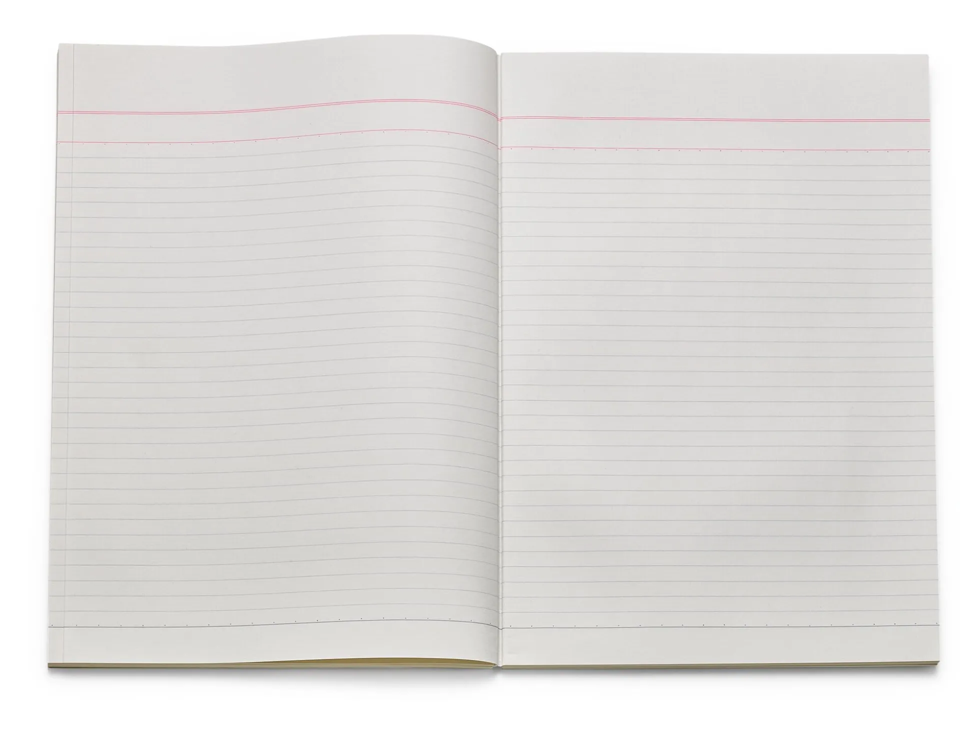 200 Seiten starkes Notizheft im A4-Format, mit 30,5 × 21 cm jedoch 8 mm höher als DIN A4. Es besteht aus 4 fadengehefteten Heften, die mittels des Kartoneinbandes und des Fälzelbandes fest miteinander verbunden sind. Glattes, zartweißes Naturpapier (85 g/qm), randabfallend liniert (Abstand 8 mm), mit einer Kopfzeile aus roten Linien. Kartonumschlag, schwarzer Fälzelstreifen mit einem quer über den Rücken laufenden Papieretikett, einem für japanische Schreibhefte typischen Detail. Aus Japan.