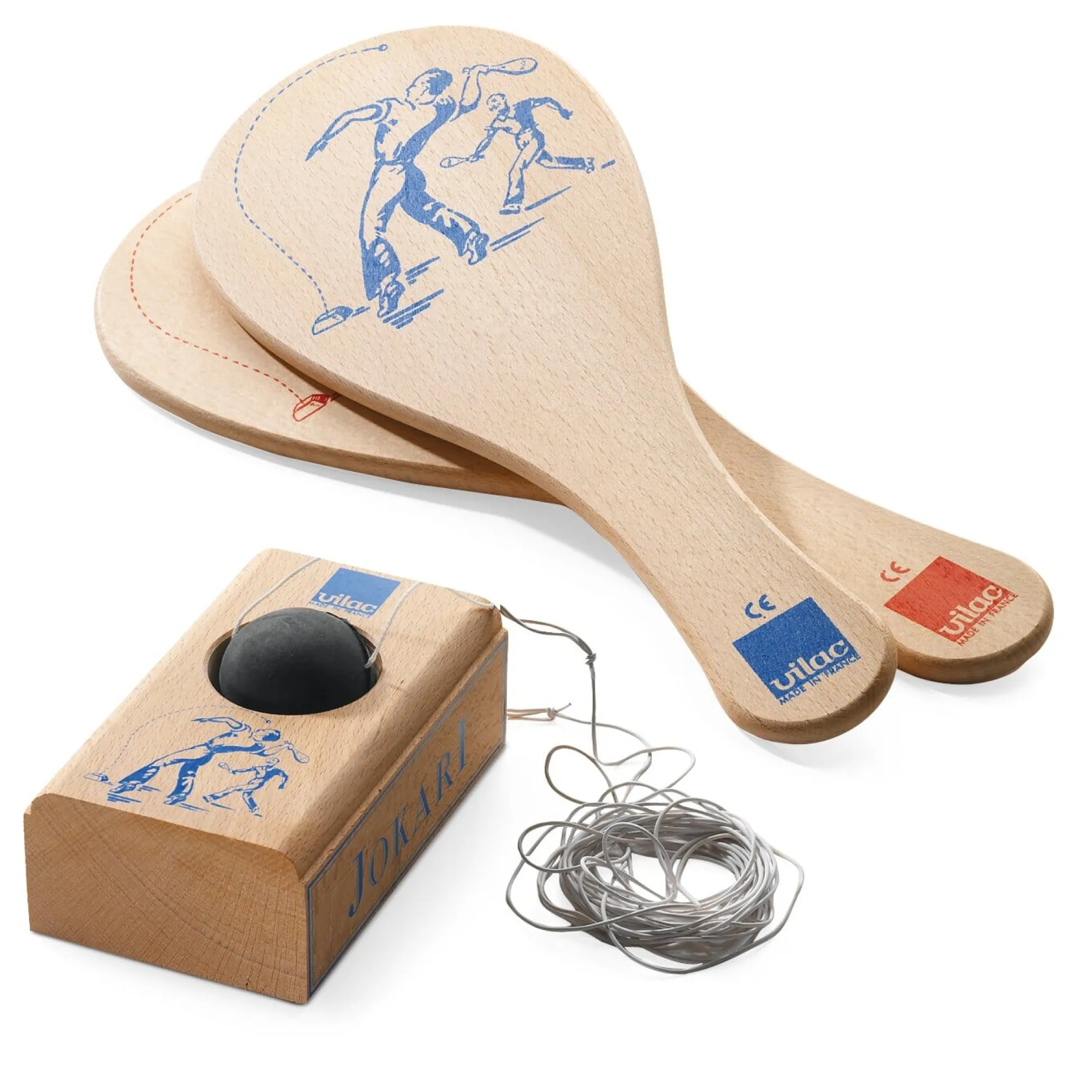 Für 1–2 Spieler*innen. Gefertigt in Frankreich. Schläger Buchenholz, Länge 28 cm. Gummiball Ø 42 mm. Basis aus Buchenholz, Höhe 5 cm, Breite 8,5 cm, Tiefe 14 cm. Gewicht 400 g.