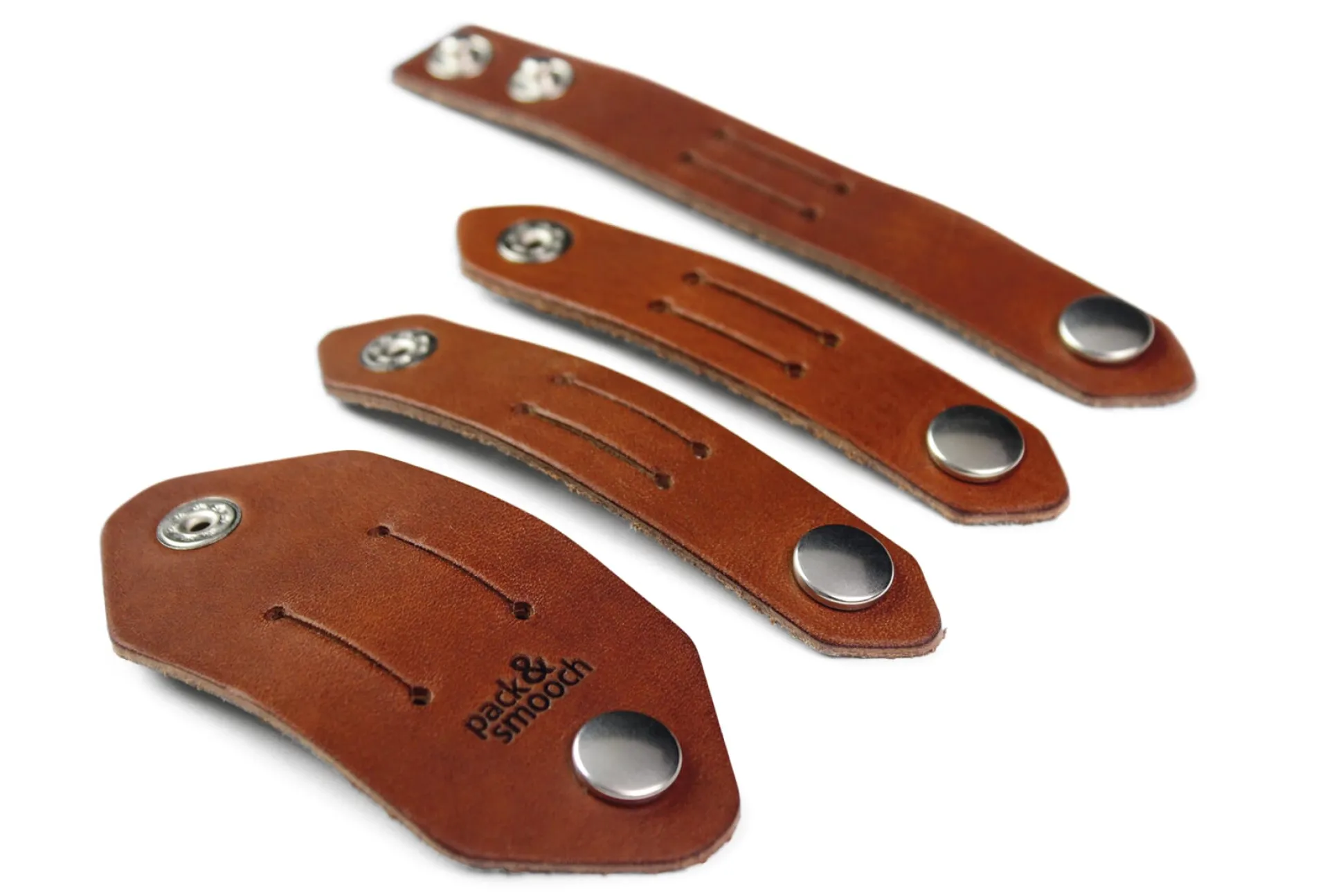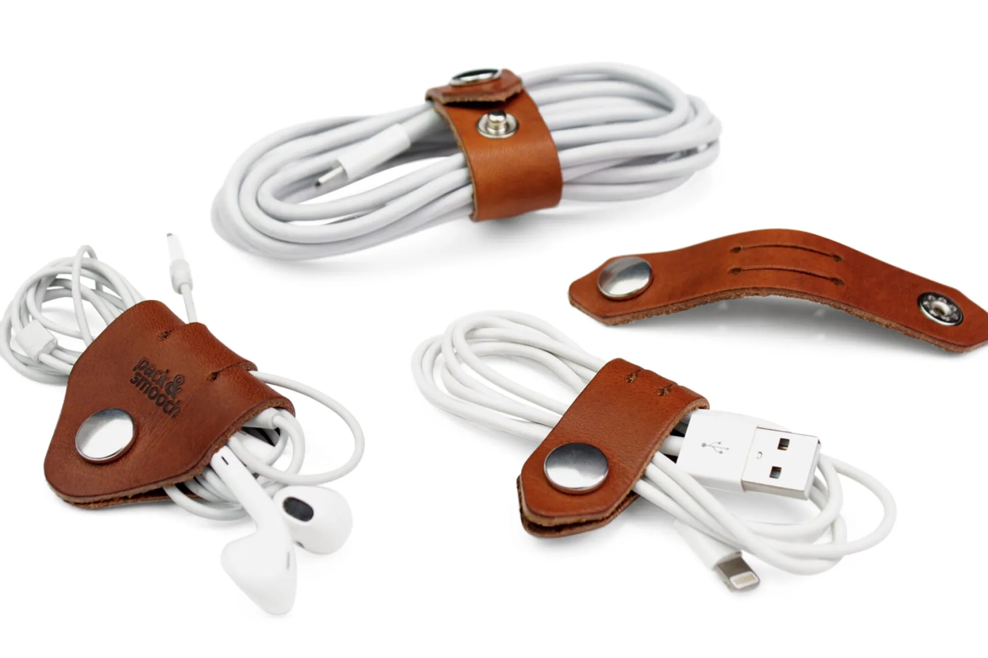 Vierteiliges Set von Kabelbindern aus naturfarbenem Leder: räumt auf mit Verknoten und Verheddern und nimmt verschiedenste Kabel sicher in den Griff. Dabei wird ein Kabelende durch zwei Schlitze des jeweiligen Lederbands geführt, um beim nächsten absehbaren Bedarf gleich wieder griffbereit zu sein.