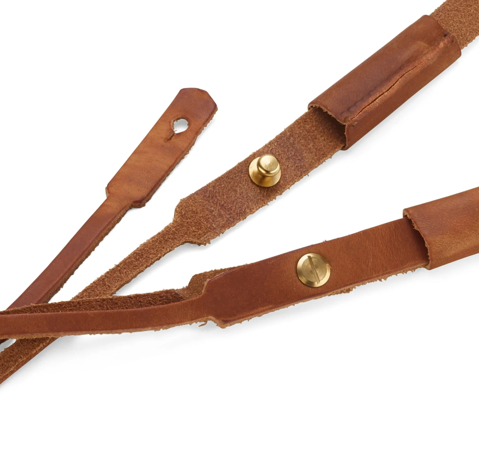 Altgrubengegerbtes Rindleder, wie man es früher zur Herstellung von Zaumzeug und Schirrung verwendet hat, begegnet Ihnen hier wieder. Die Riemen sind aus dem sogenannten Kernstück geschnitten, aus der Rückenpartie, wo die Lederfasern ihre feinste und zugleich dichteste Struktur aufweisen. Bei aller Robustheit bleibt das Material überaus biegsam und flexibel – besser geht es nicht für diesen Zweck. Der Hersteller unserer Kameragurte in Hamburg bezieht dieses Leder aus einer Gerberei in Norddeutschland. Ein Polster aus weichem Elchleder schont Nacken- sowie Schulterbereich und lässt die Kamera auch bei langem Tragen nicht zur Last werden. Zwei Möglichkeiten der Befestigung an der Kamera sind vorgesehen, abhängig vom Modell: mittels der Ringe aus Federstahl oder alternativ, indem die schmalen Enden der Riemen durch die am Kamerakörper vorgesehenen Ösen gezogen werden. Knopfniete aus Messing dienen dann dem Öffnen und Schließen der Schlaufen.