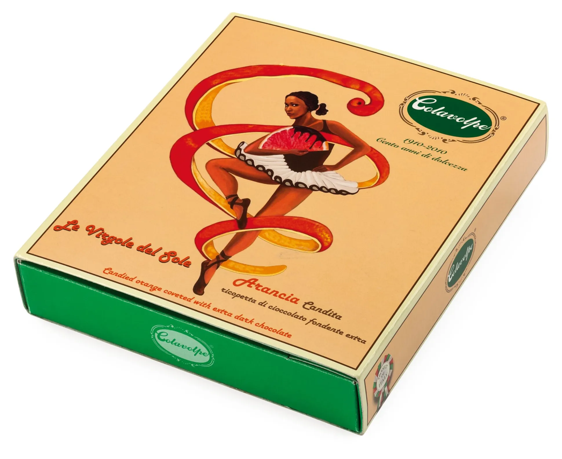 Colavolpe aus der kalabrischen Provinz Cosenza begann seinen Betrieb 1910 mit der Verarbeitung von Feigen, er versteht sich aber auch bestens auf die Herstellung kandierter Früchte in Schokolade. Von bemerkenswertem Wohlgeschmack sind seine mit 72-prozentiger, intensiver Bitterschokolade umhüllten Orangen- und Zitronenschalen-„Filets“. Die fingerlangen Stücke, die – bei Colavolpe selbstverständlich – von Früchten aus italienischer Landwirtschaft stammen, haben einen angenehm weichen Biss, und ihre fruchtigen ätherischen Öle harmonieren bestens mit den dunklen Kakaoaromen der sie umhüllenden Schokolade.