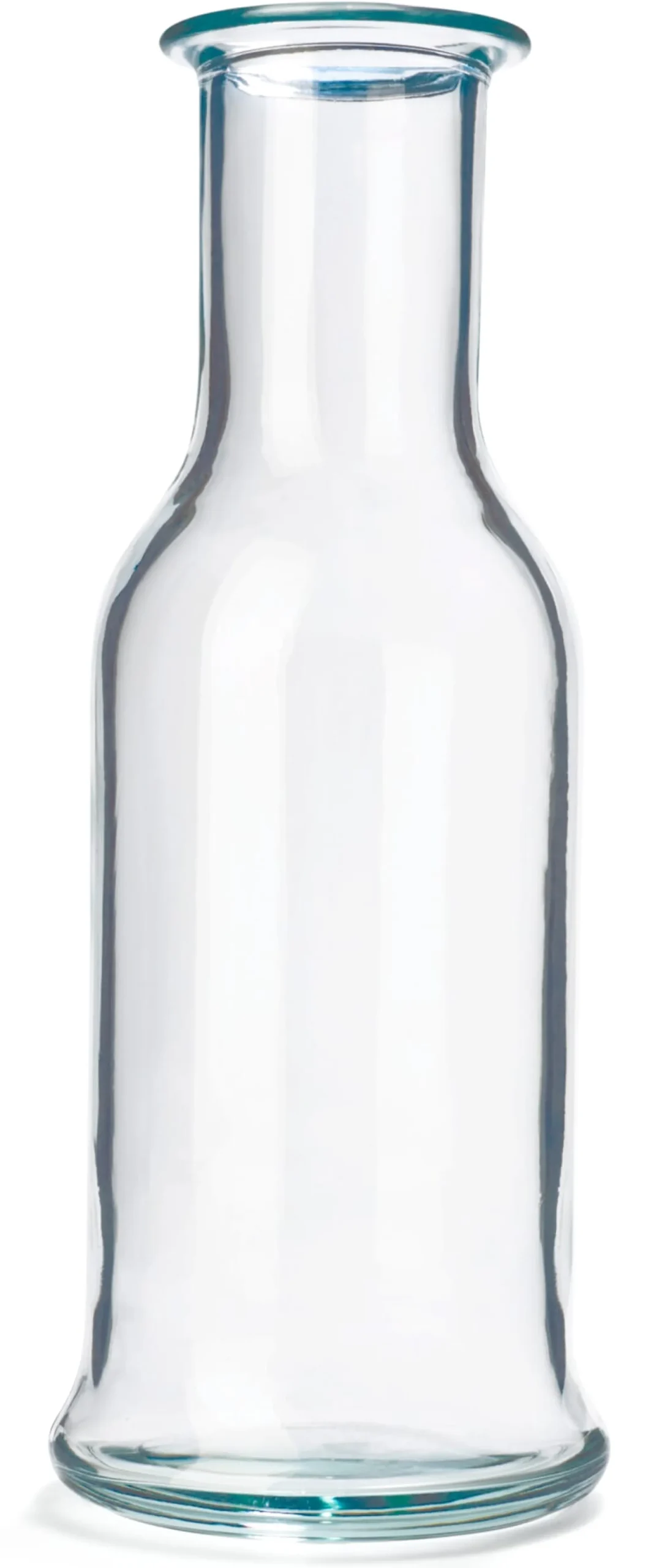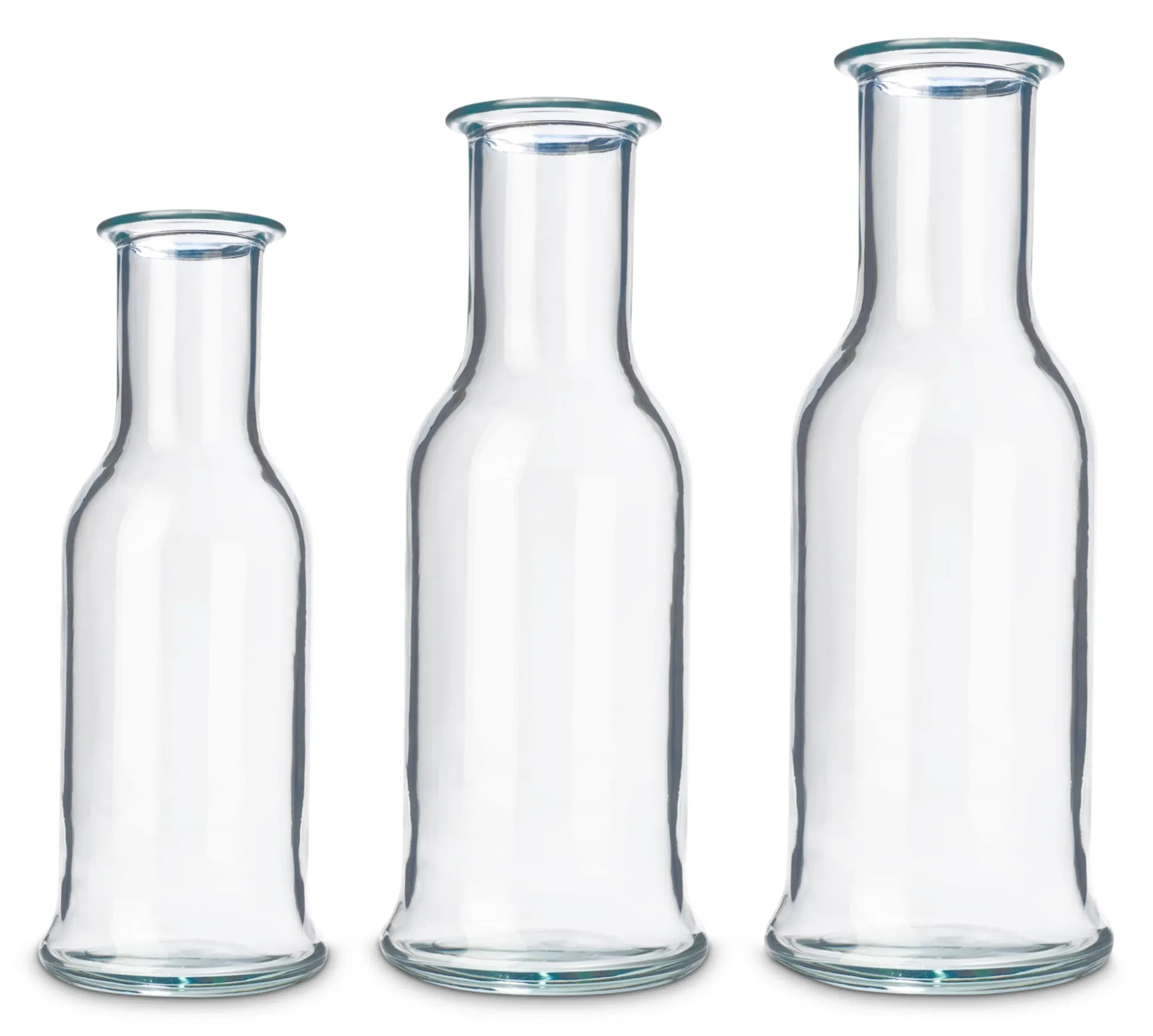 Serie von robusten archetypischen Glaskaraffen. Die an klassische Milchflaschen erinnernde Form lässt sich in all ihren verschiedenen Größen gut und sicher greifen und ausgießen. Dank dickem Boden steht sie standfest und sicher.