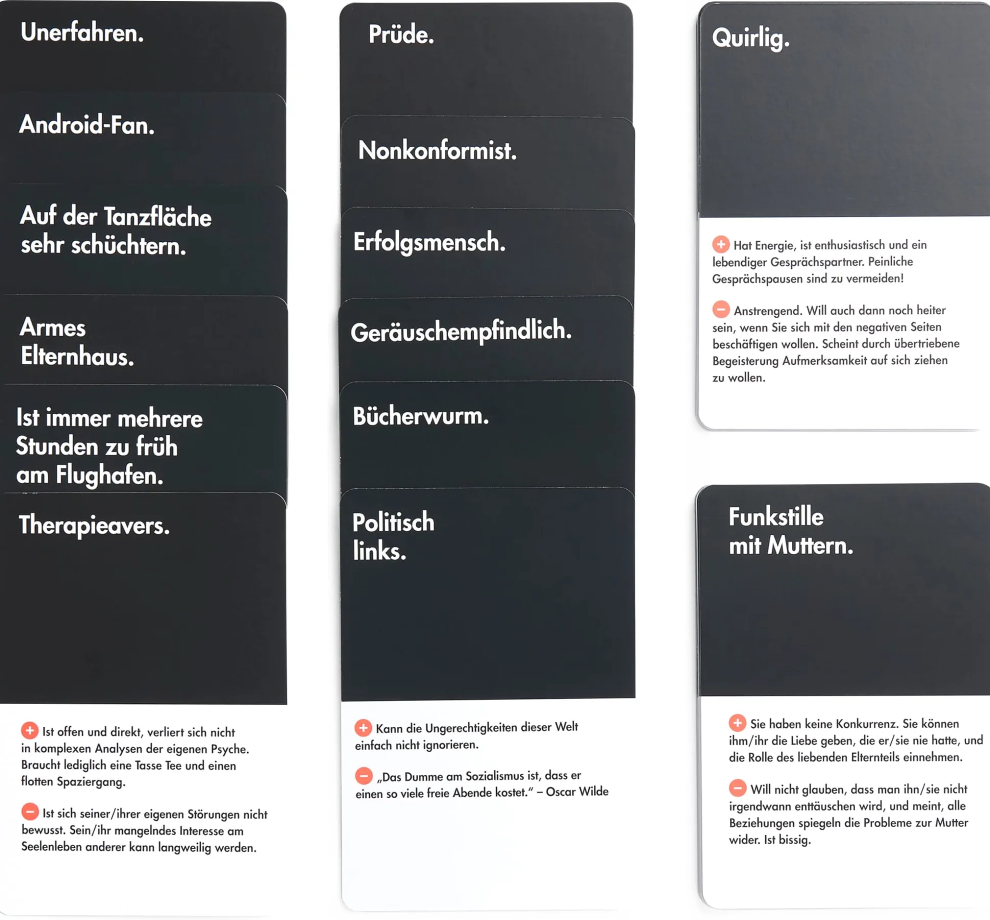 Wenn wir uns unseren idealen Partner ausmalen, haben wir oft anspruchsvolle und doch viel zu ungenaue Vorstellungen: So wünschen wir uns vielleicht einen Menschen, der „lebensfroh“, „nett“ oder „süß“ ist. Da man jedoch besser fündig wird, wenn man weiß, wonach man sucht, kann es hilfreich sein, seine Vorstellungen genauer zu definieren. Mit diesem Set aus 52 Karten können Sie die Eigenschaften Ihres idealen Partners besser eingrenzen. Die auf den einzelnen Karten beschriebenen Angewohnheiten und Eigenschaften bringen einen zum Nachdenken darüber, was einem wirklich wichtig ist und womit man sich notfalls abfinden könnte. Kurzum: Dieses Karten-Set von The School of Life führt mit Realitätsnähe, Einsicht und Witz auf den Weg zu besseren Beziehungen.