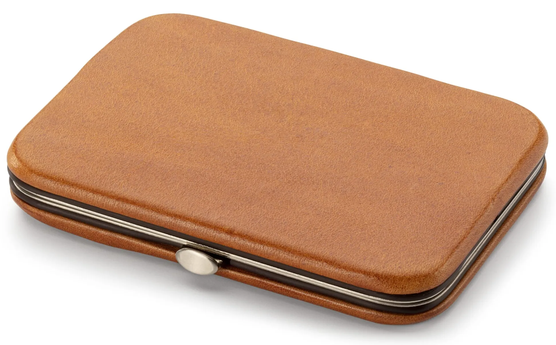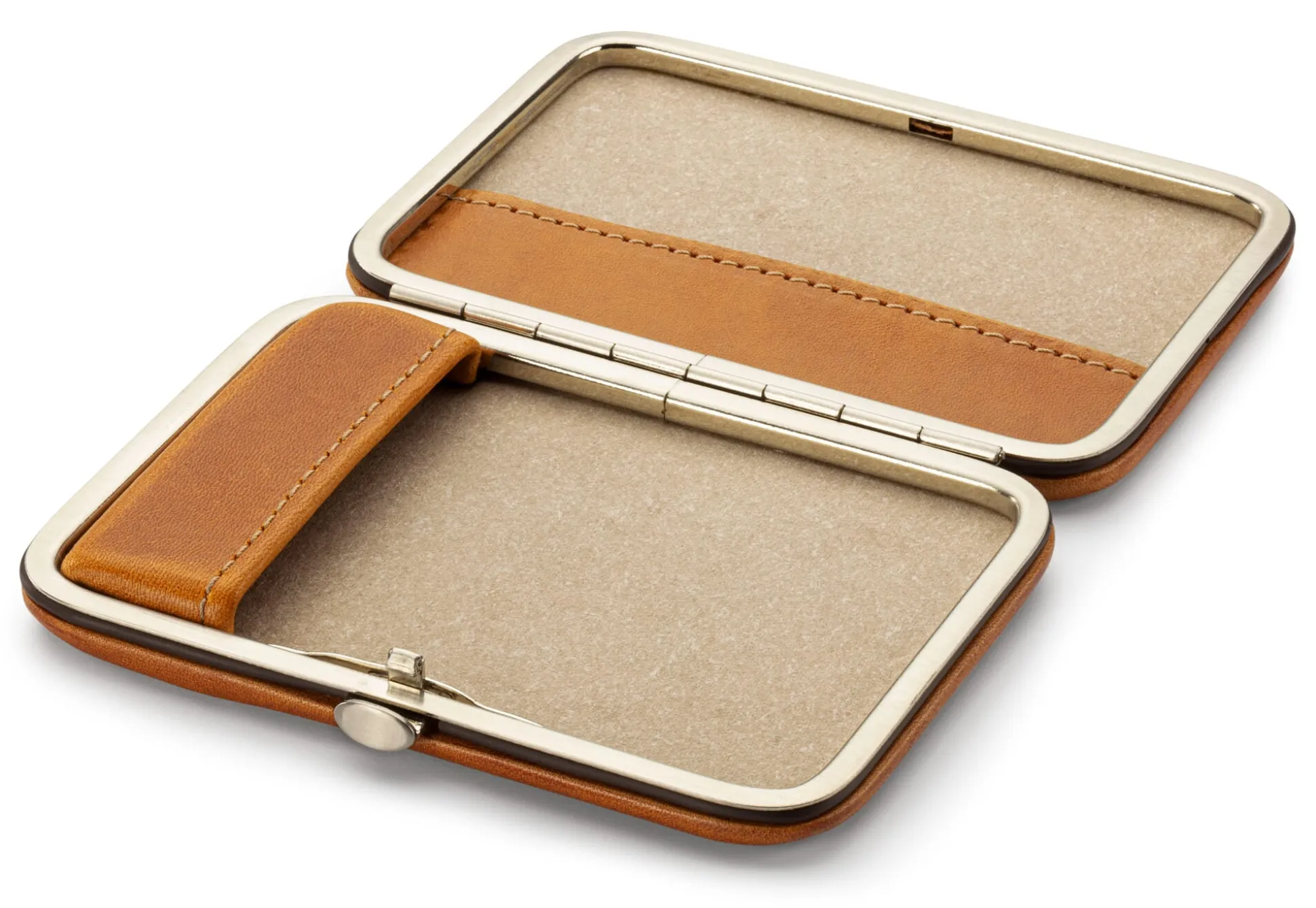 Dieses kleine, aber feine Etui aus schmiegsamem, vegetabil gegerbtem Rindleder bietet Platz für Visitenkarten oder für bis zu sieben Zigaretten. Personalausweis und Führerschein im Kartenformat passen ebenfalls hinein, zum Beispiel in das kleine Steckfach im Deckel, wo sie stramm und sicher gehalten werden. Der vernickelte Stahlrahmen bietet dabei die nötige Stabilität, sodass unterwegs nichts zerdrückt werden kann. Für das (ungepolsterte) Futter wird widerstandsfähiges Lefa (Lederfaserstoff) verwendet, ein ressourcenschonend aus Lederresten und Naturlatex hergestelltes Material.