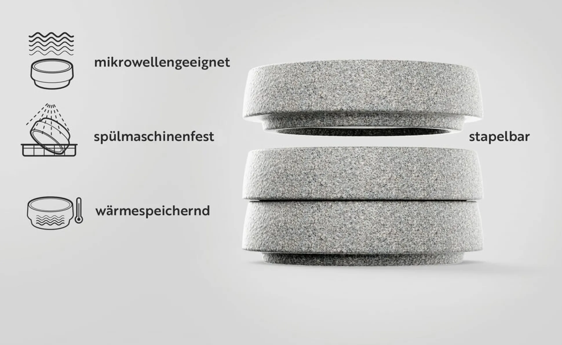 Über die unterschiedlichen Bedürfnisse und Verhaltensweisen von Hund und Katze haben sich die in Coburg ansässigen Keramischen Werkstätten Denk – nomen est omen – viele Gedanken gemacht und schließlich diese Futternäpfe in unterschiedlichen Ausführungen entwickelt. Allen Näpfen gemeinsam ist das Material: Granicium®, eine spezielle Form der Granitkeramik. Der Granit stammt aus deutschen Mittelgebirgen; unter Zugabe von Quellwasser, Effektiven Mikroorganismen (EM) und Milchsäurekulturen wird das Gesteinsmehl zu Ton verarbeitet.