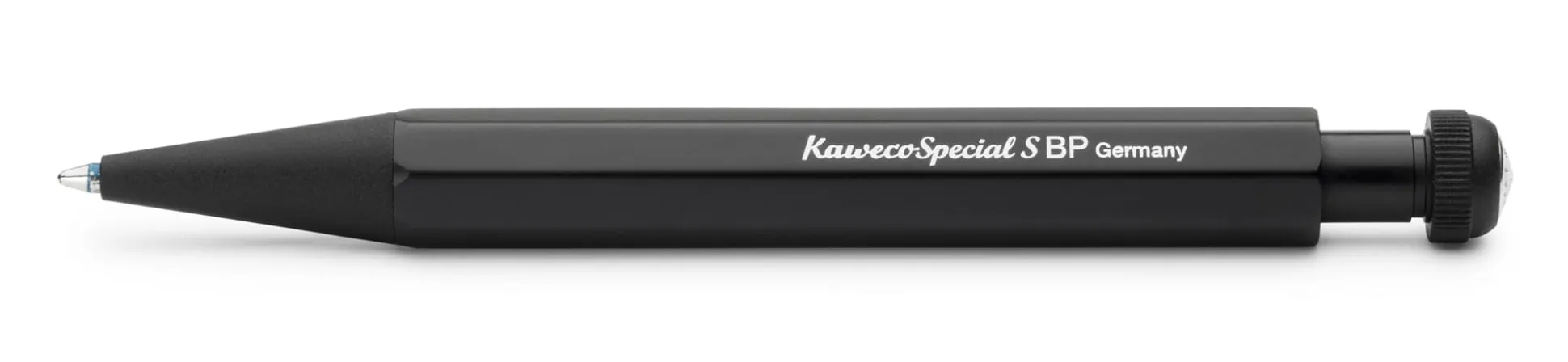 Kugelschreiber mit Druckmechanik. Achtkant-Gehäuse, Kopfstück und Drücker aus schwarz eloxiertem Aluminium.