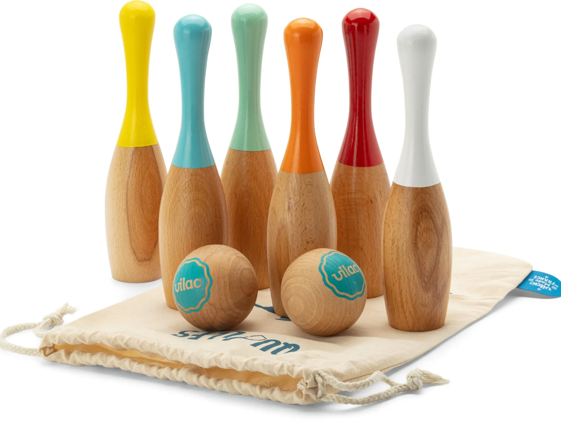 Anlauf, Wurf und – alle neune! Na gut, wir korrigieren uns: In diesem Spiel fallen nicht maximal neun, sondern sechs Kegel, denn es handelt sich hier ja um eine Freizeit- und keine Sportkegelausführung. Sehr robust ist dieses Kegelspiel dennoch: In einer traditionsreichen französischen Dreherei aus dem festen, vollen Holz der Buche gedrechselt, beweisen die Kegel und Kugeln den charakteristischen Langmut des Naturmaterials. So können Sie leidenschaftlich in die Vollen gehen (im ersten Durchgang auf alle Kegel zielen) oder hartnäckig abräumen (in weiteren Anläufen die stehen gebliebenen Kegel zu treffen versuchen), ohne sich um das Wohl der Spielelemente sorgen zu müssen.